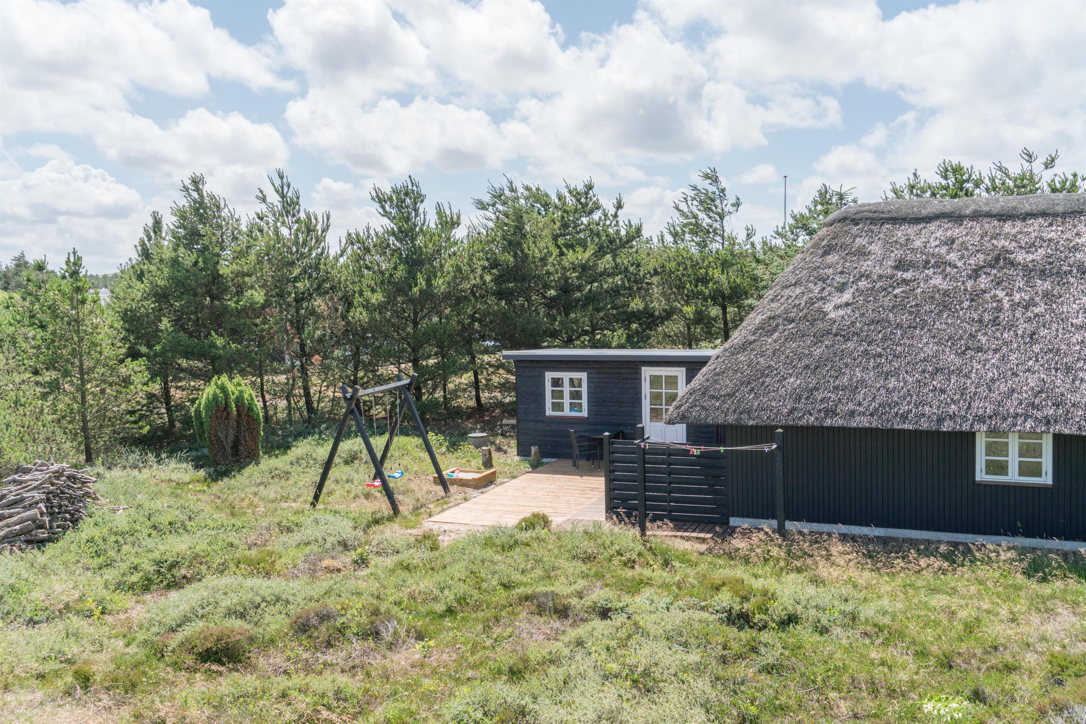 Mindre og meget charmerende stråtækt feriehus beliggende på en ugeneret, lyngklædt grund helt ud til fredet hede. Huset er løbende blevet total moderniseret, bl.a. med nye gulve, nymalede vægge og lofter. Alt fremstår nu lyst og indbydende og hvor rammerne er skabt for en dejlig minderig ferie. Fra stuen er der direkte udgang til delvis overdækket, fuldstændig ugeneret træterrasse. Ydermere er der terrasse mod syd/øst. Badeværelse med bruseniche og rummelig sauna. Depot rum til opbevaring. Et feriehus som er ideel for den lille familie.