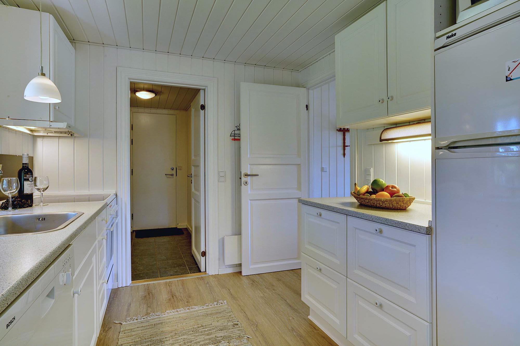 Det åbne køkken er praktisk og moderne med opvaskemaskine, rigeligt arbejdsområde og alt, hvad du behøver. Den tilstødende spiseplads indbyder til fælles måltider, spil eller en afslappet start på dagen.