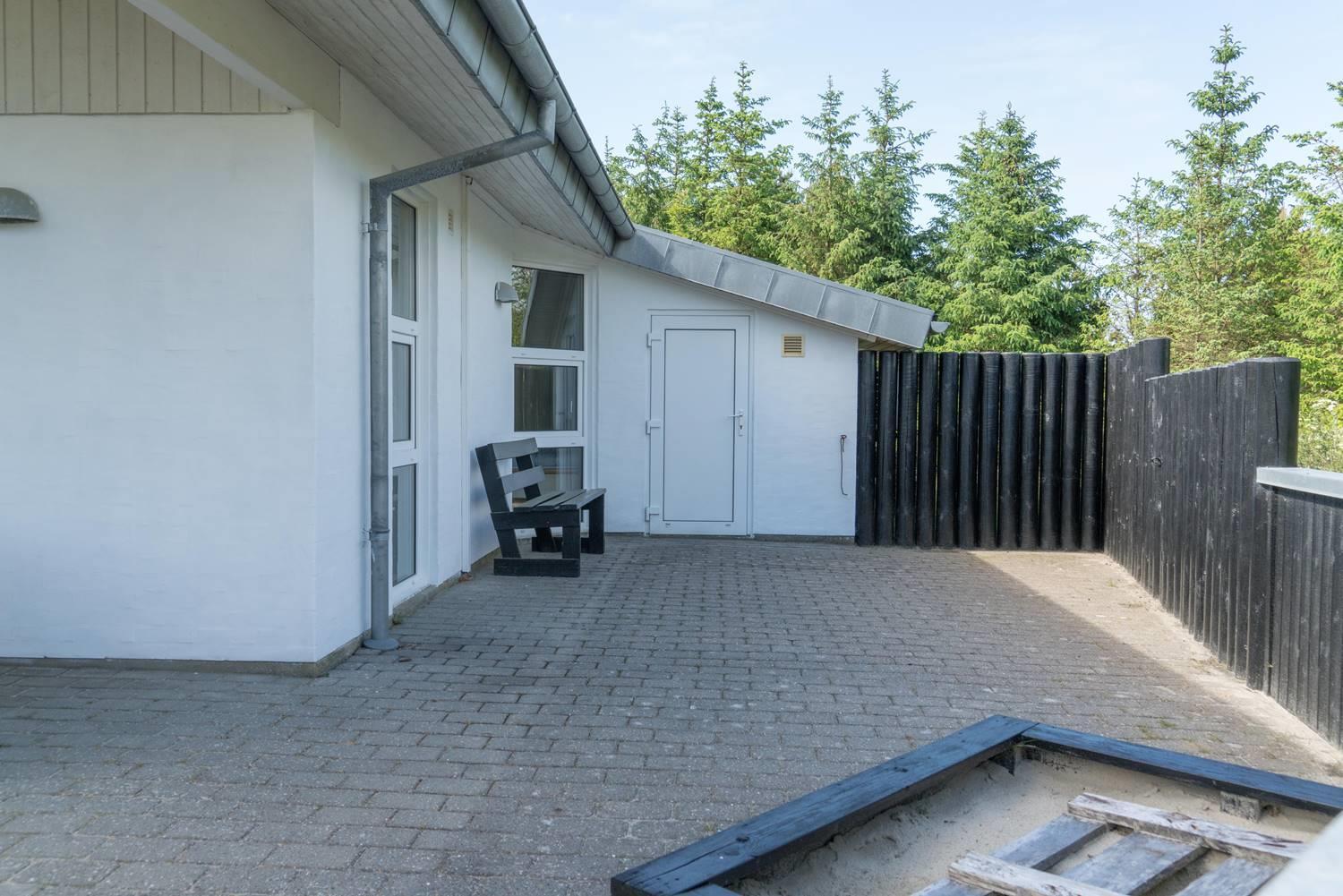 Også udendørs byder sommerhuset på skønne rammer for ferien. Den overdækkede terrasse giver mulighed for at nyde morgenmaden i læ, grille eller slappe af sidst på dagen. Børnene kan lege på gyngen og i sandkassen, og bilen parkeres sikkert i carporten.
