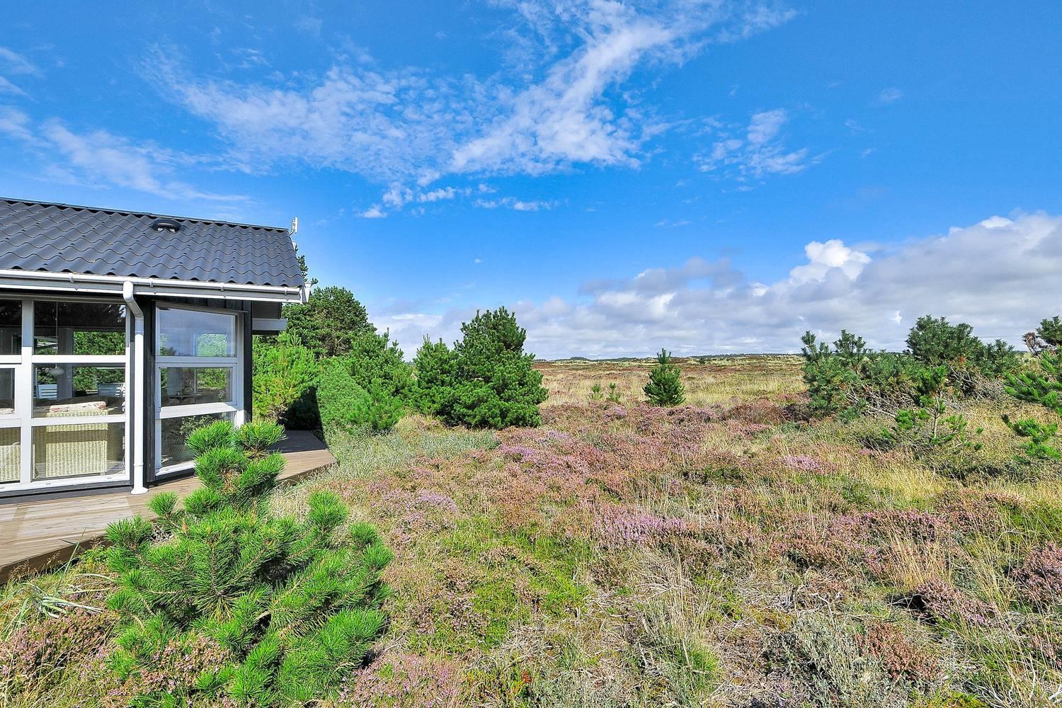 Feriehus på klitgrund med ugenert terrasse og udsigt til fredet hedeområde nær Henne Strand.