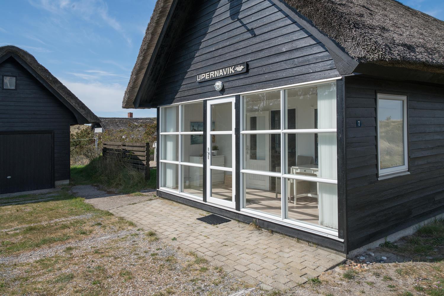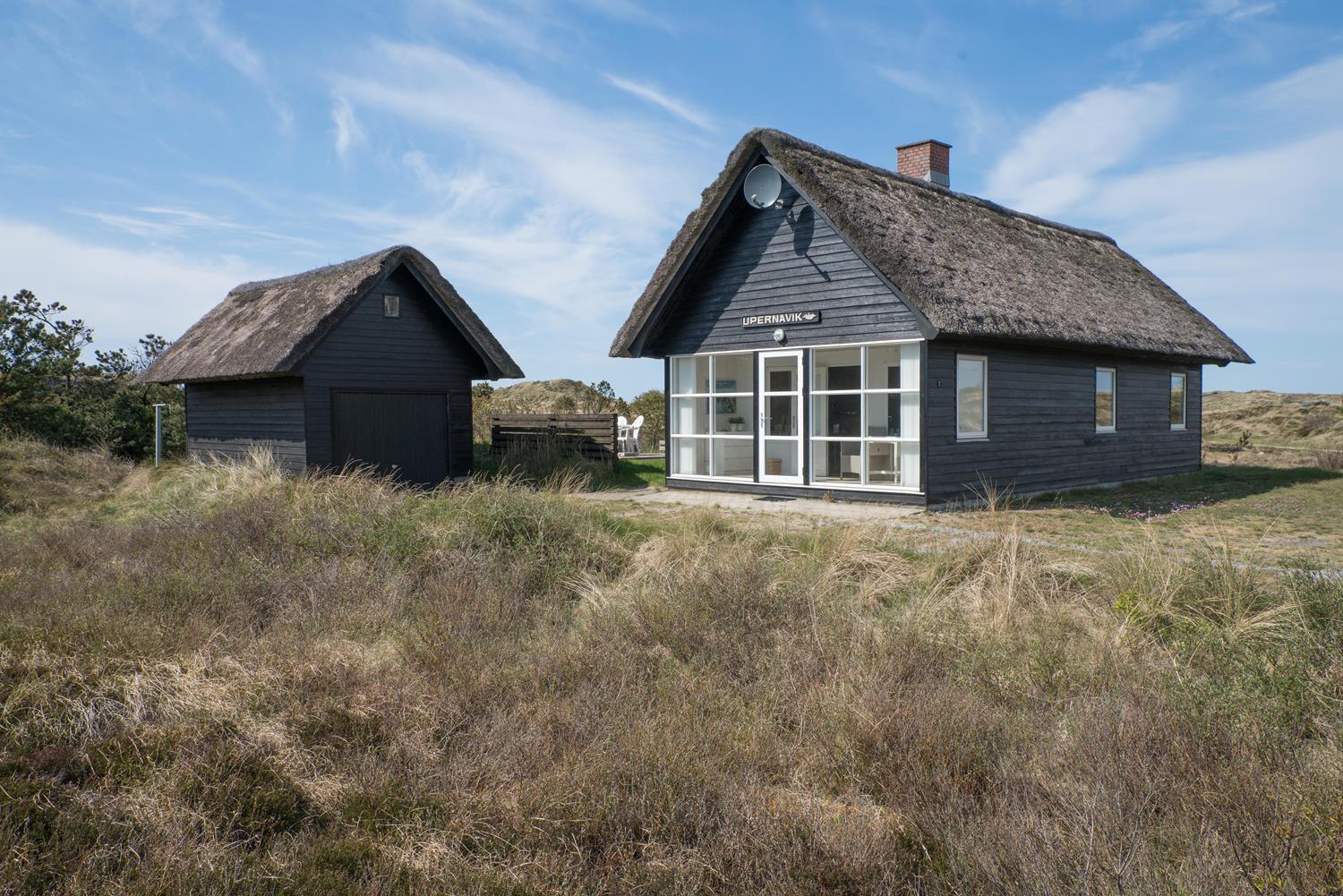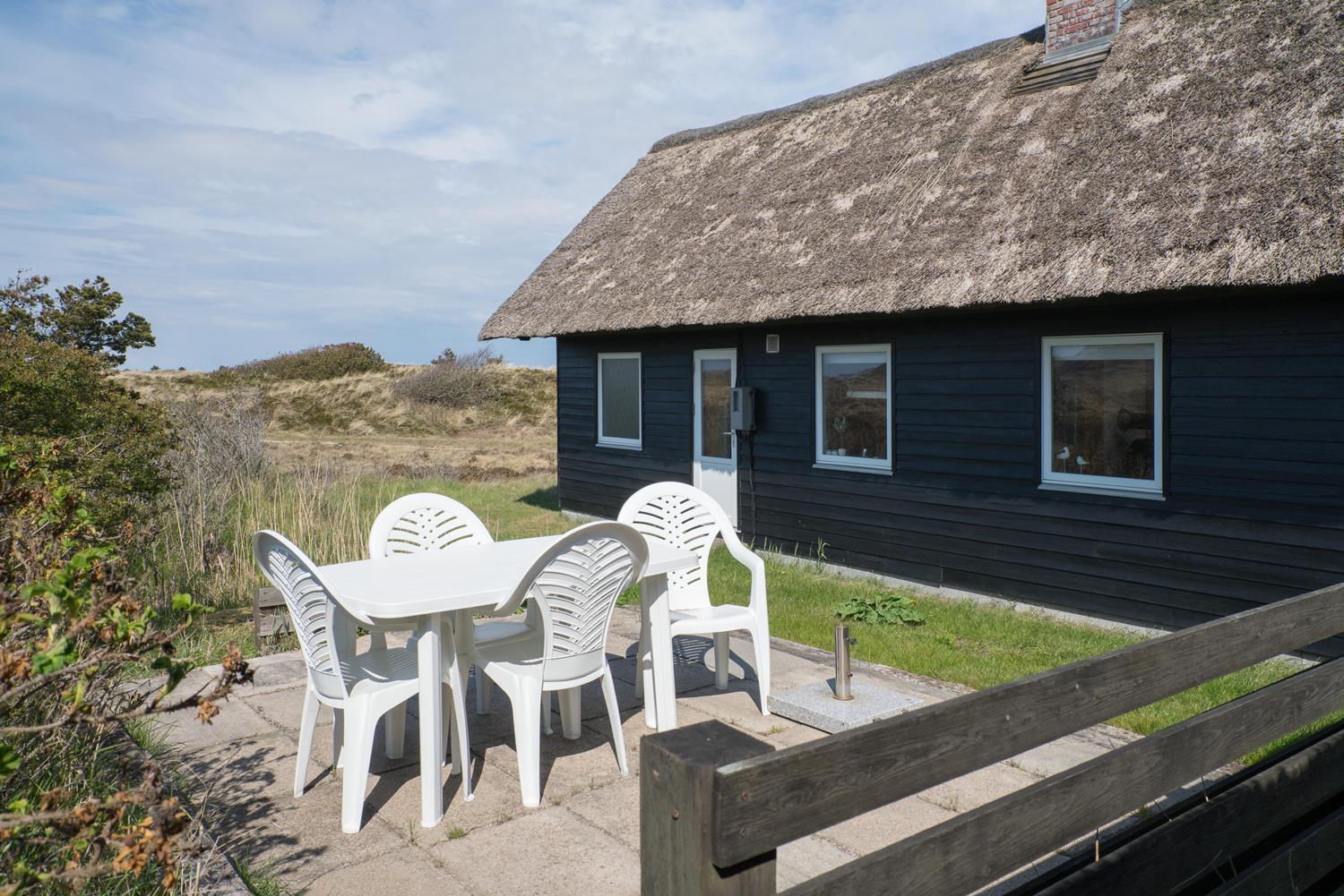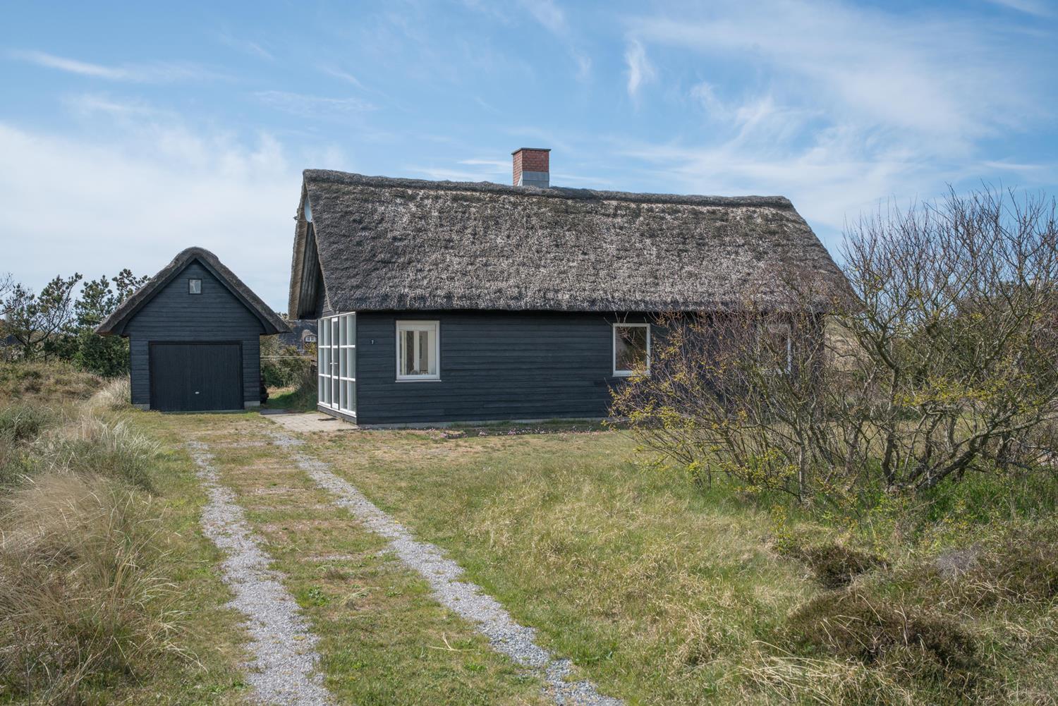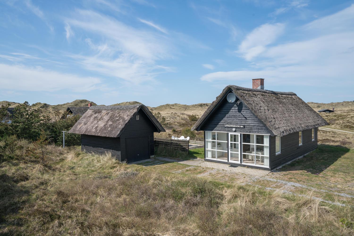 Hyggeligt stråtækt feriehus nær Henne Strand med garage, udestue og brændeovn på lyngklædt grund ved fredet hede.