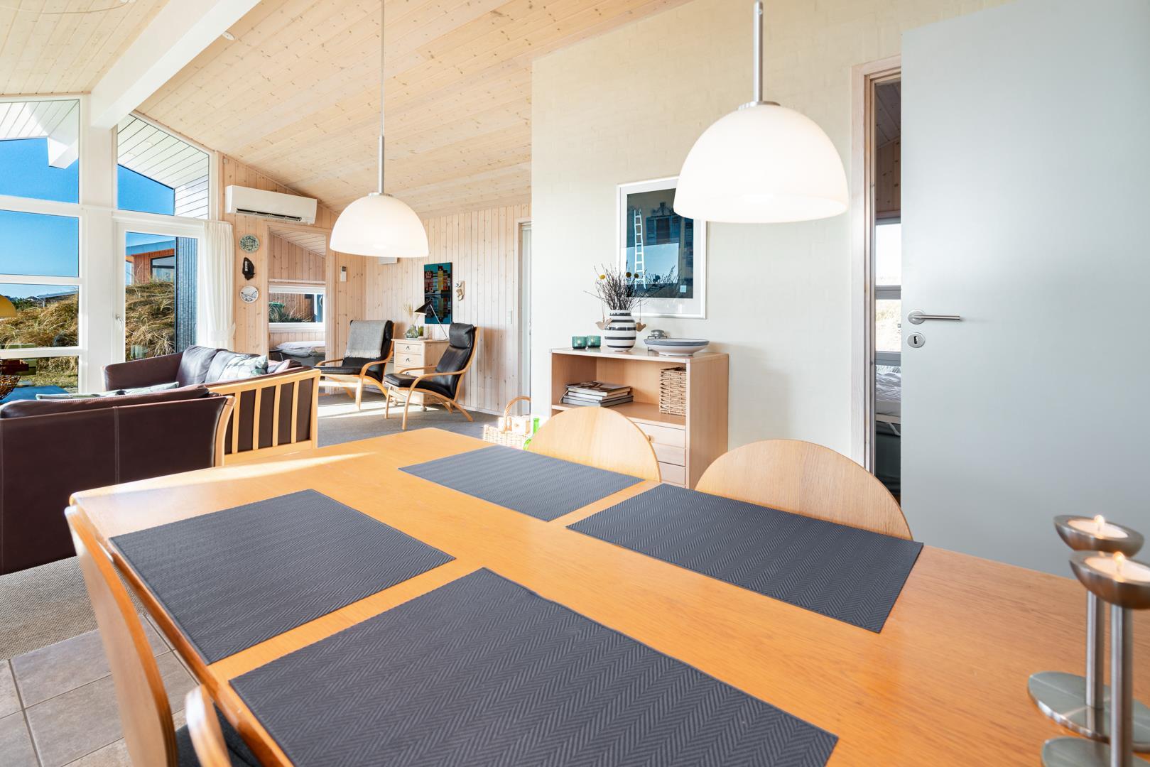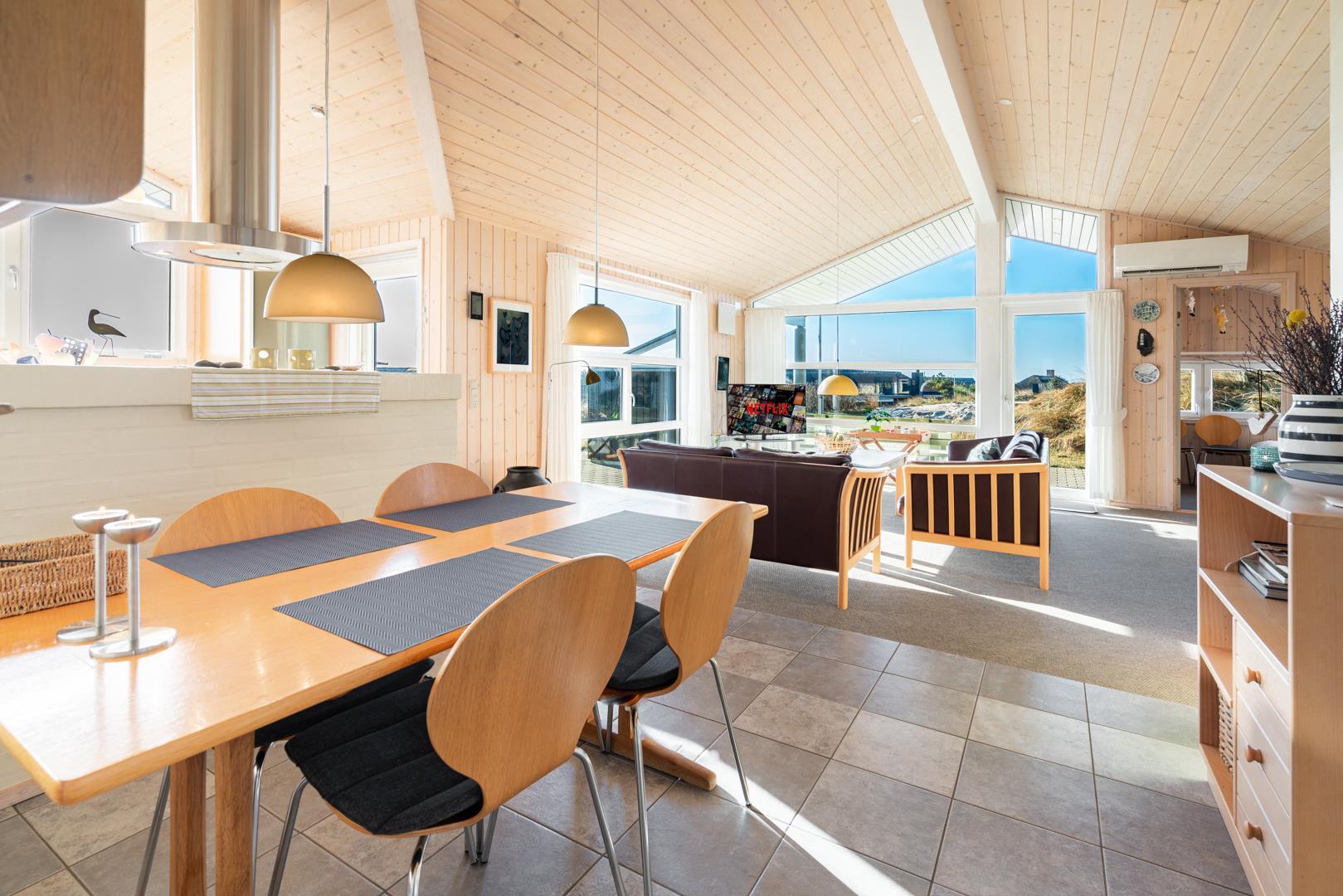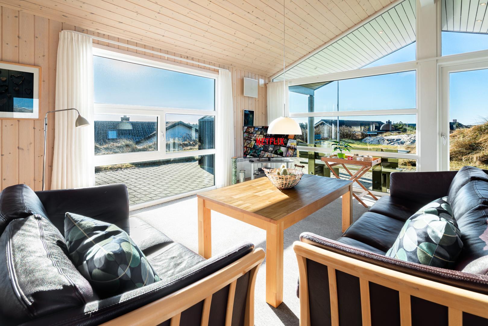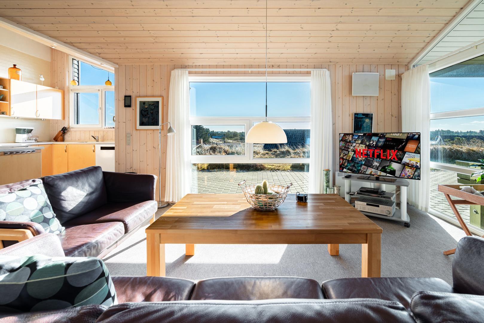 Dette højtbeliggende og meget indbydende sommerhus Høgevej 25 i Henne Strand byder på en enestående udsigt over både Lyngbos Hede og den smukke Blåbjerg Plantage.