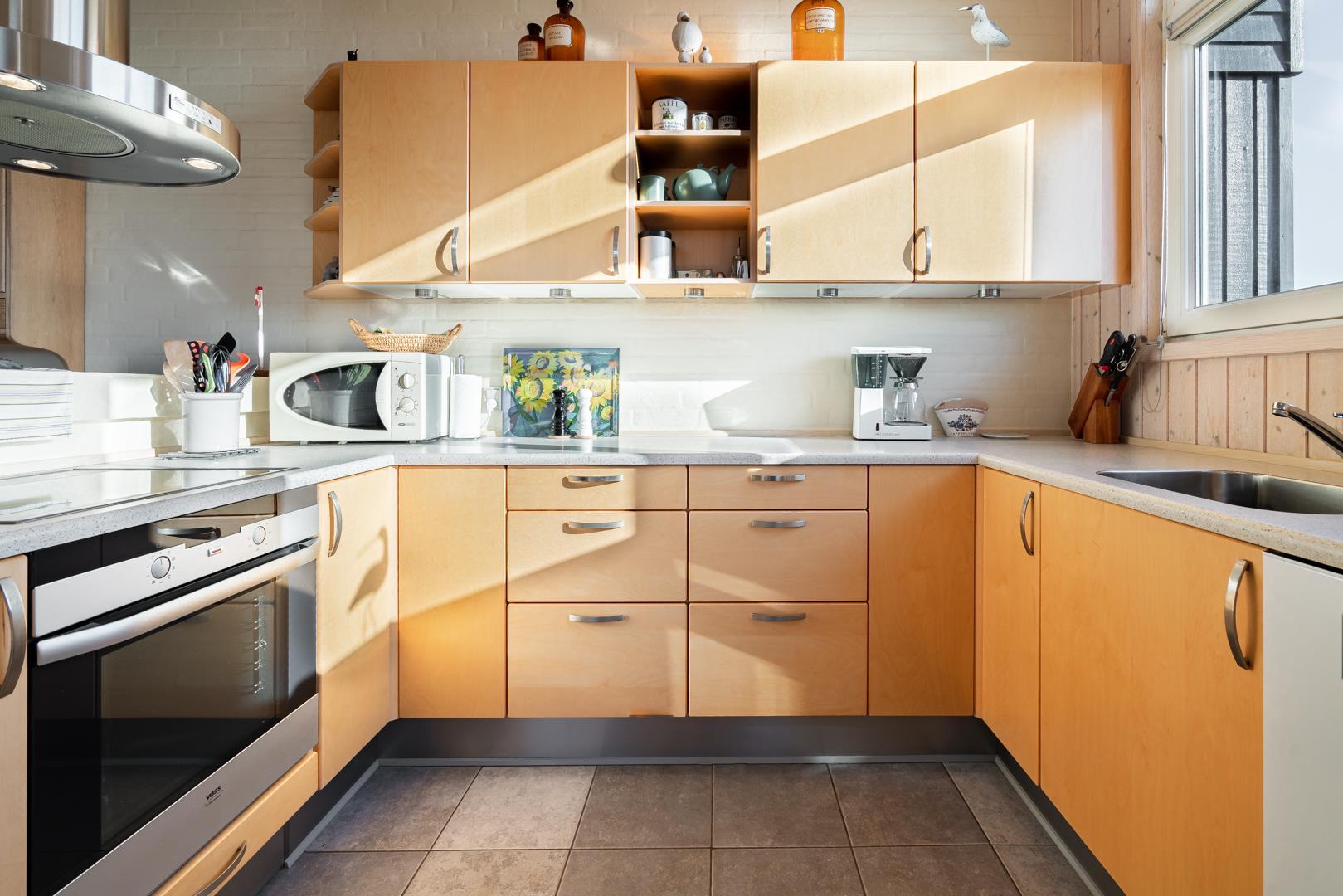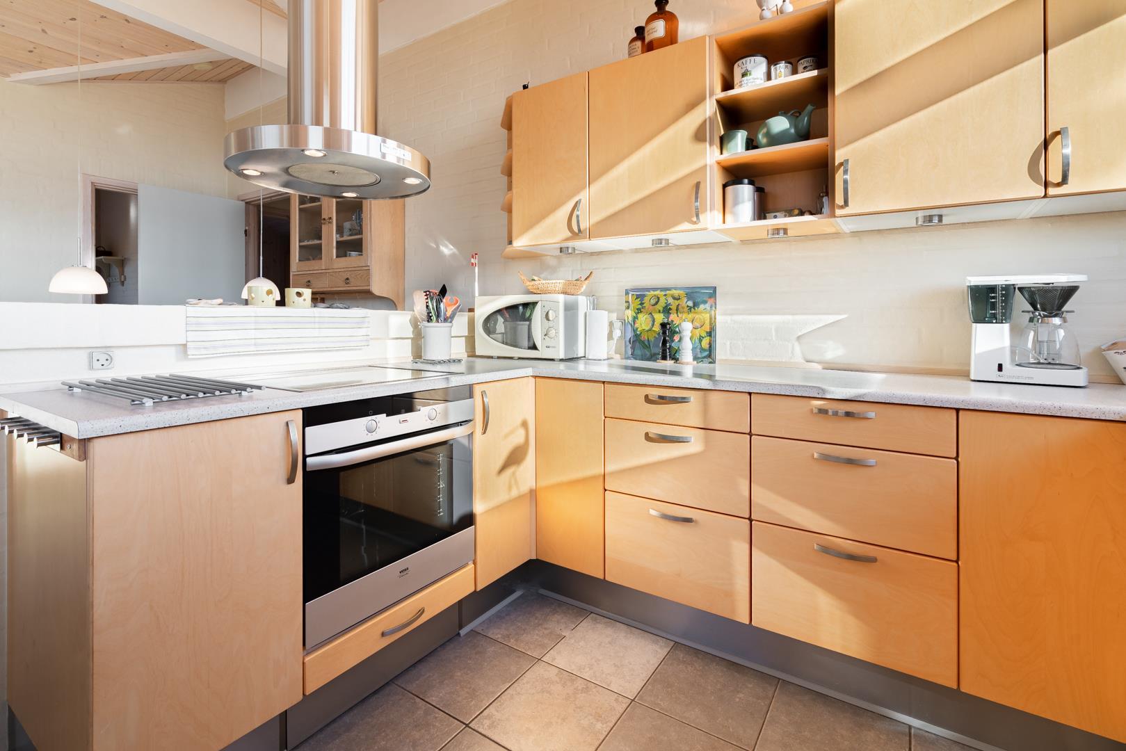 Køkkenet ligger i åben forbindelse med den smagfuldt indrettede stue, hvor brændeovnen og store vinduespartier skaber en varm og lys atmosfære. Herfra er der direkte udgang til en stor og delvist overdækket terrasse med fantastisk udsigt – perfekt til morgenkaffen, grillmiddage og solnedgange i det fri.