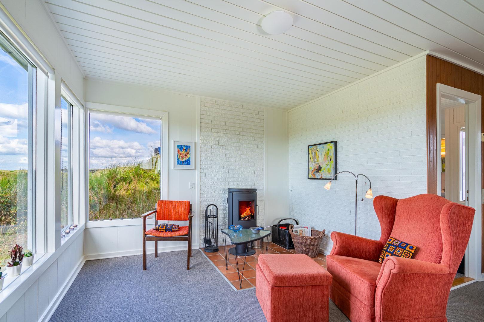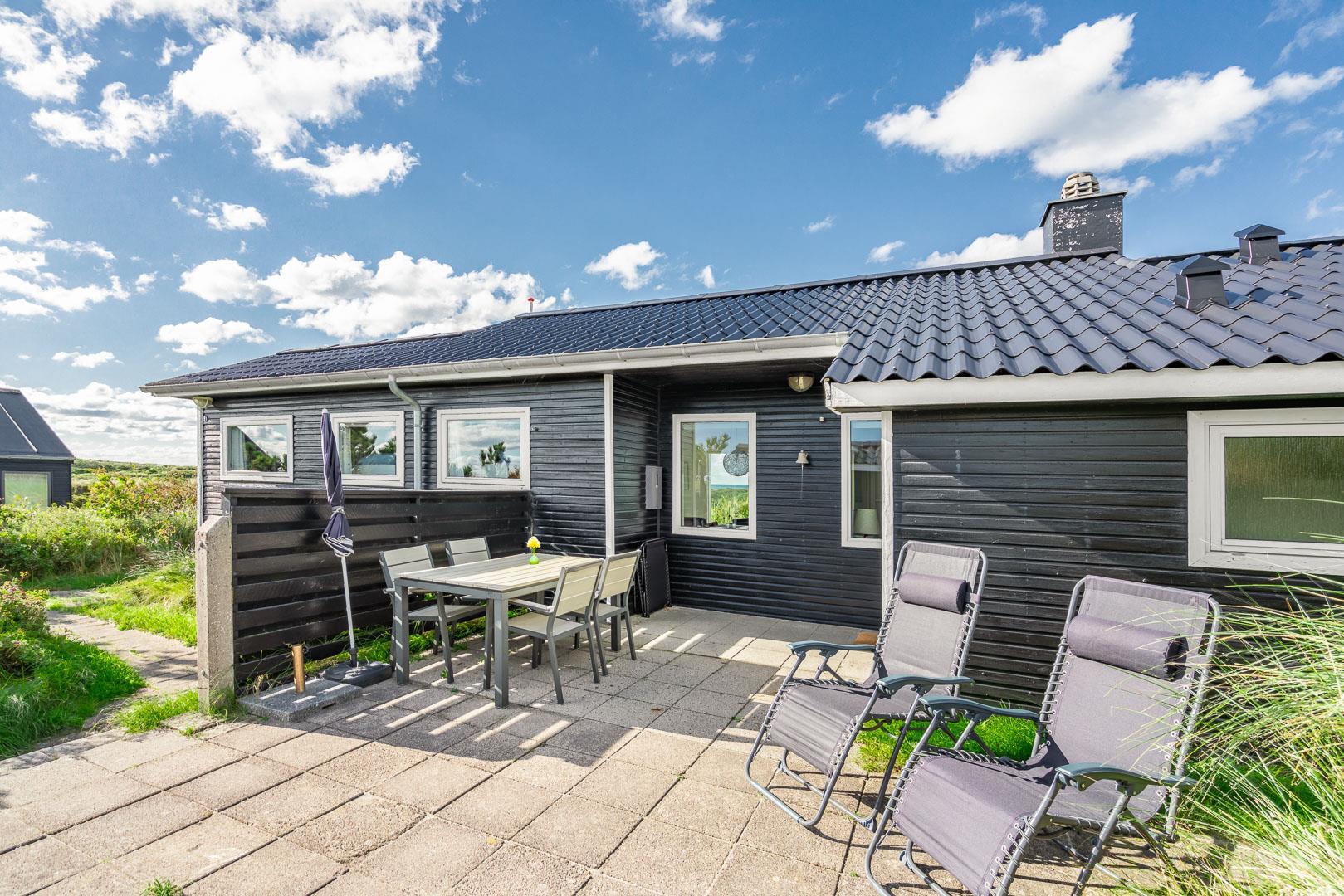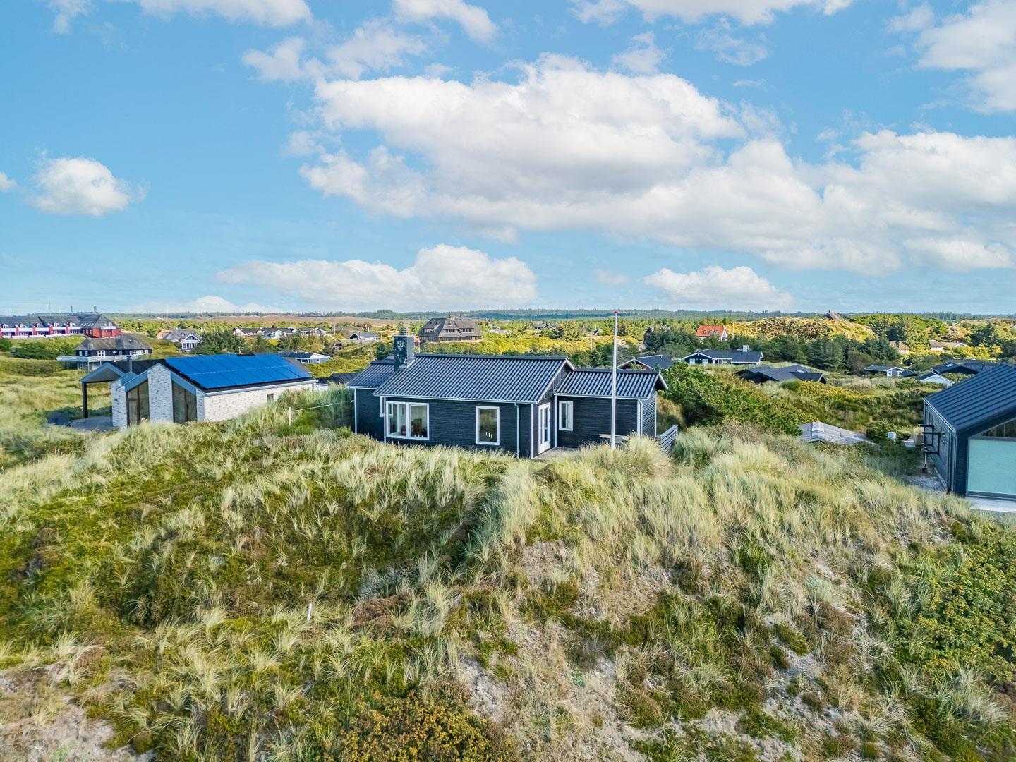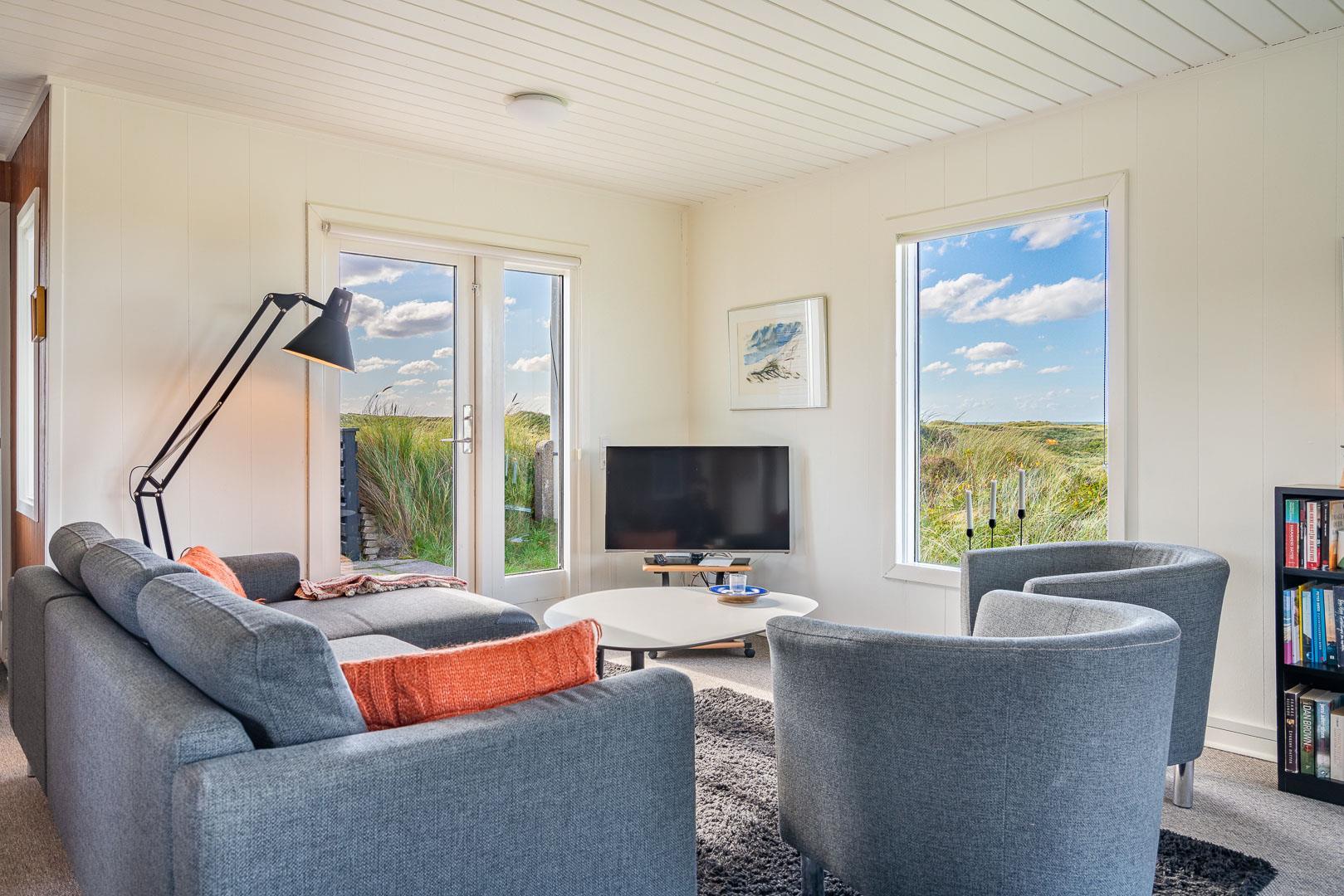 Charmerende feriehus med havudsigt beliggende på en pragtfuld og højtliggende klitgrund i forreste klitrække ved Henne Strand. Huset er løbende blevet moderniseret så alt fremstår lyst og venligt. Hyggelig stue som er indrettet med god stil og gode møbler. Stuen har store vinduer, så udsigten til havet og det pragtfulde klitlandskab kan nydes i fulde drag. Et soverum med gode enkeltsenge og skabe. Veludstyret køkken med opvaskemaskine og mikroovn. Der er også fra køkkenvinduet flot udsigt over klitlandskabet. Badeværelse med bruser, separat toilet. Der er flere dejlige og helt ugenerede terrasser omkring huset. Et fantastisk og super hyggeligt feriehus til 2 personer. Depotrum på terrassen er privat.