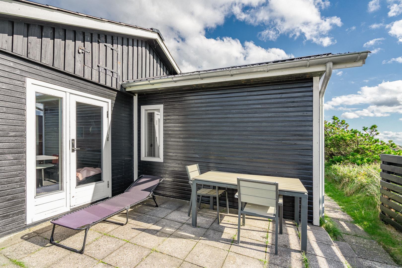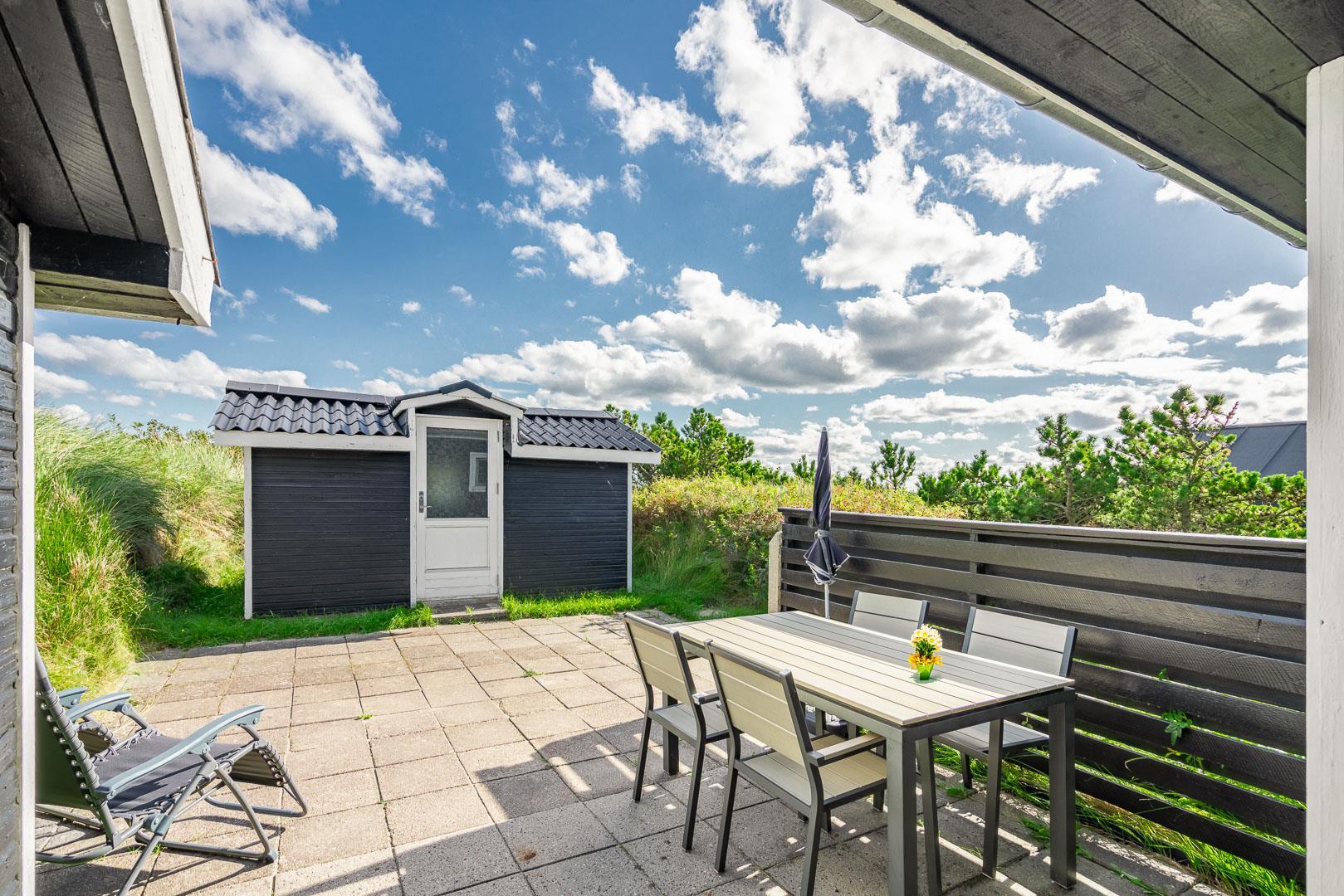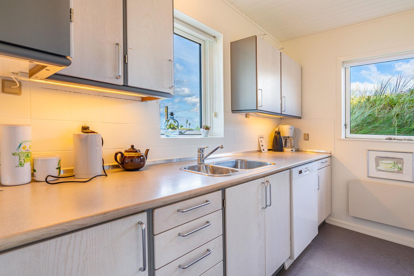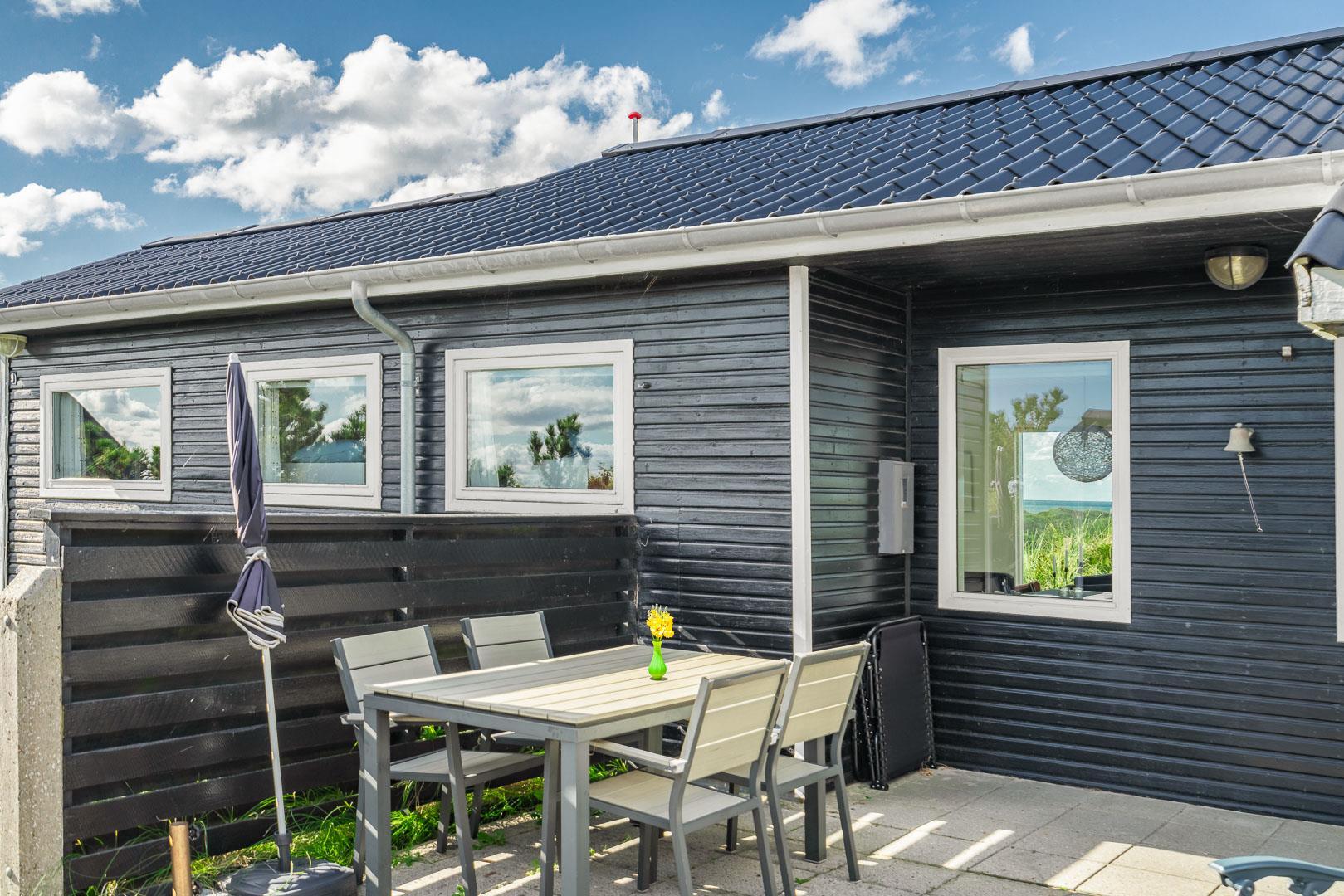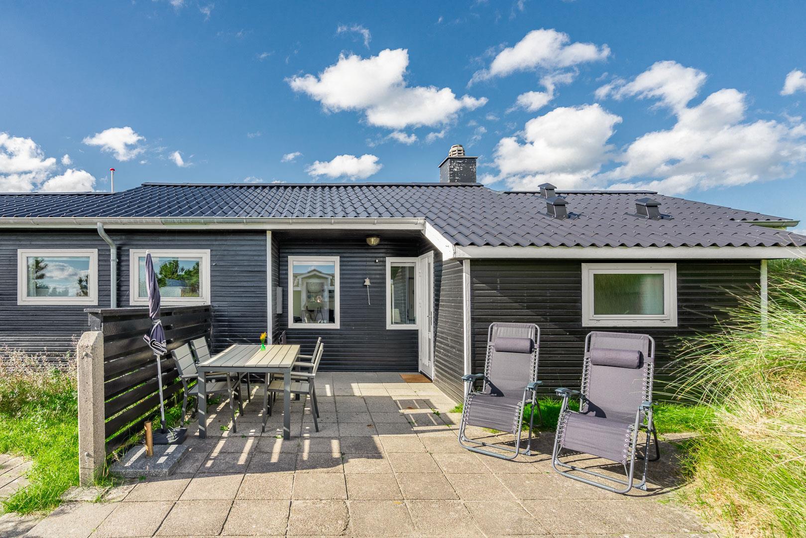 Charmerende feriehus med havudsigt beliggende på en pragtfuld og højtliggende klitgrund i forreste klitrække ved Henne Strand. Huset er løbende blevet moderniseret så alt fremstår lyst og venligt. Hyggelig stue som er indrettet med god stil og gode møbler. Stuen har store vinduer, så udsigten til havet og det pragtfulde klitlandskab kan nydes i fulde drag. Et soverum med gode enkeltsenge og skabe. Veludstyret køkken med opvaskemaskine og mikroovn. Der er også fra køkkenvinduet flot udsigt over klitlandskabet. Badeværelse med bruser, separat toilet. Der er flere dejlige og helt ugenerede terrasser omkring huset. Et fantastisk og super hyggeligt feriehus til 2 personer. Depotrum på terrassen er privat.