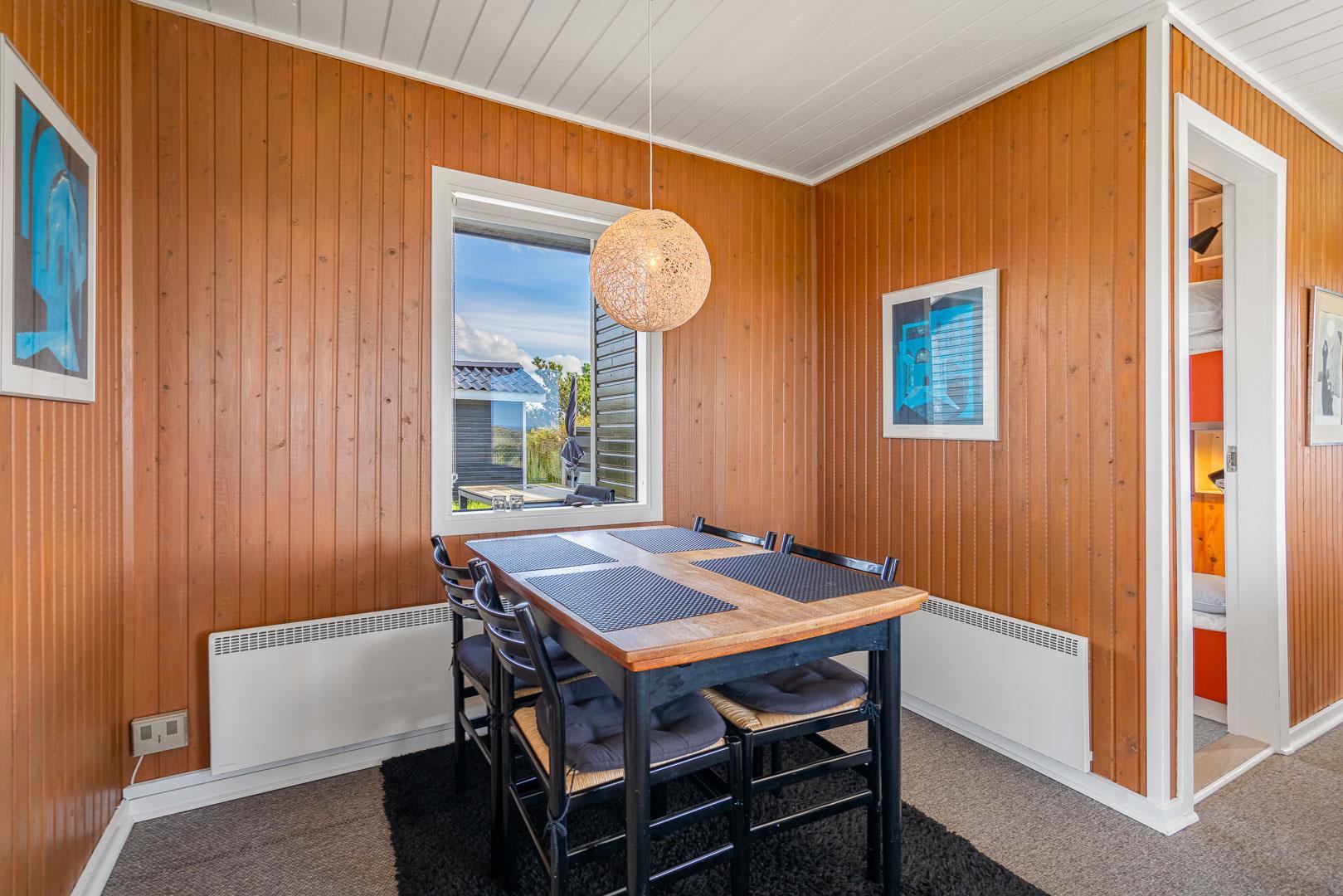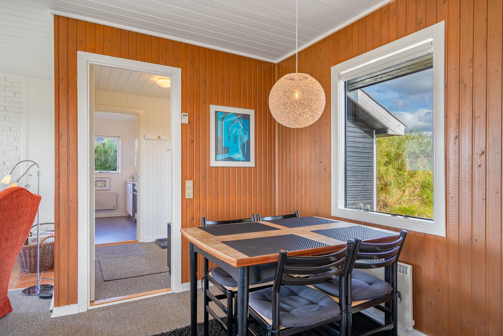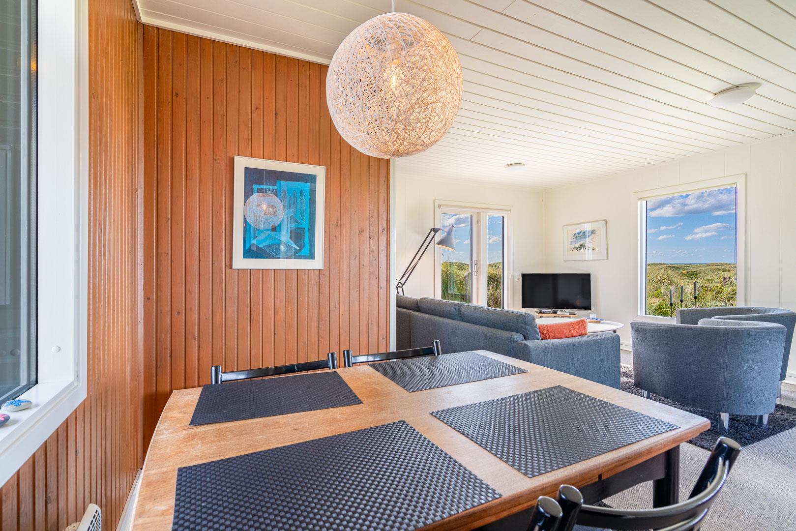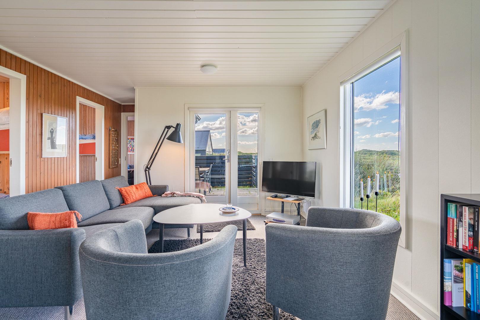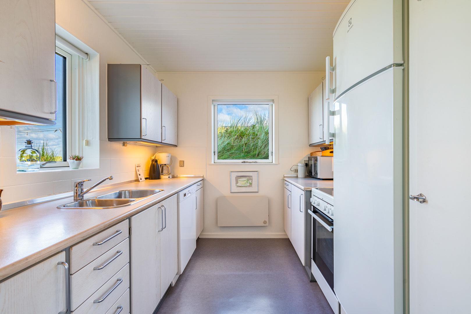 Charmerende feriehus med havudsigt beliggende på en pragtfuld og højtliggende klitgrund i forreste klitrække ved Henne Strand. Huset er løbende blevet moderniseret så alt fremstår lyst og venligt. Hyggelig stue som er indrettet med god stil og gode møbler. Stuen har store vinduer, så udsigten til havet og det pragtfulde klitlandskab kan nydes i fulde drag. Et soverum med gode enkeltsenge og skabe. Veludstyret køkken med opvaskemaskine og mikroovn. Der er også fra køkkenvinduet flot udsigt over klitlandskabet. Badeværelse med bruser, separat toilet. Der er flere dejlige og helt ugenerede terrasser omkring huset. Et fantastisk og super hyggeligt feriehus til 2 personer. Depotrum på terrassen er privat.