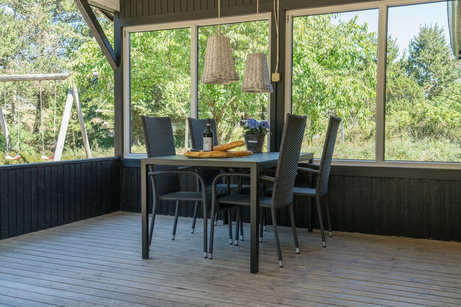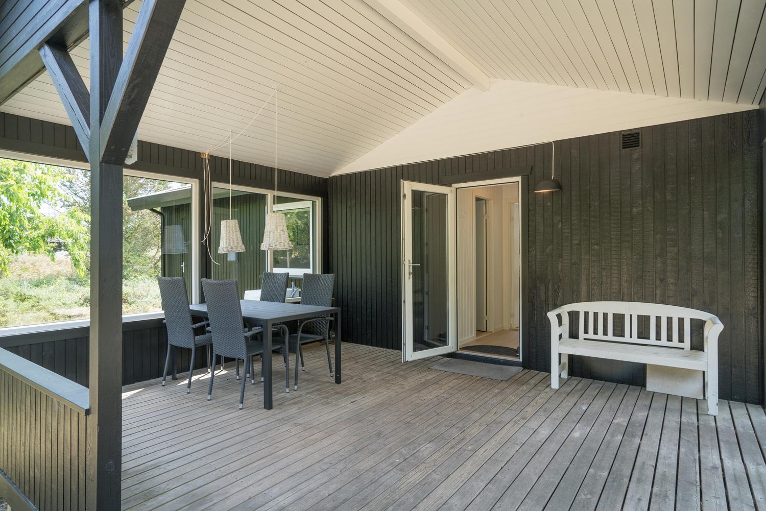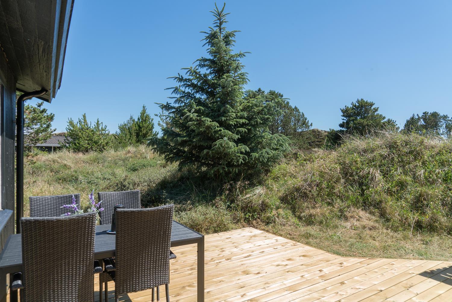 Gode muligheder for både sol og på de 3 dejlige træterrasser, hvoraf den ene er overdækket. Her kan ferien og den dejlige natur nydes i al slags vejr og på alle tider af døgnet.
