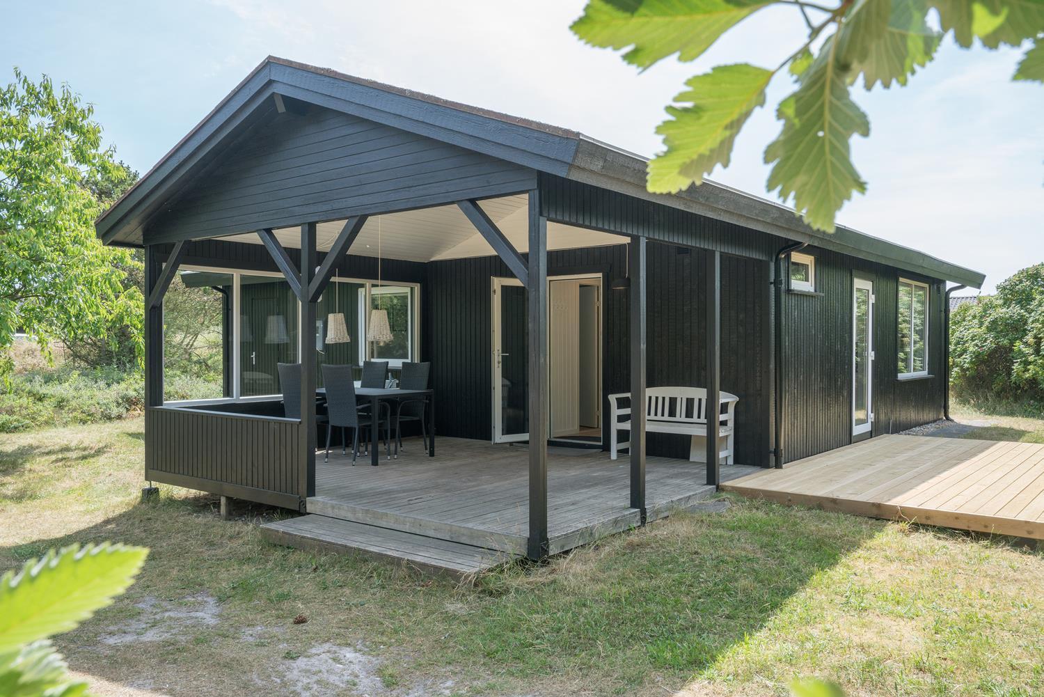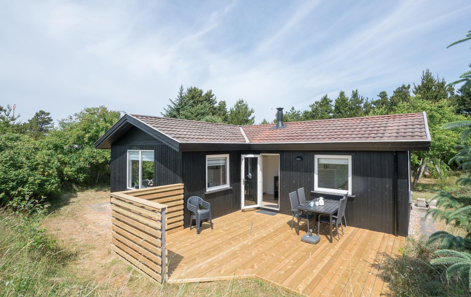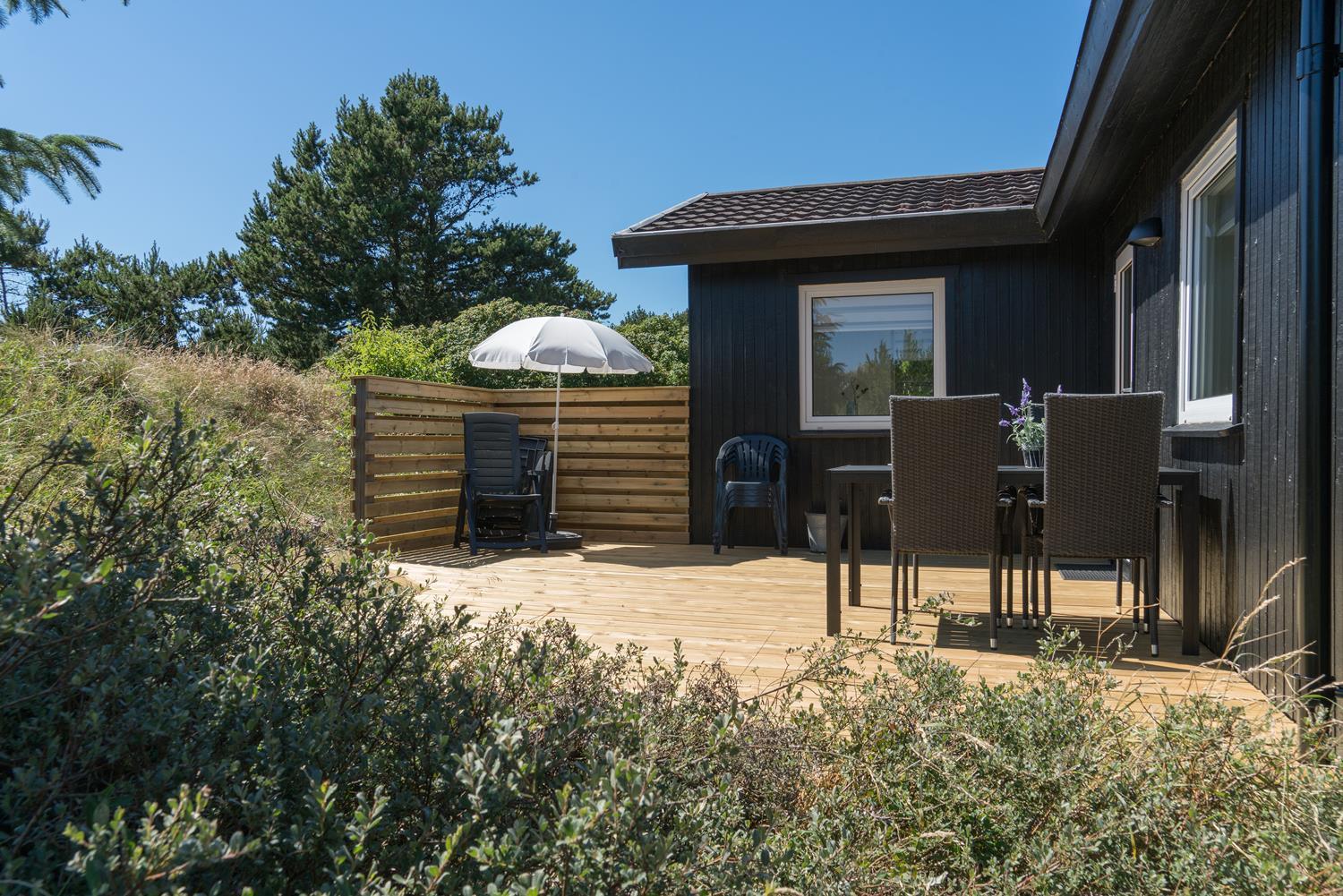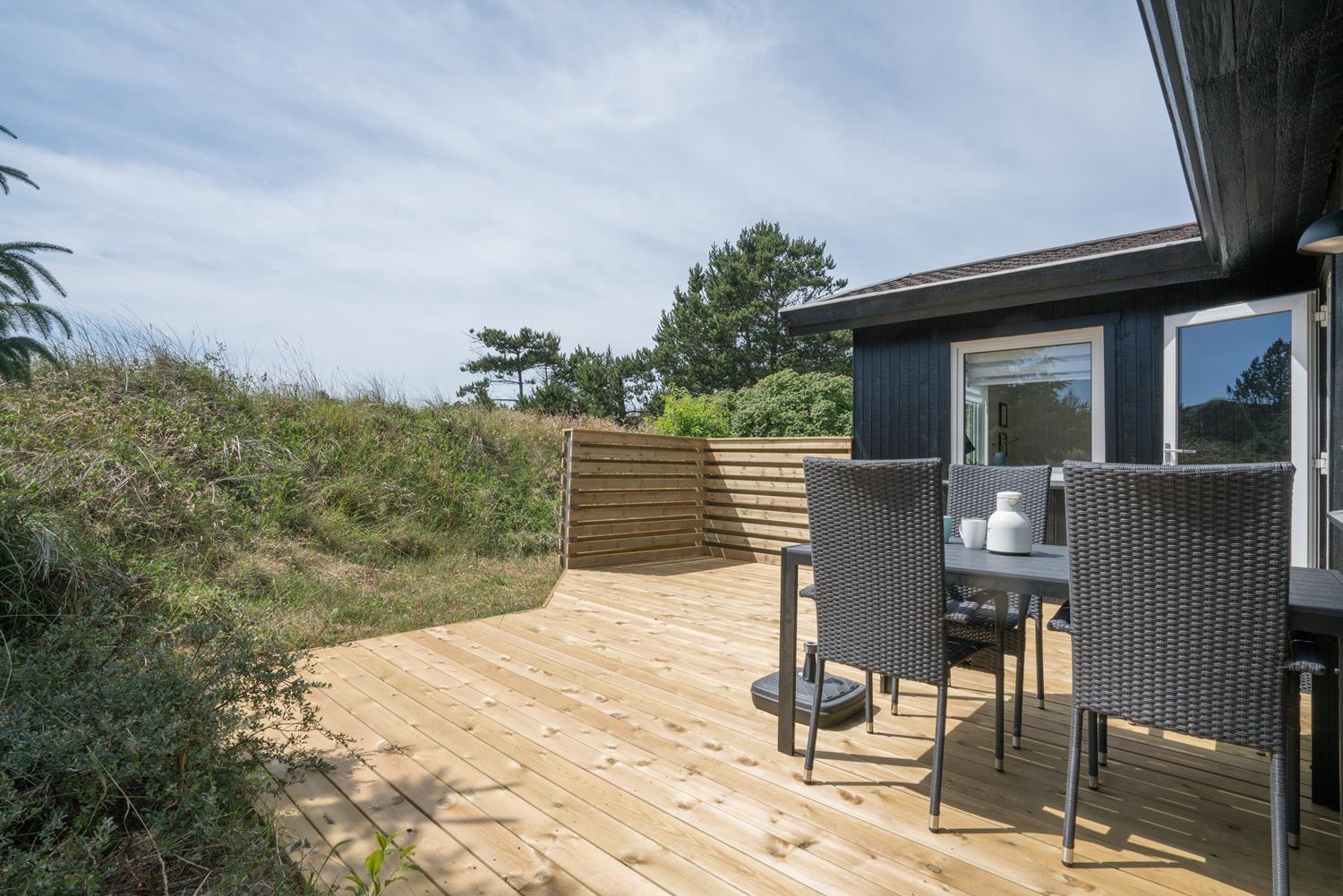 Hyggeligt træhus i Henne Strand med moderne faciliteter og tre dejlige terrasser i naturskønne omgivelser.
