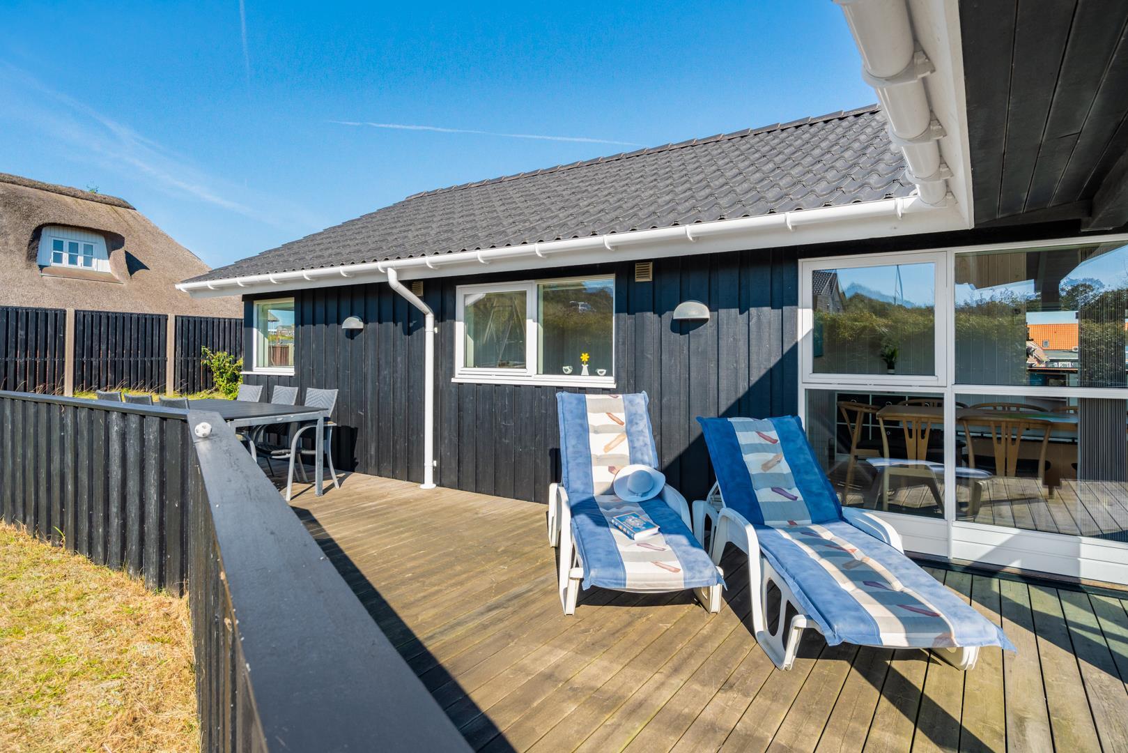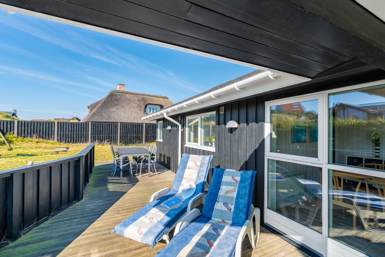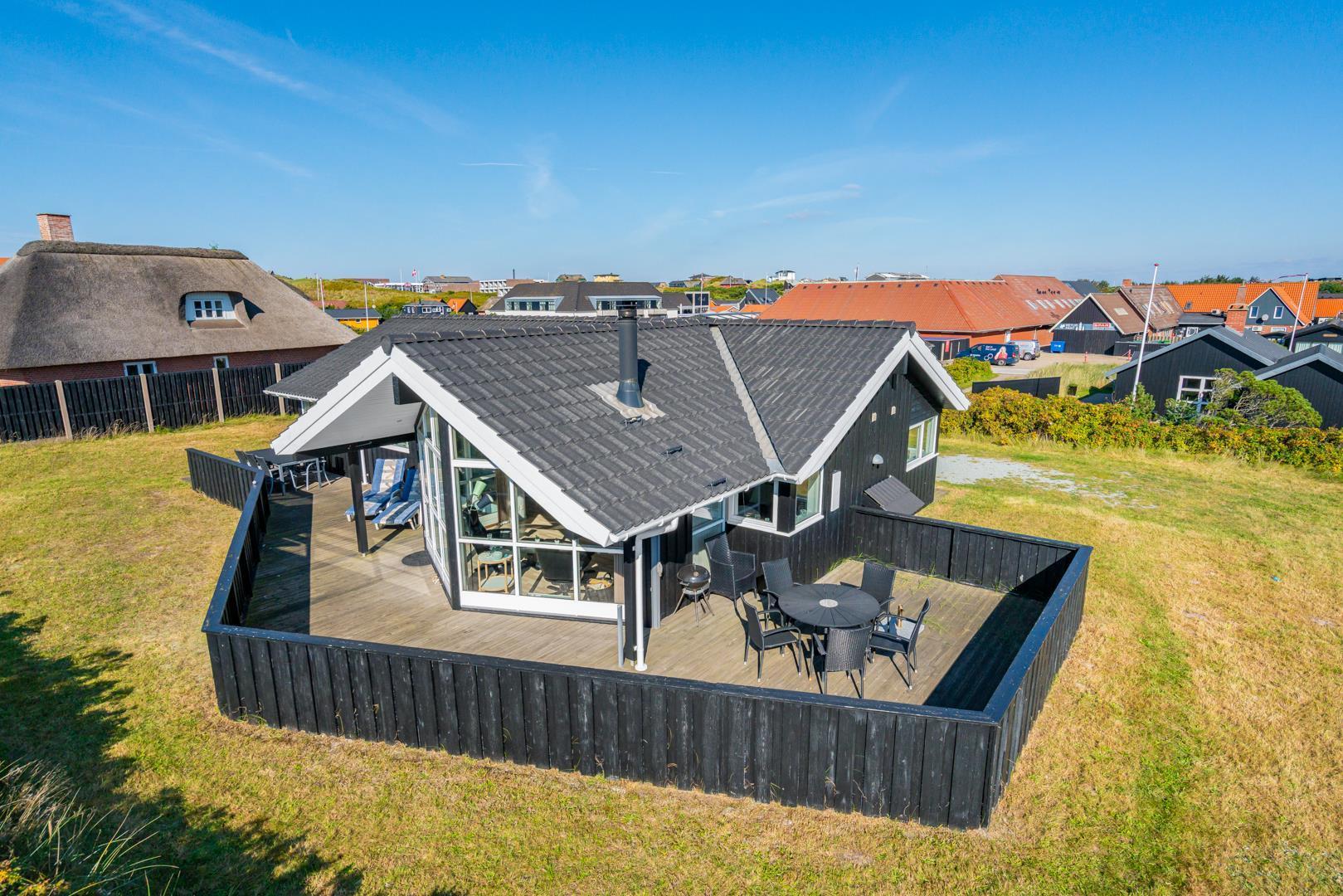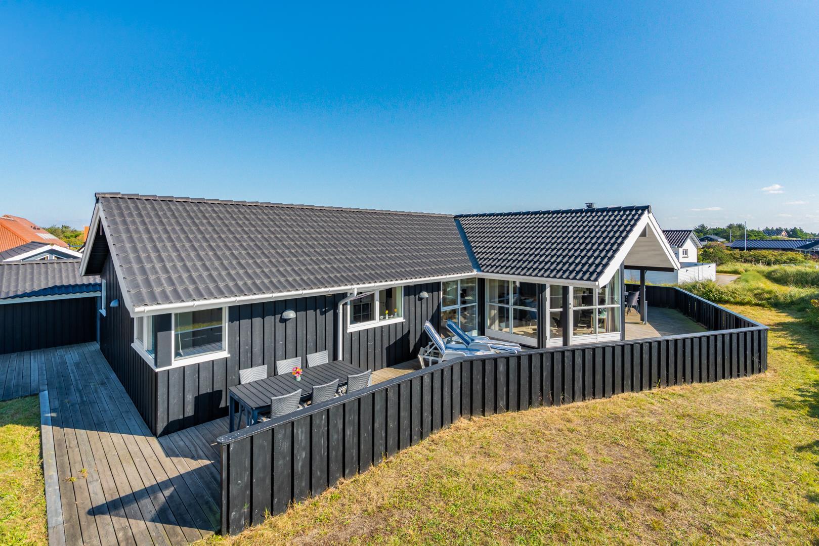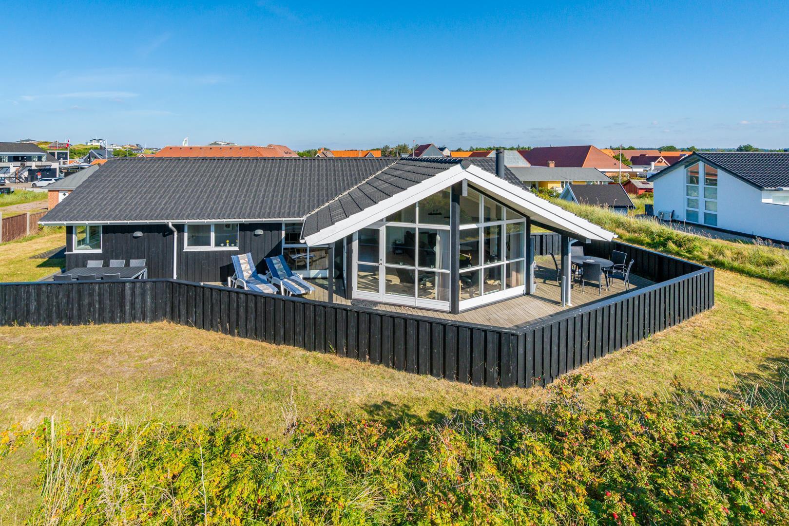 Kvalitetsferiehus med spa og sauna nær Henne Strands centrum og strand, med flere ugenerede terrasser og godt lysindfald.