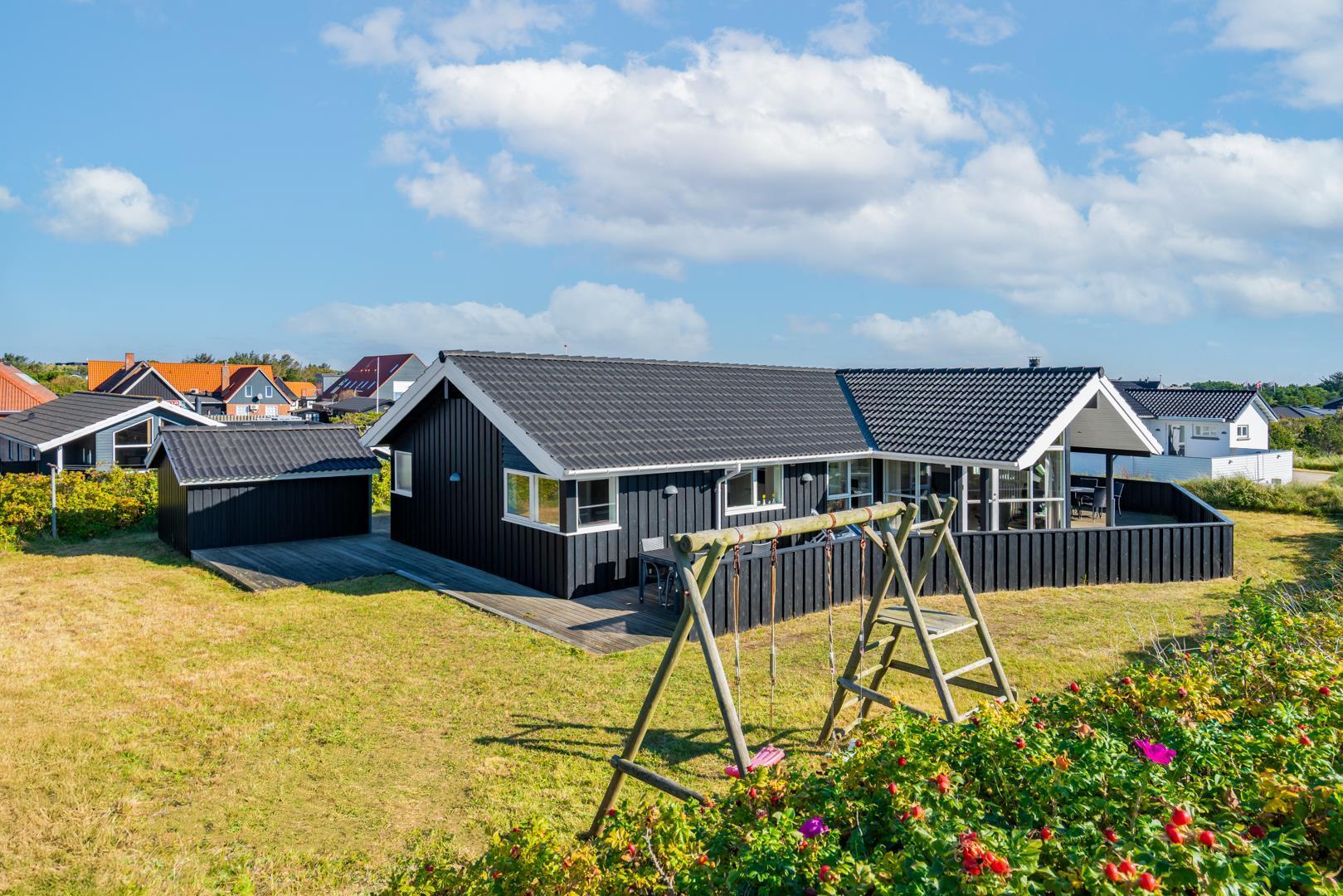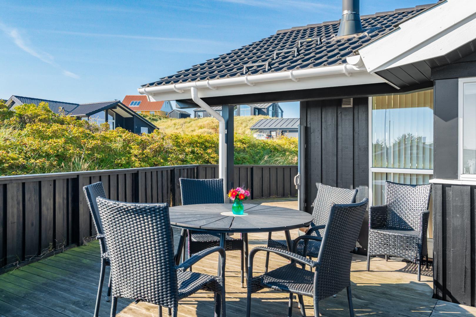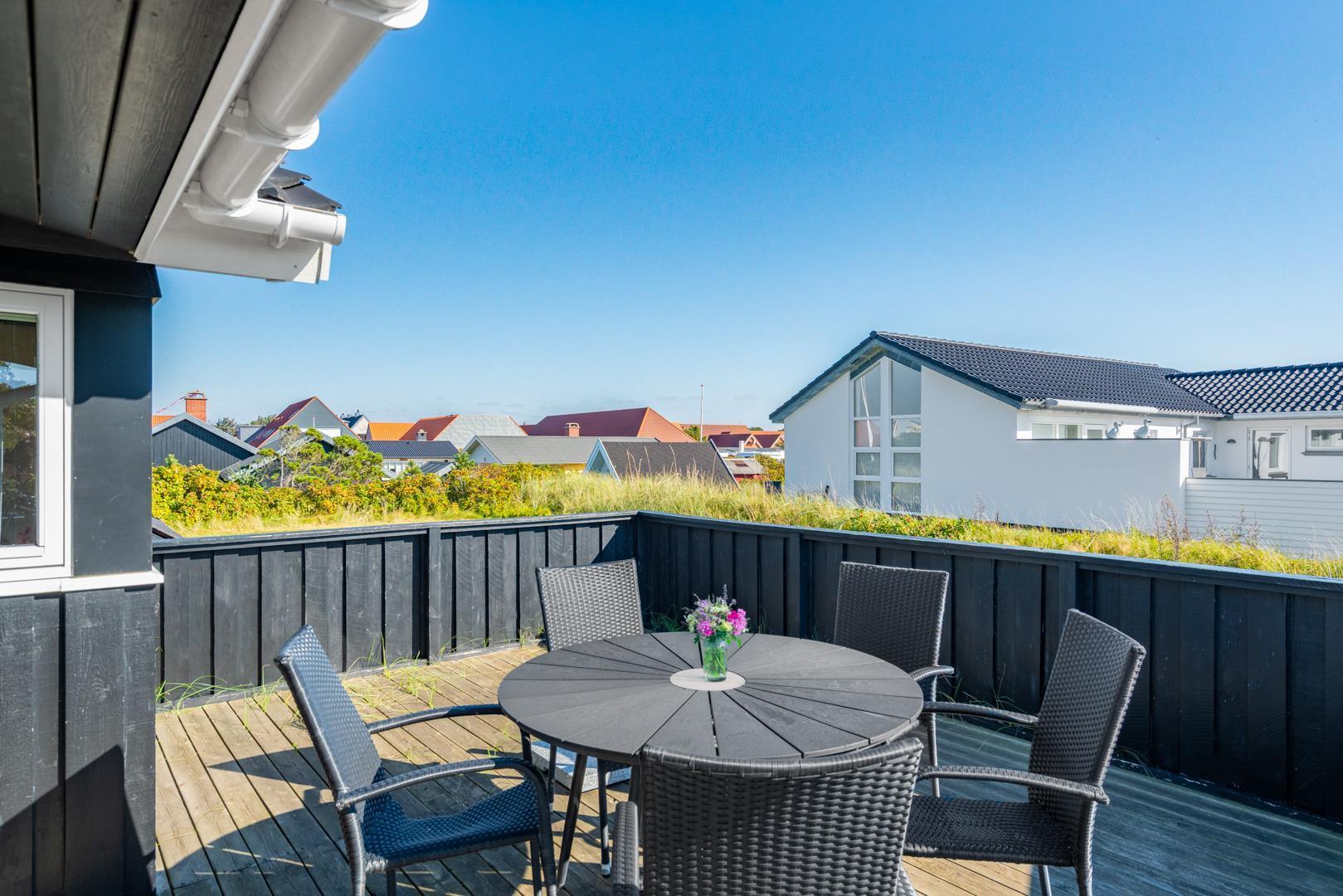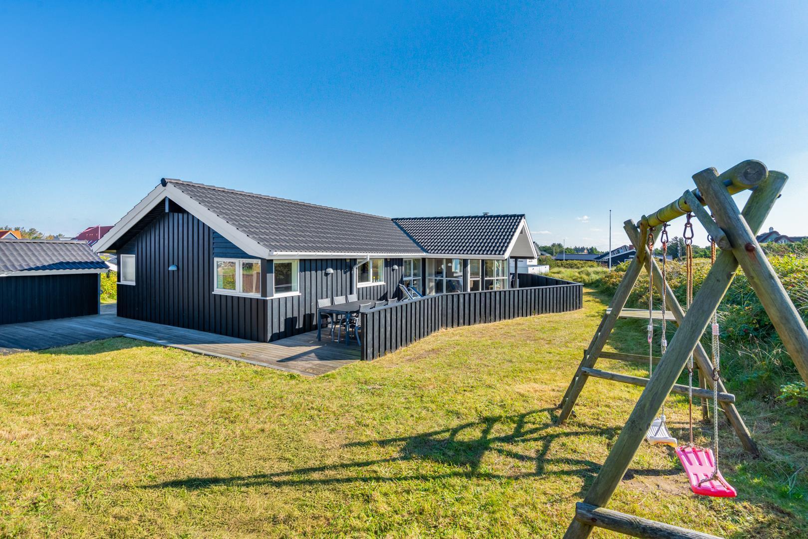Kvalitetsferiehus med spa og sauna nær Henne Strands centrum og strand, med flere ugenerede terrasser og godt lysindfald.