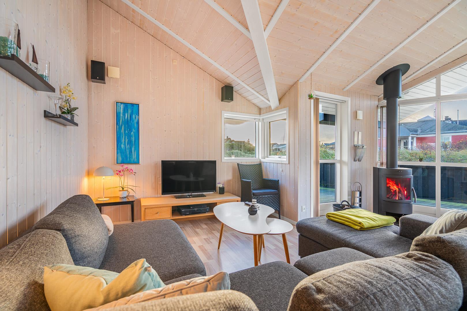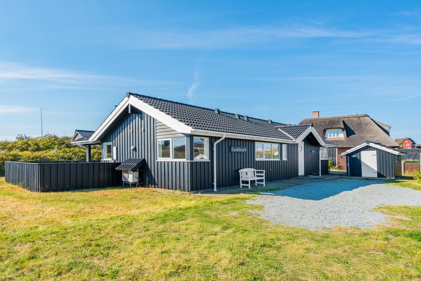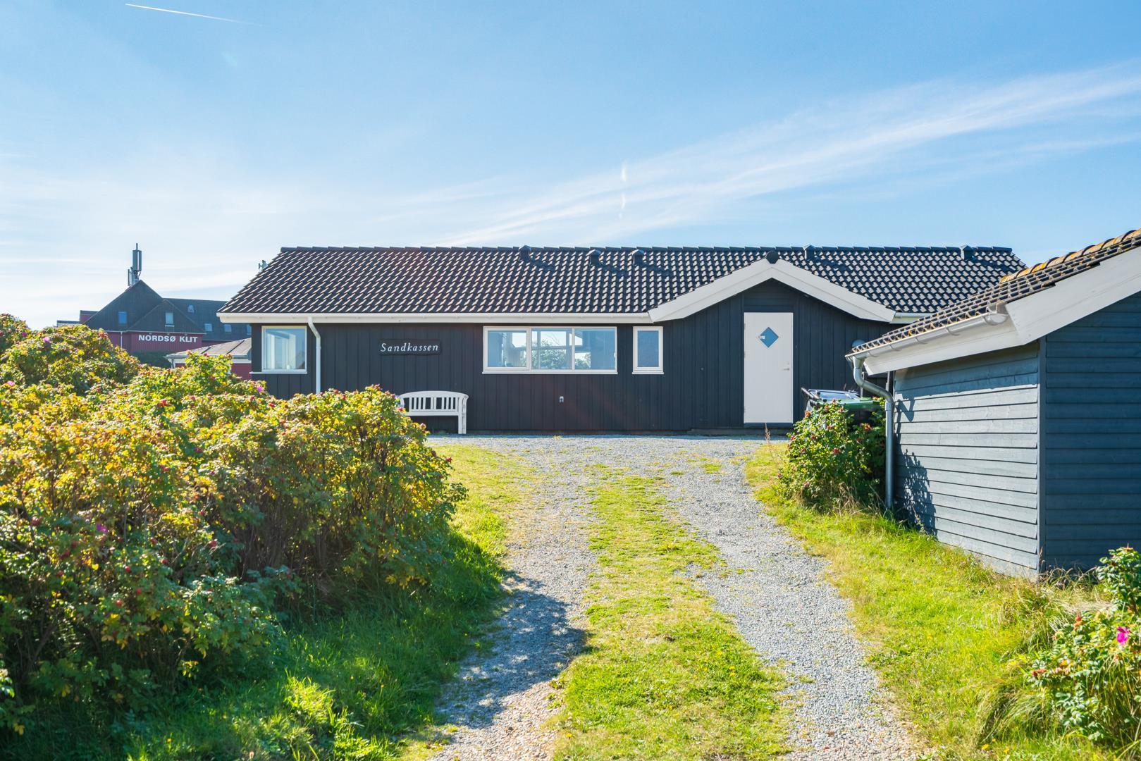 På en skøn klitgrund kun 2 minutters gang fra Henne Strands centrum og stranden, ligger dette kvalitetsferiehus med spa og sauna, godt tilbagetrukket i forhold til vejen, Det store vinduesparti giver et godt lysindfald ind i stuen. Huset råder over flere dejlige ugenerede terrasser, hvor der altid er mulighed for at finde en læ krog.