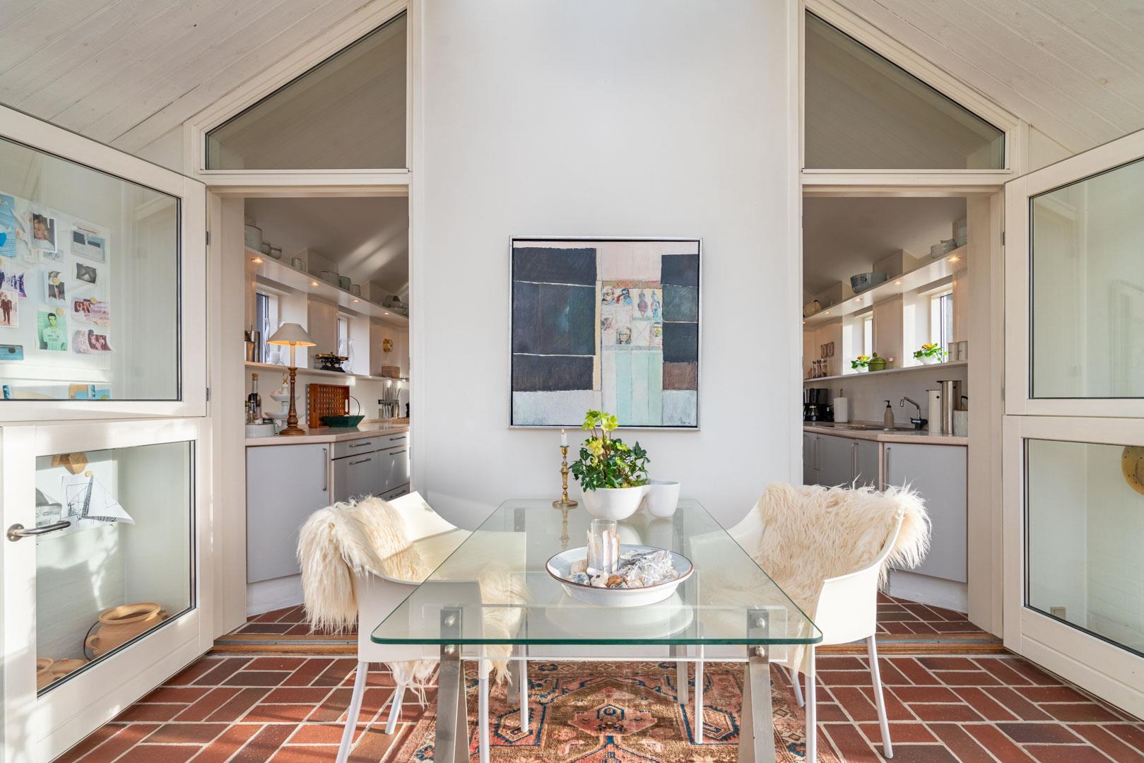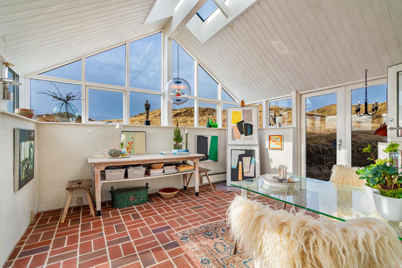 Fra spisestuen er der direkte udgang til et fantastisk atelier med mange lysindfald fra flere døre og vinduer – Et fantastisk rum der gør sommerhuset helt unikt!