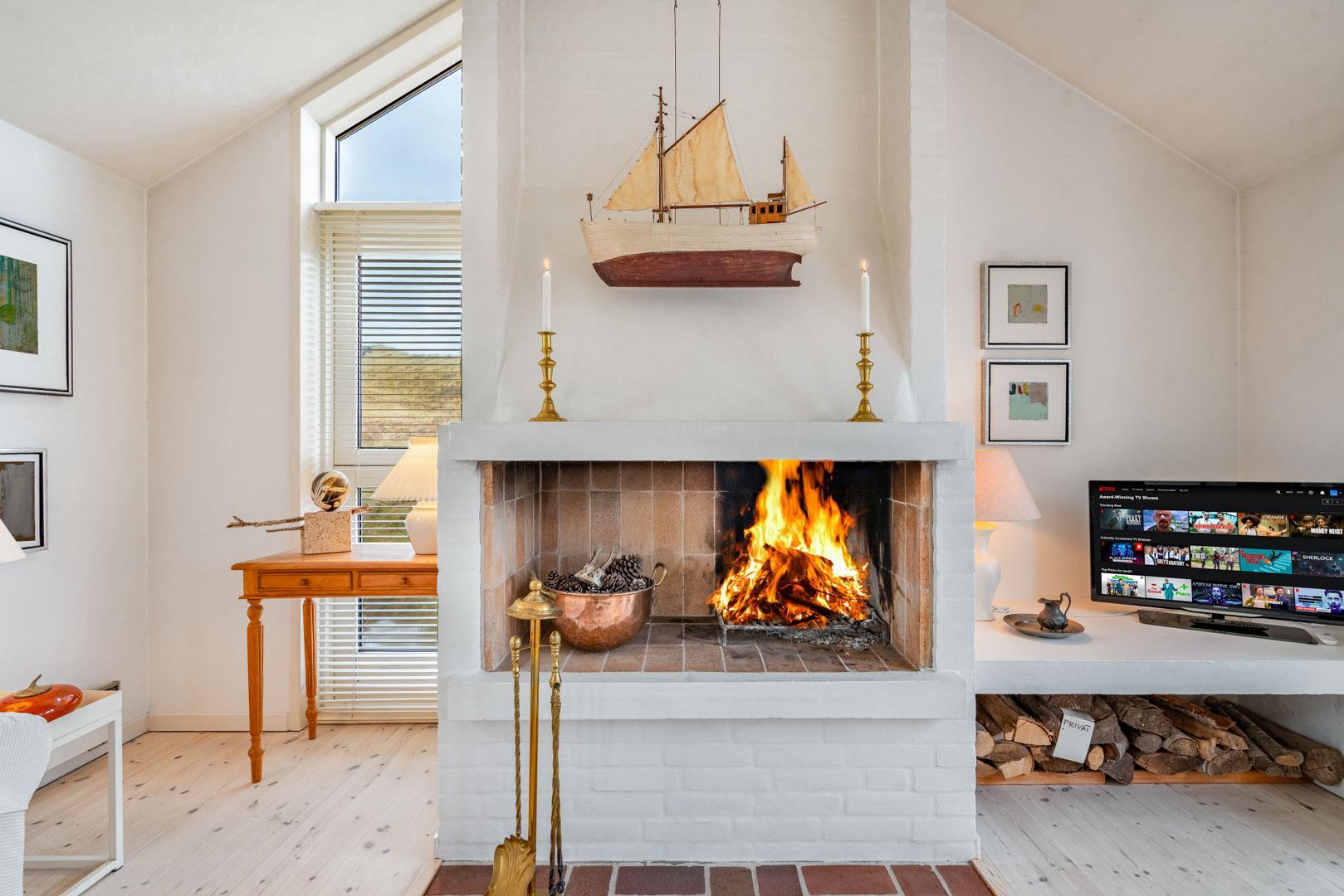 Det lyse og stilfulde sommerhus skaber den perfekte sommerhusstemning i hvert eneste hjørne. Her er en rigtig hyggelig stue med loft til kip og en pejs der indbyder til hyggelige stunder med en god bog. Det åbne og veludstyrede køkken/alrum ligger i forbindelse med spisestuen, her sørger brændeovnen for at sprede varme og hygge til de kolde måneder - et perfekt sted for samvær hvad enten det er over en middag eller et familiespil.