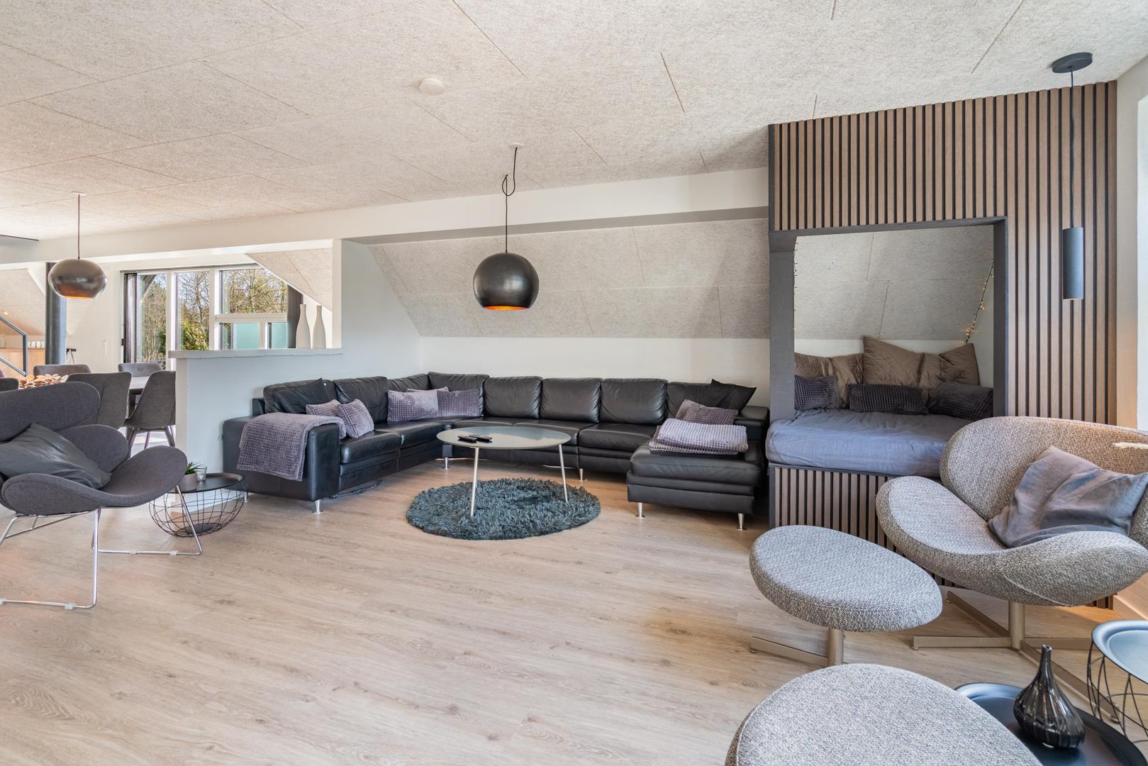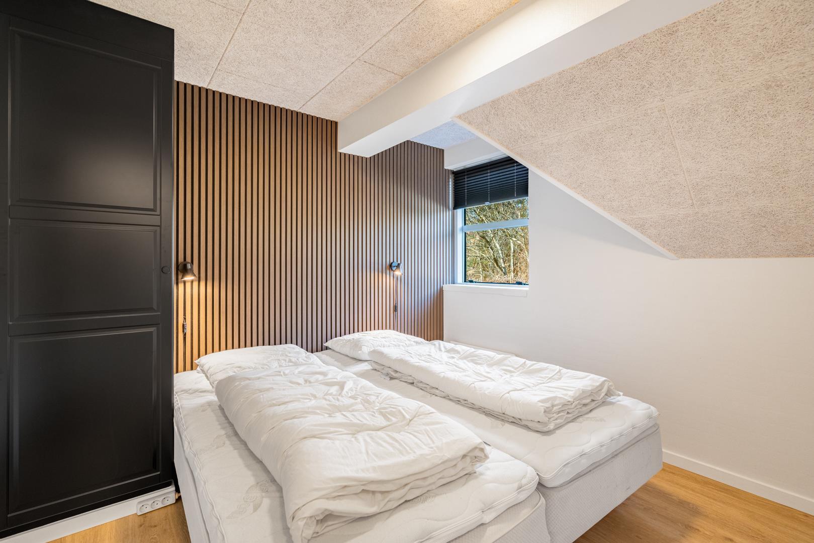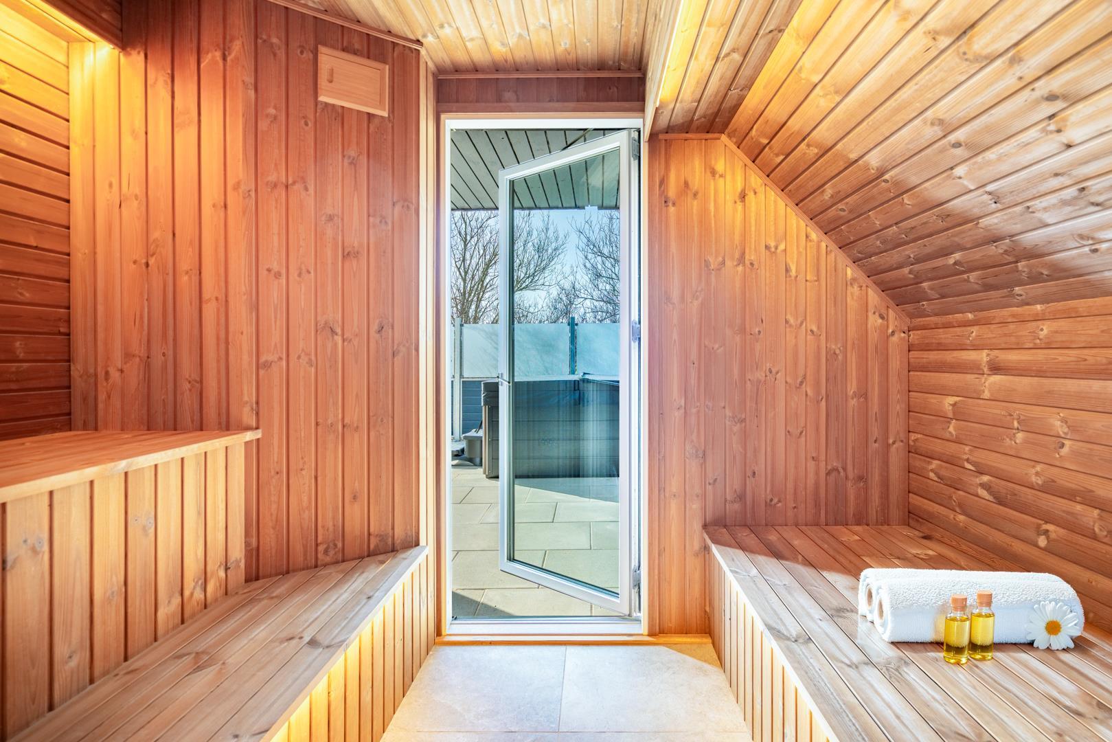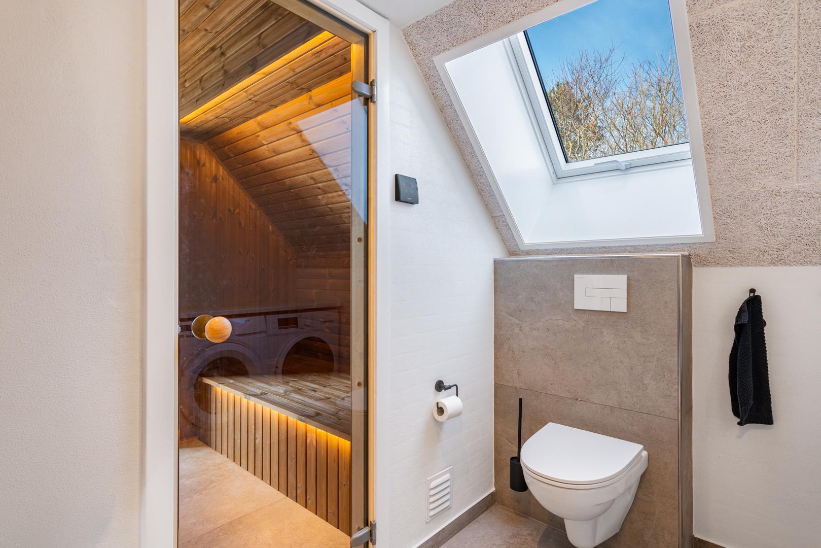 Dette sommerhus har 5 soveværelser og 2 moderne badeværelser med gulvvarme, hvilket gør det ideelt til både familier og vennegrupper. Et ekstra plus er saunaen, hvorfra der også er direkte udgang til terrassen.
