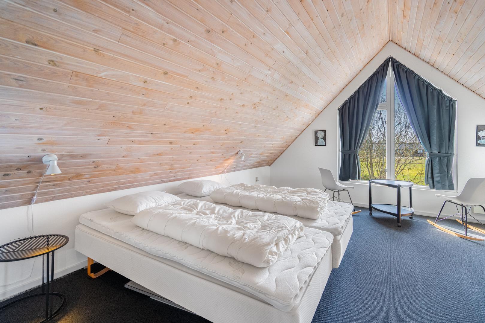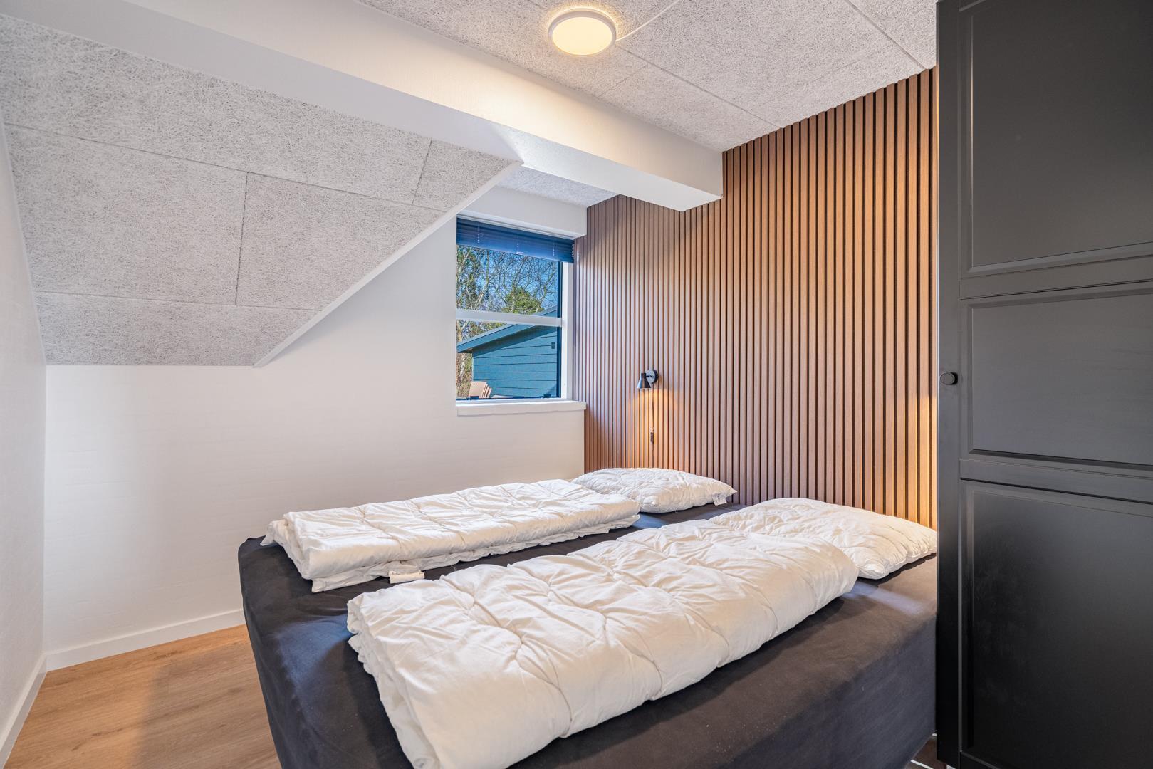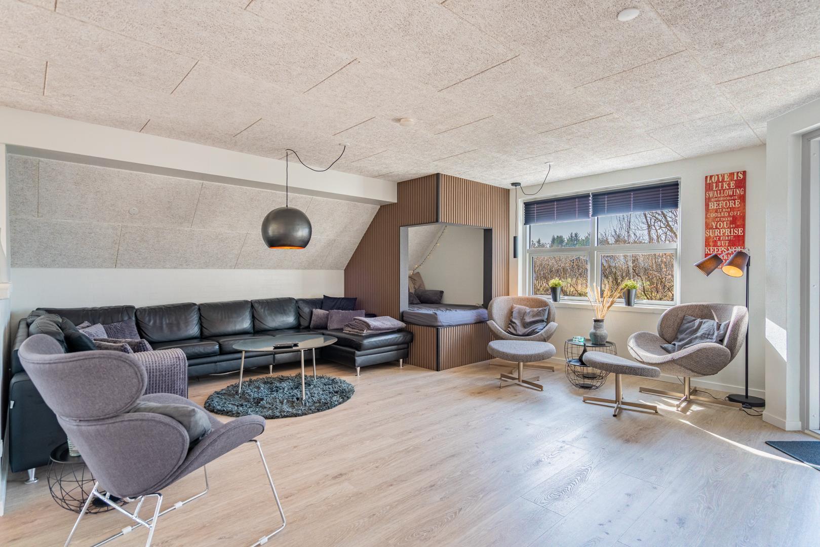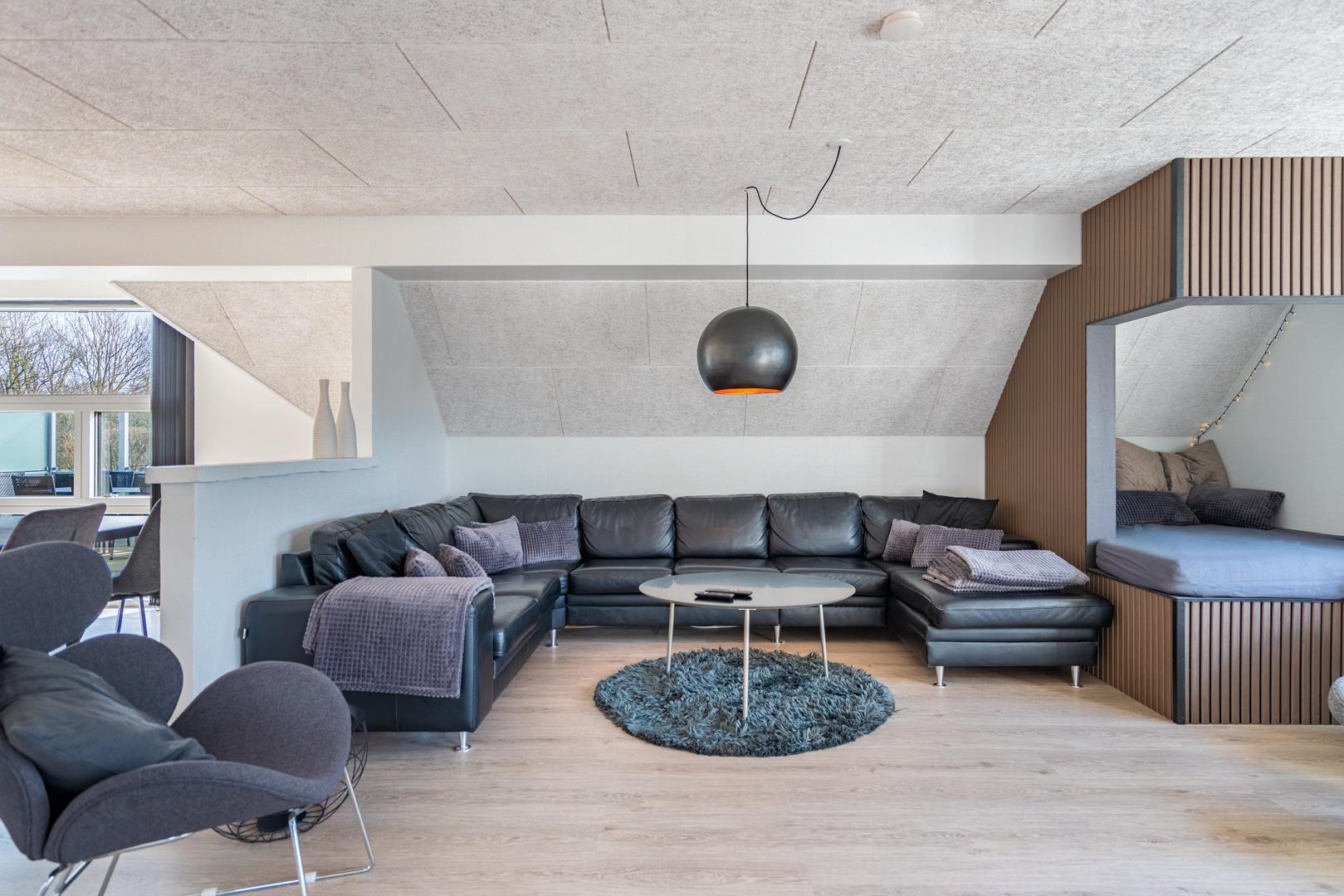 Dette sommerhus har 5 soveværelser og 2 moderne badeværelser med gulvvarme, hvilket gør det ideelt til både familier og vennegrupper. Et ekstra plus er saunaen, hvorfra der også er direkte udgang til terrassen.