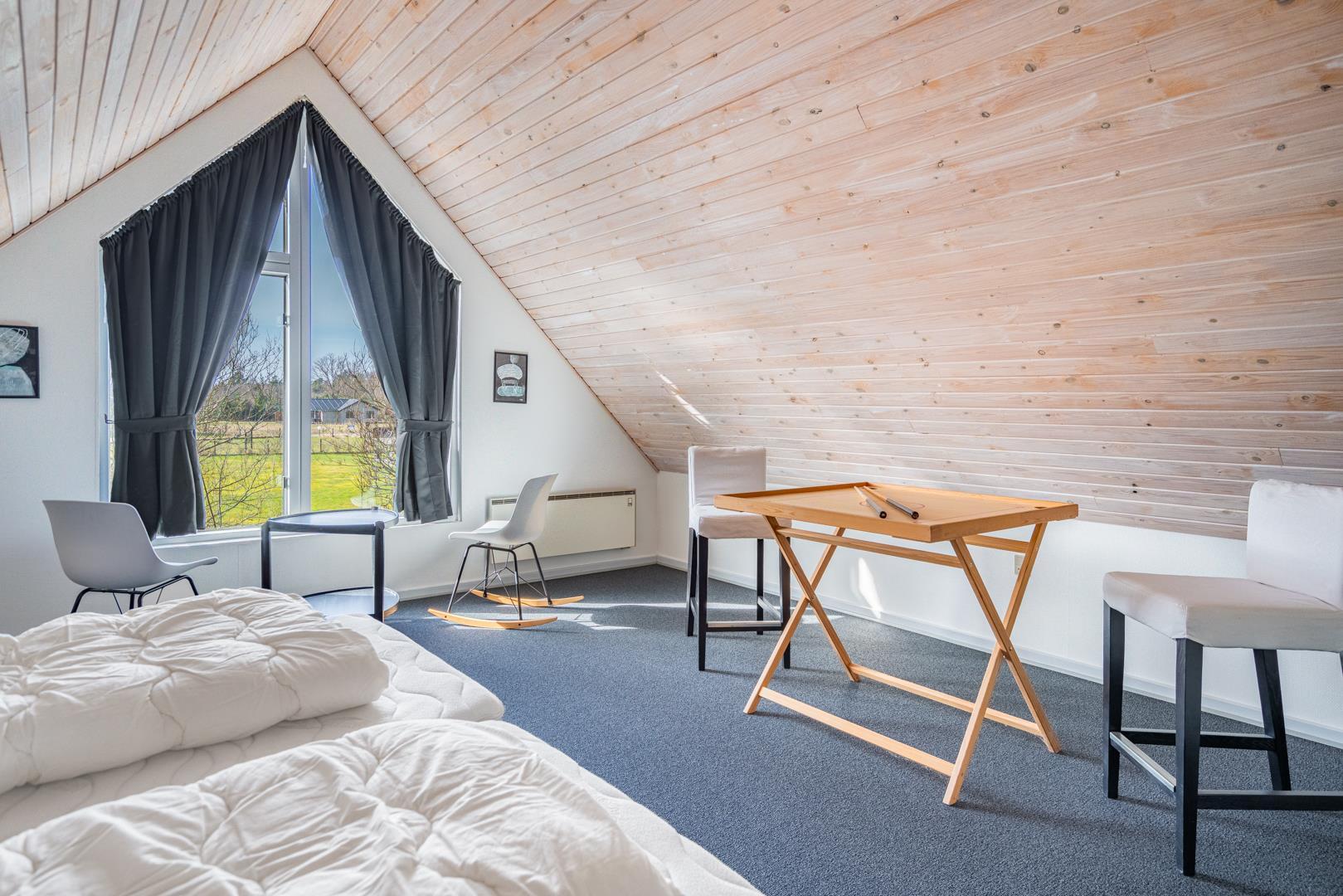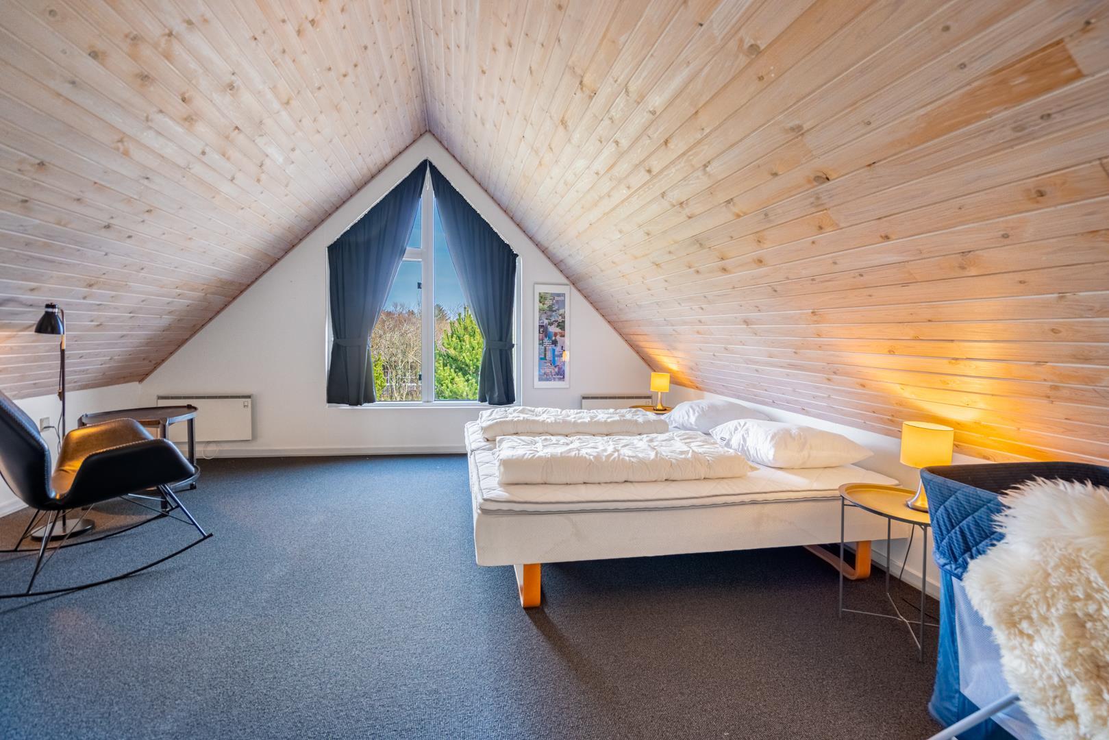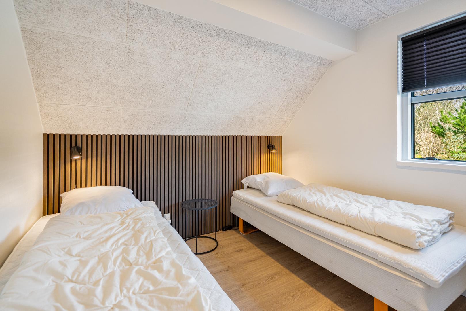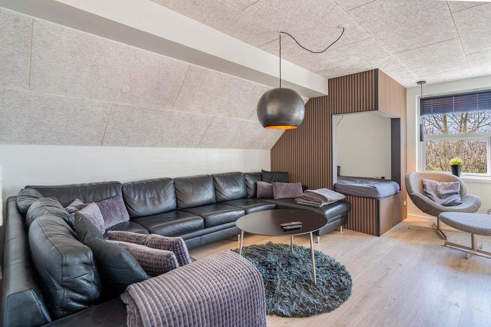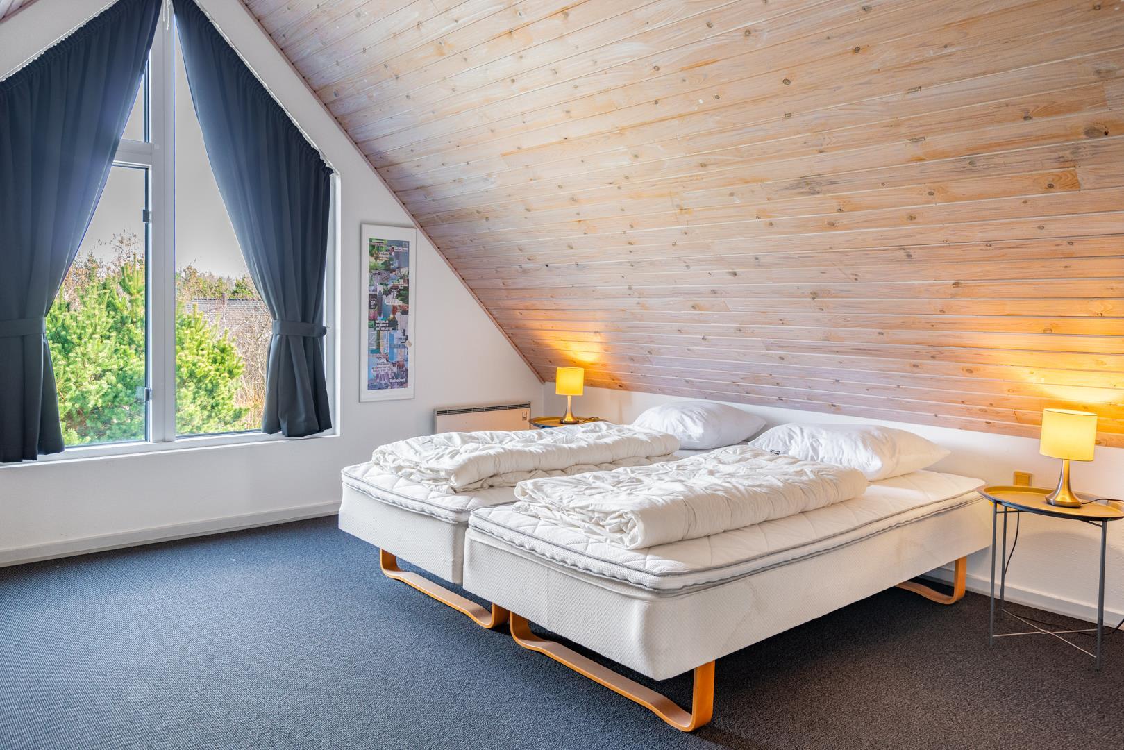 Dette sommerhus har 5 soveværelser og 2 moderne badeværelser med gulvvarme, hvilket gør det ideelt til både familier og vennegrupper. Et ekstra plus er saunaen, hvorfra der også er direkte udgang til terrassen.