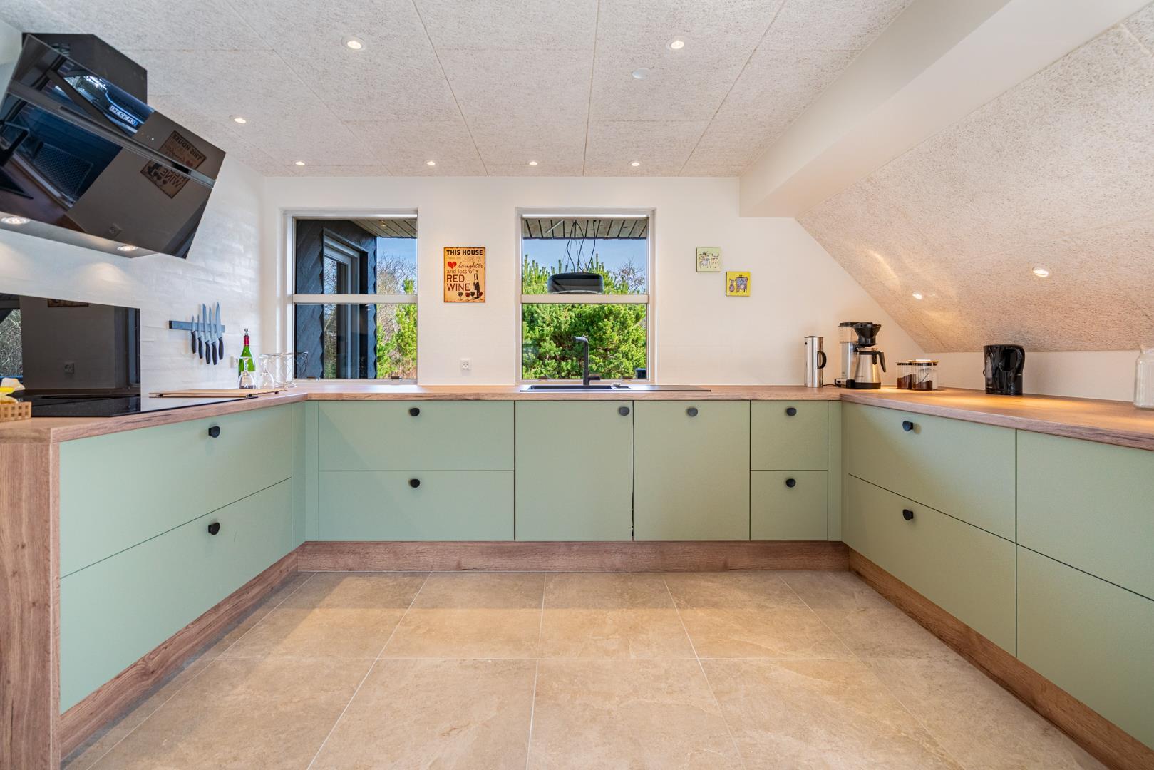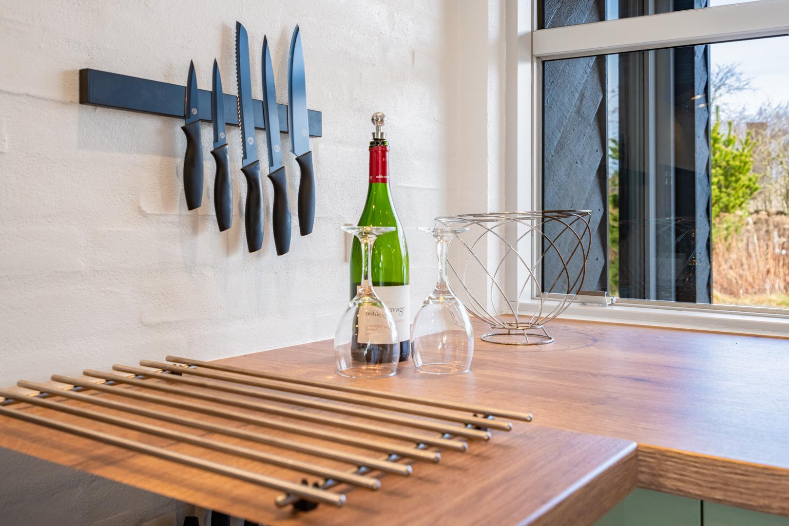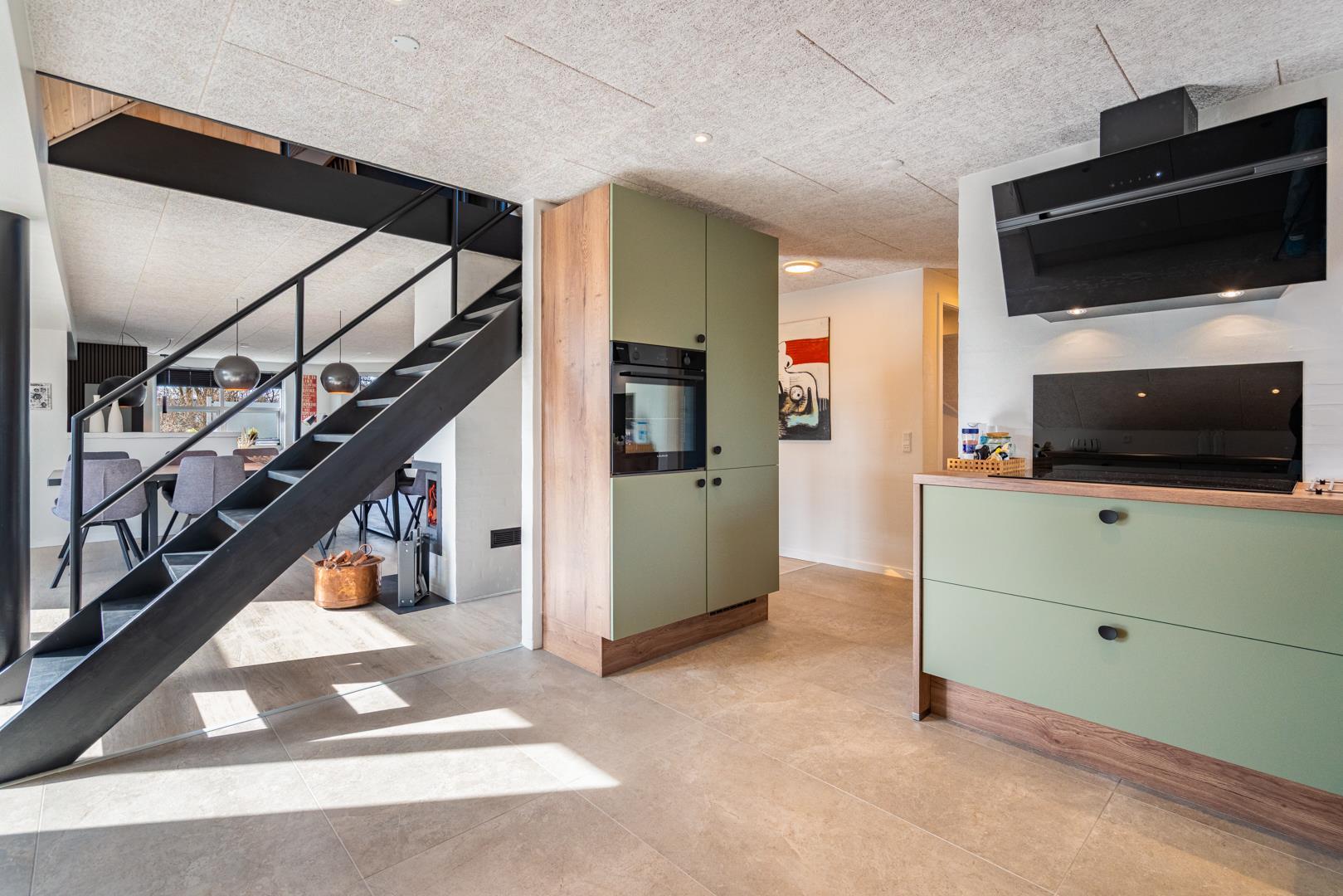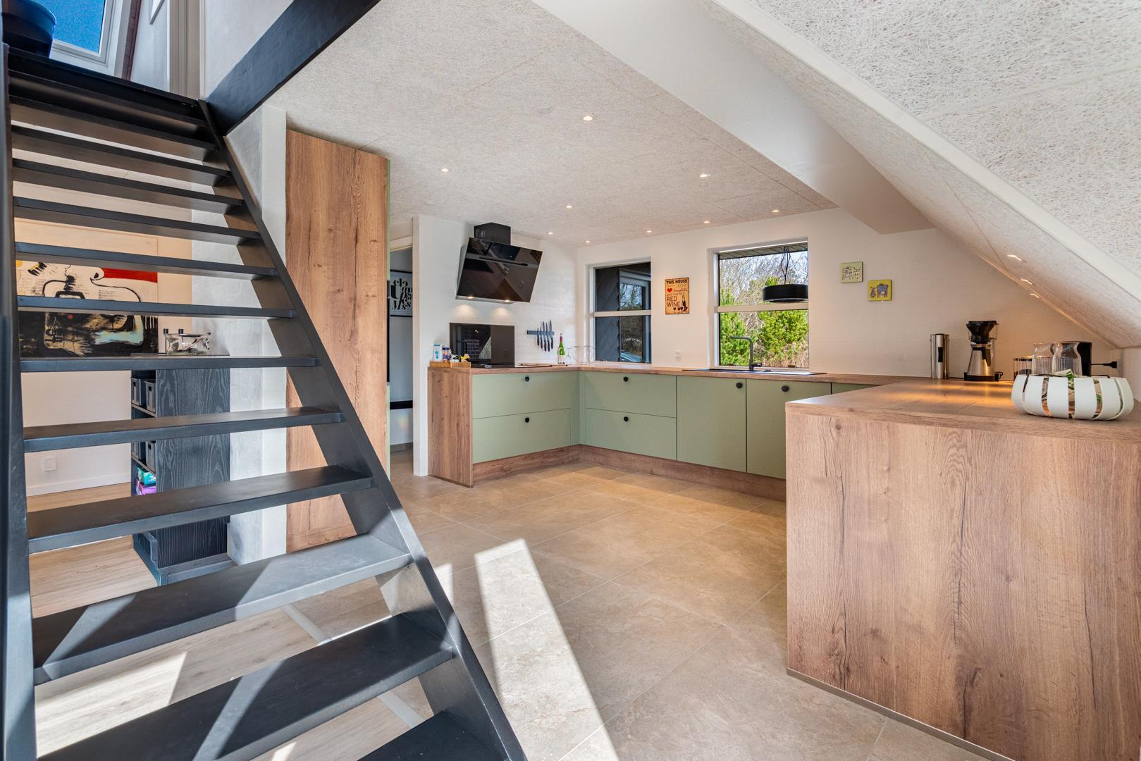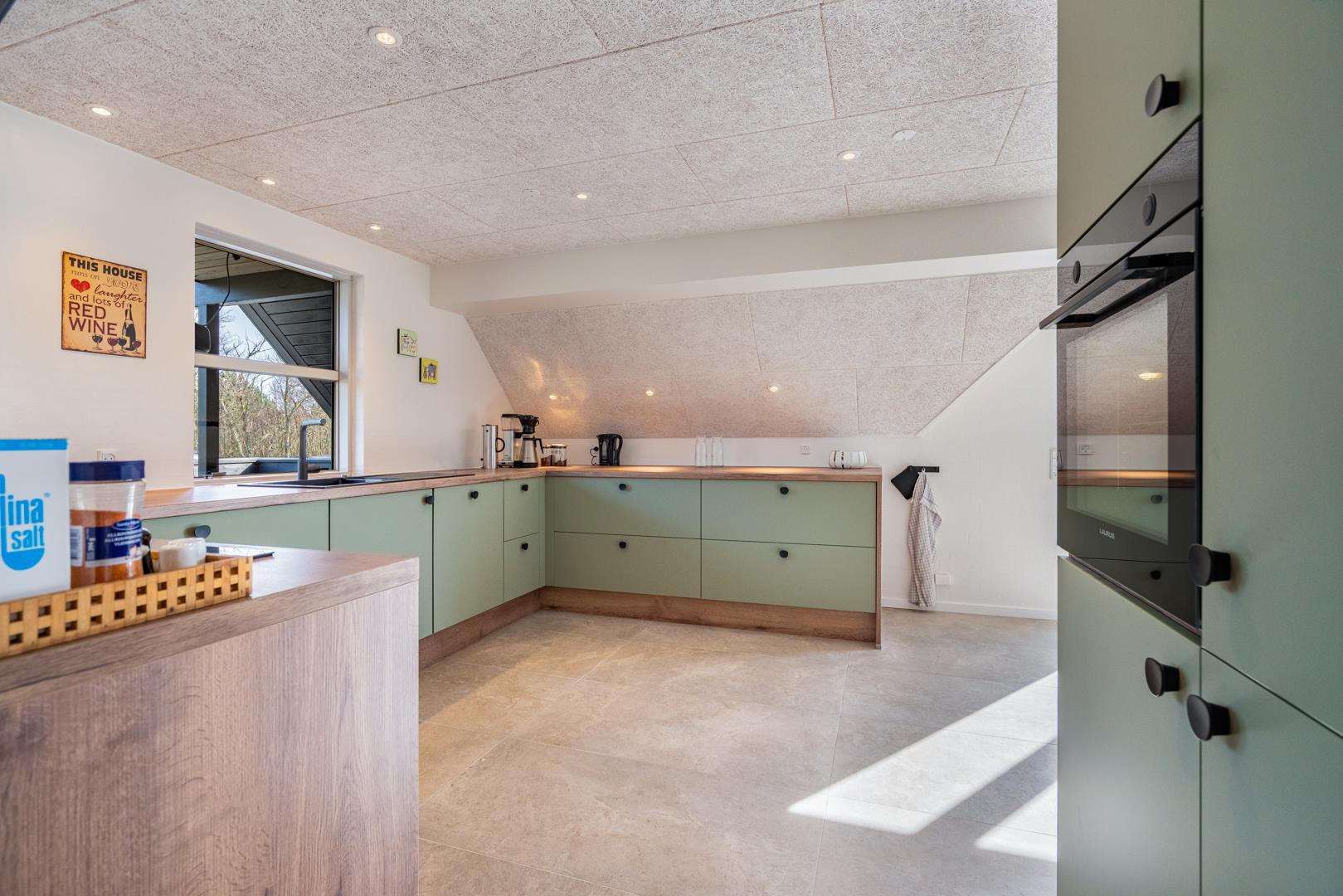 Det moderne køkken er udstyret med blandt andet opvaskemaskine, gulvvarme og god bordplads, så også større grupper kan lave mad sammen uden problemer.