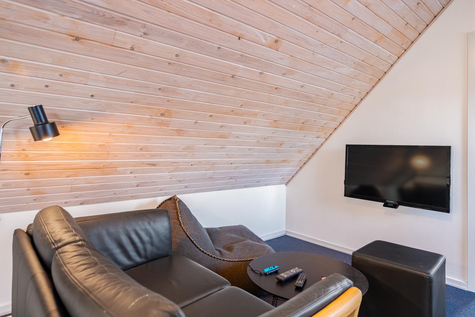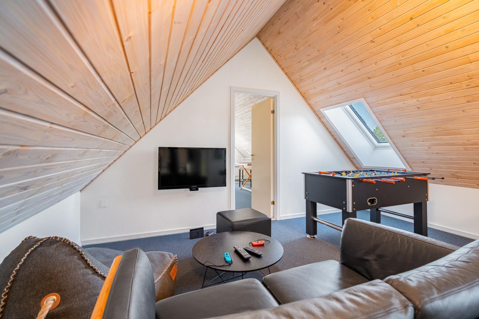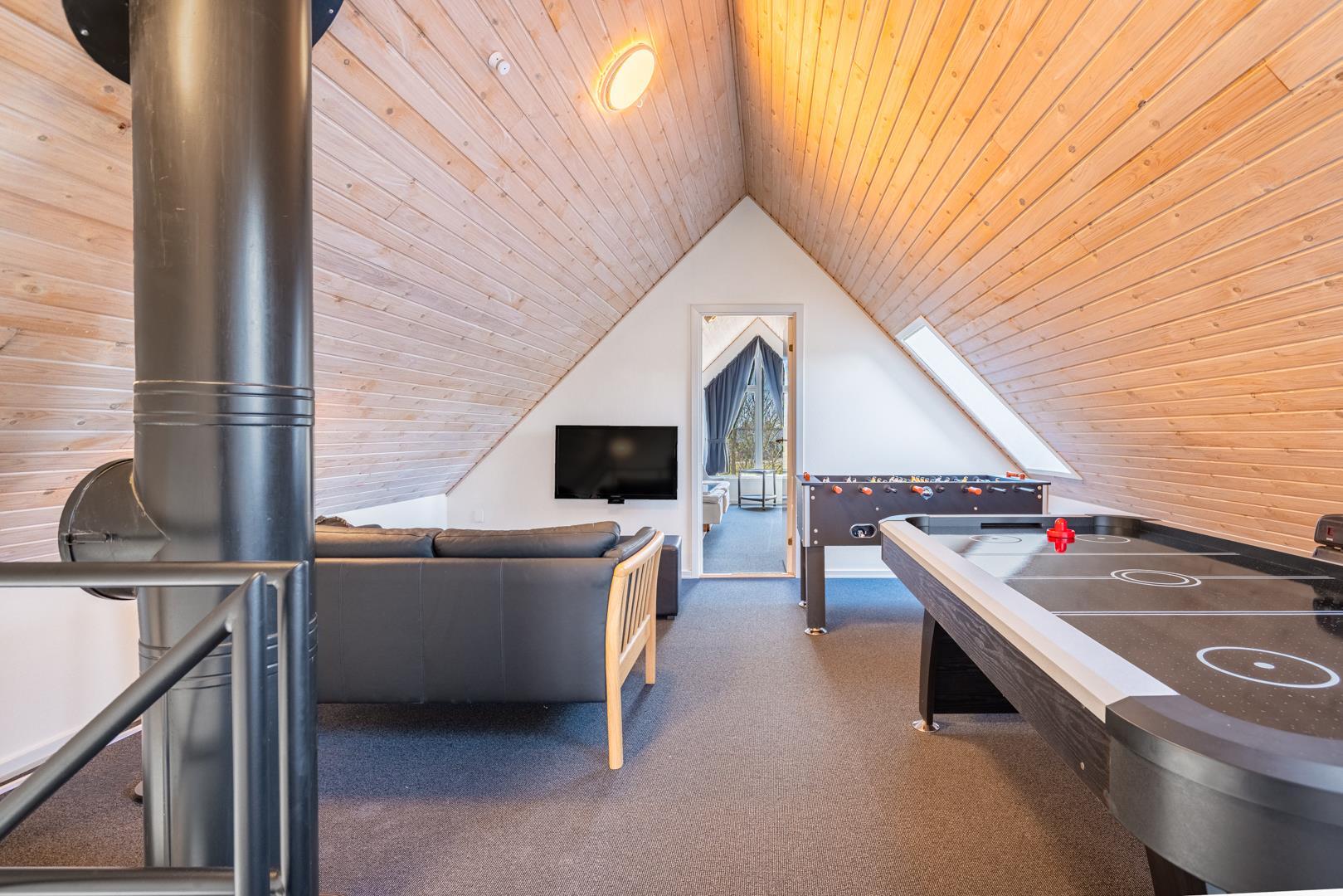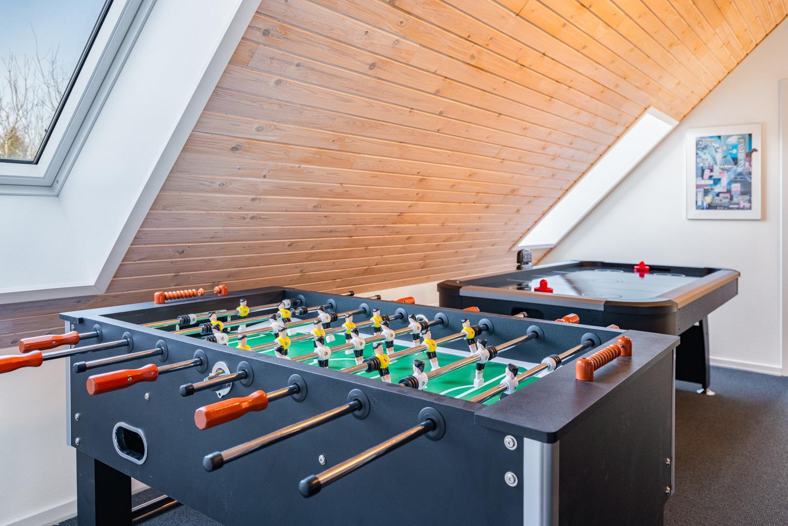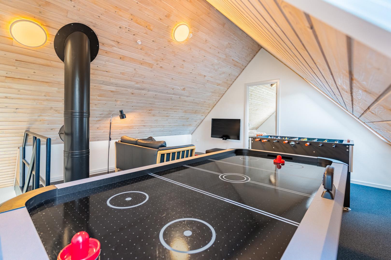 Når vejret indbyder til indendørs hygge, kan I samles i aktivitetsrummet. Her er der blandt andet airhockey, bordfodbold og spillekonsol – perfekt til sjove konkurrencer og hyggelige spilleaftener.
