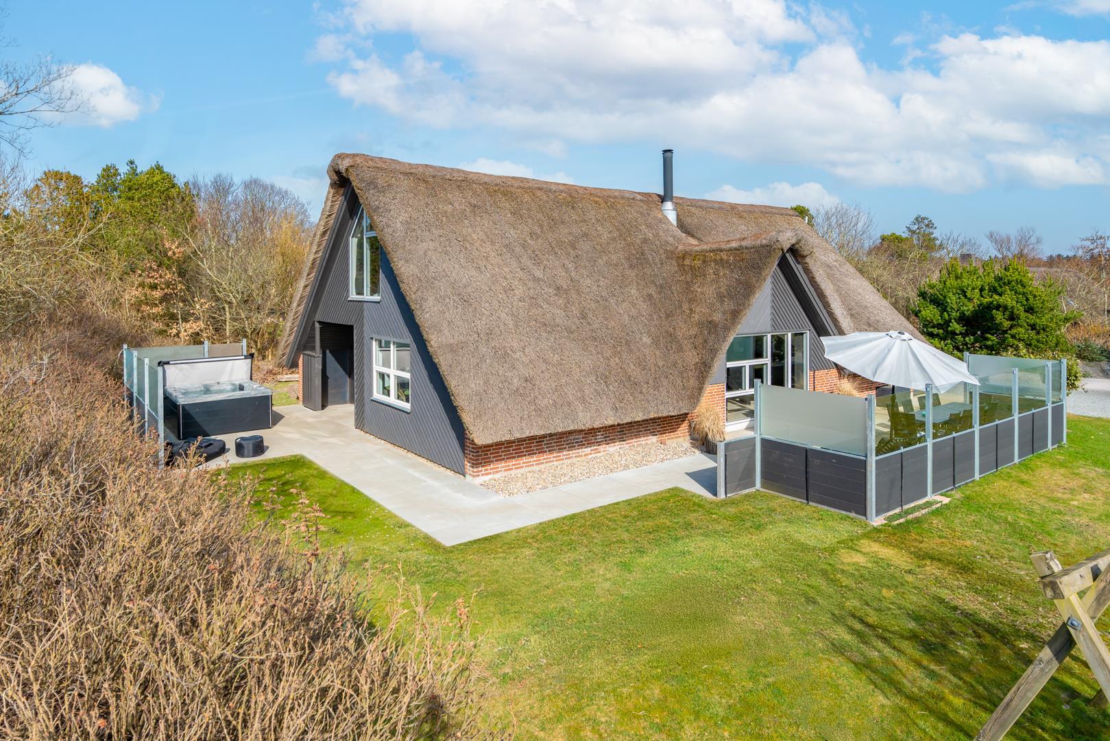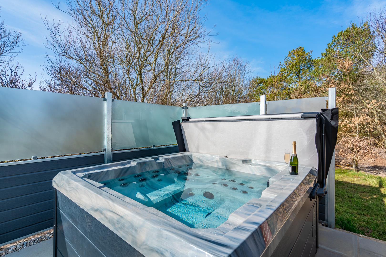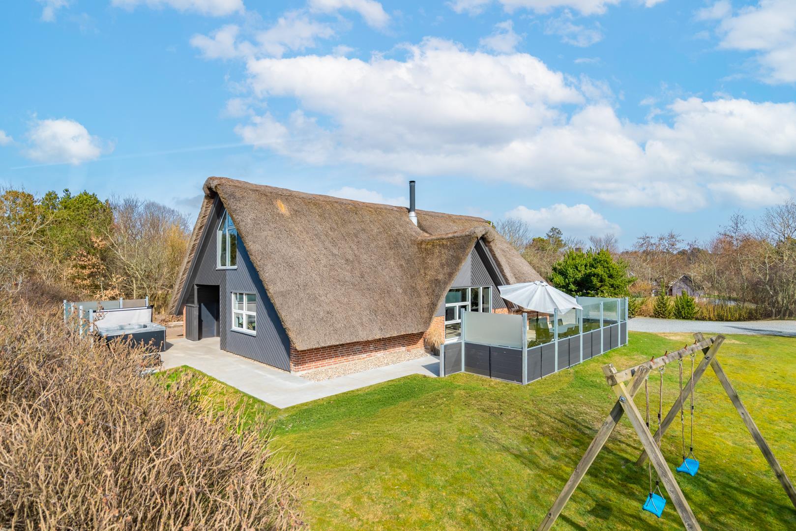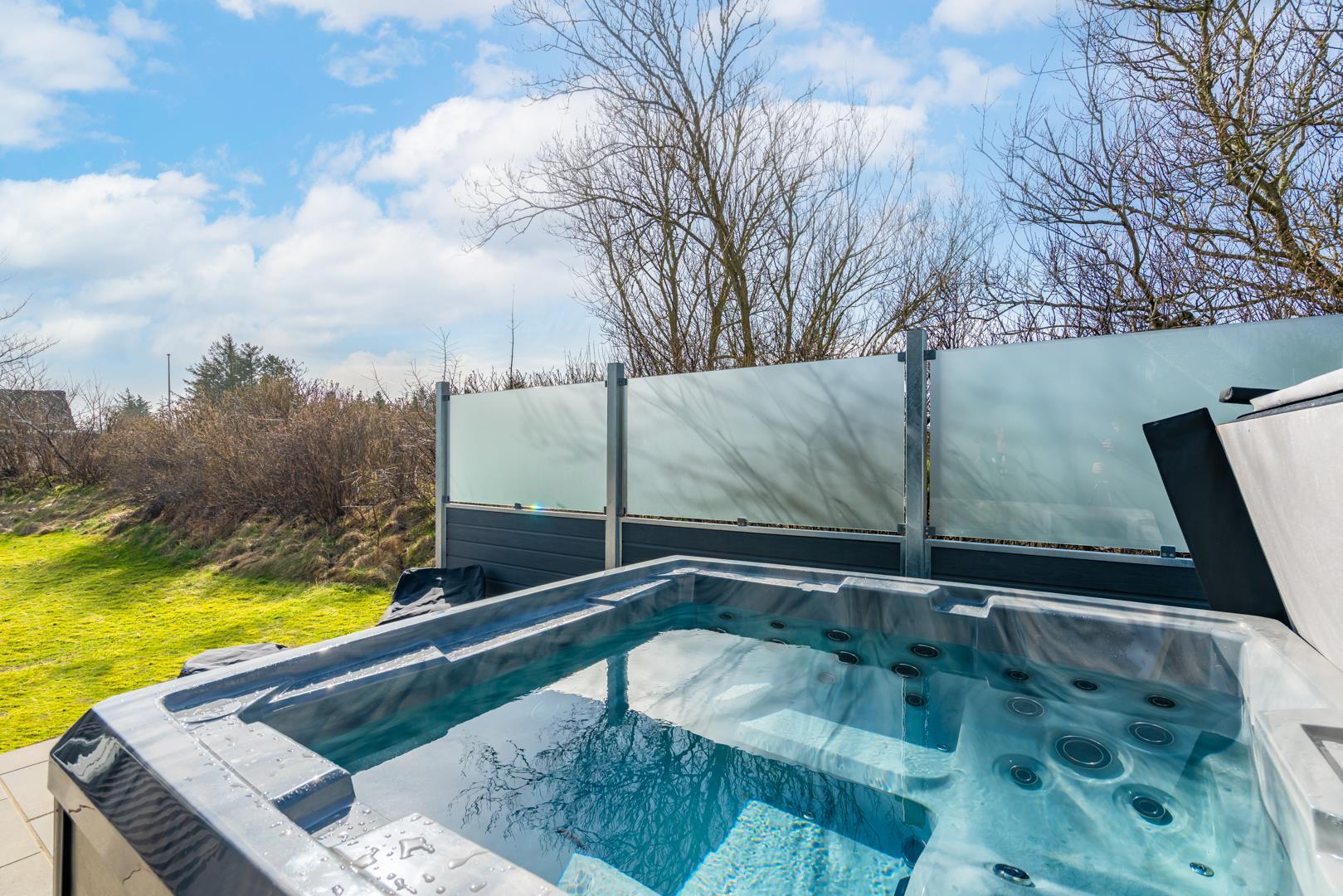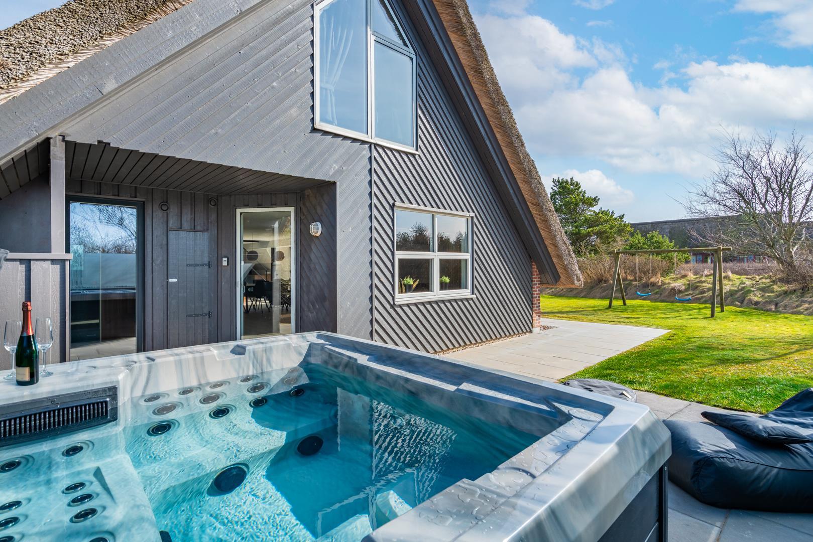 Her finder I også et af sommerhusets højdepunkter: det udendørs spabad, hvor I kan slappe af under åben himmel efter en dag fuld af oplevelser. Ved siden af ligger en udendørs bruser, som er ideel efter en tur i saunaen eller en dag ved stranden.