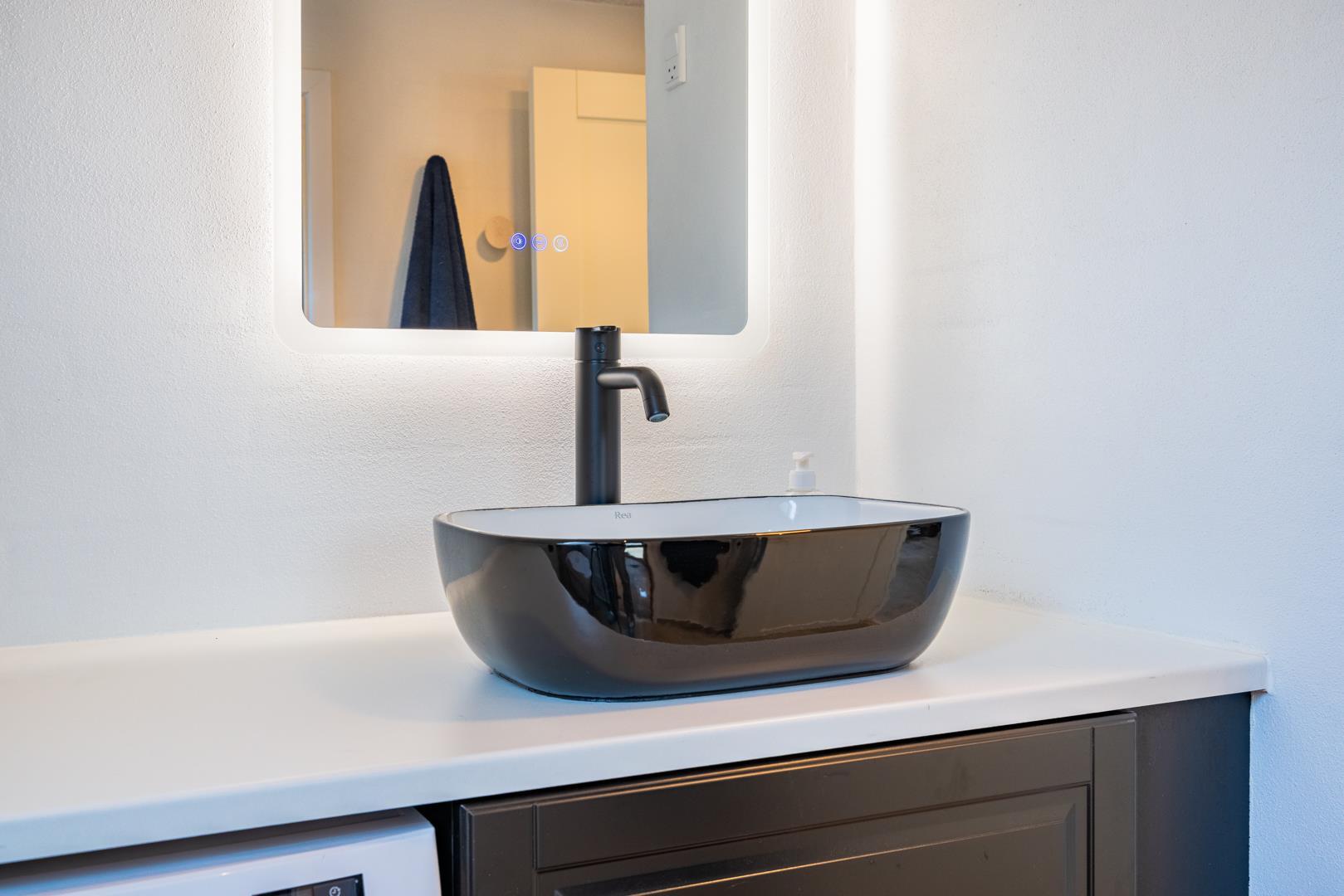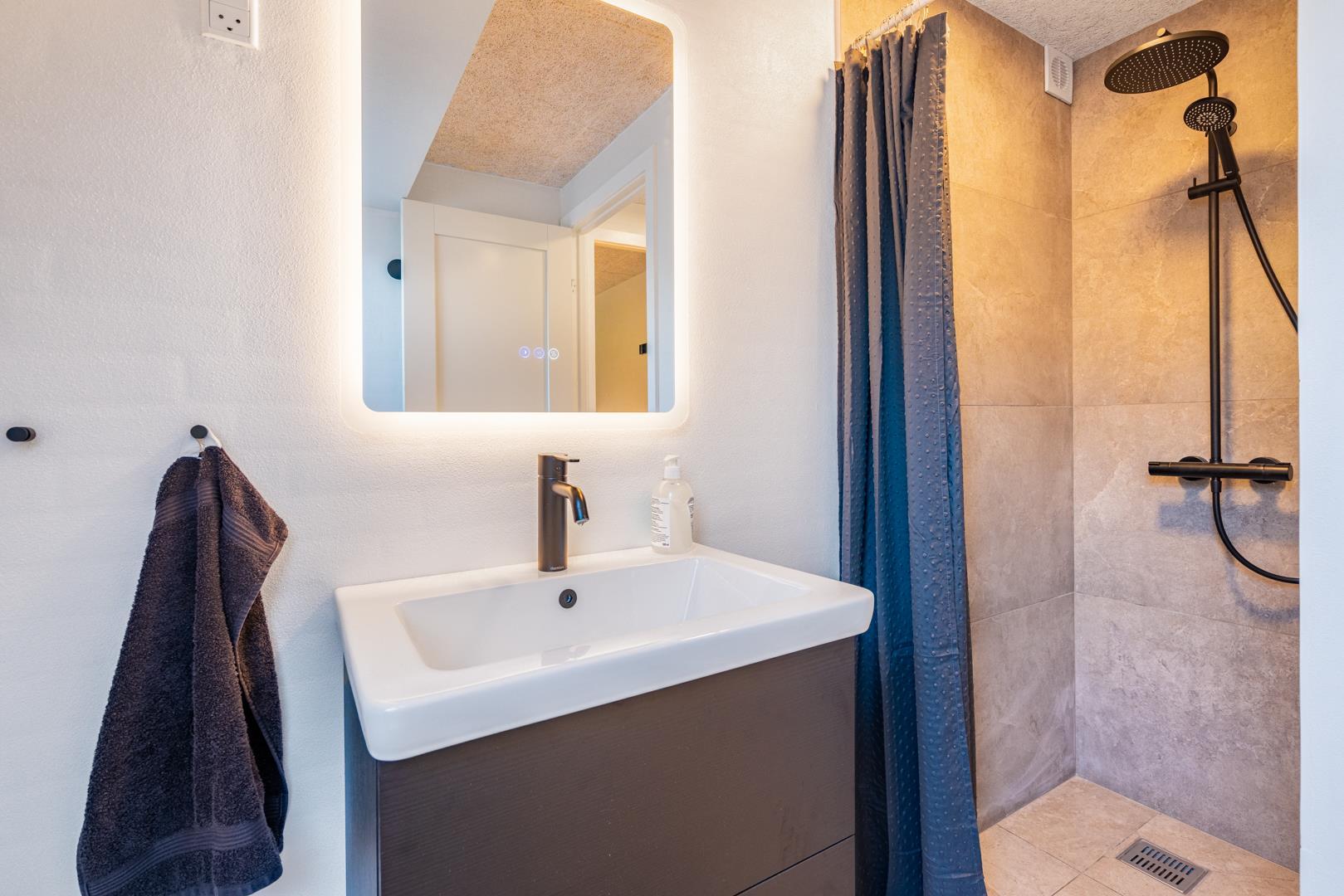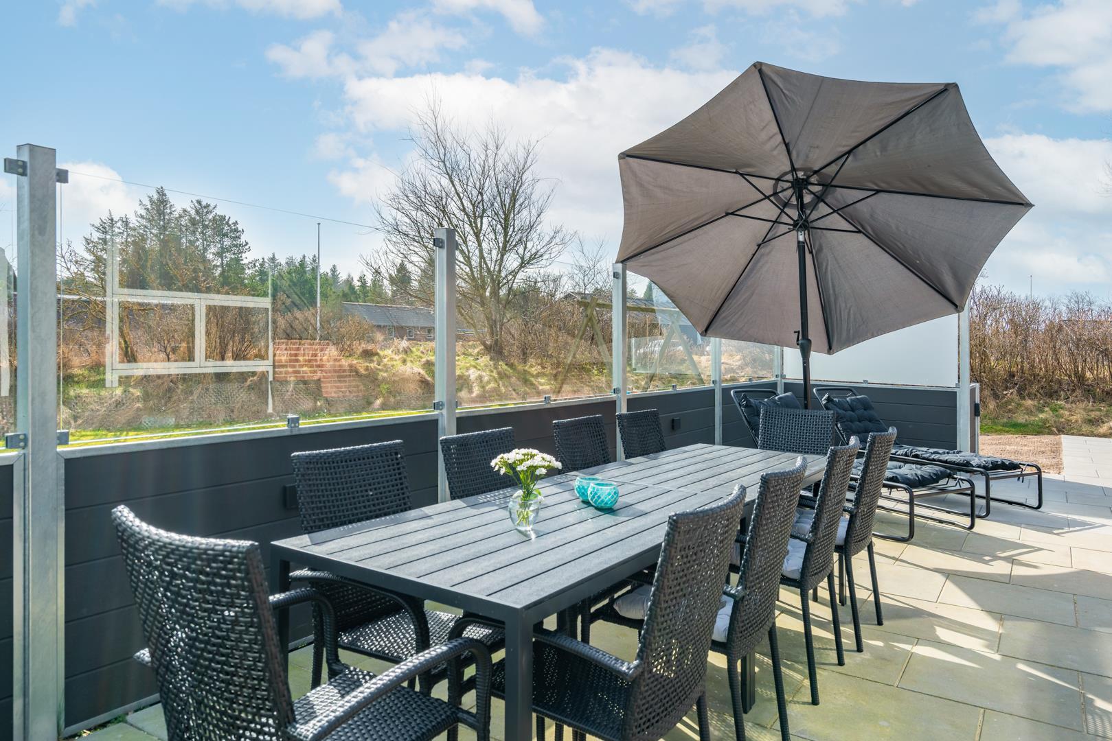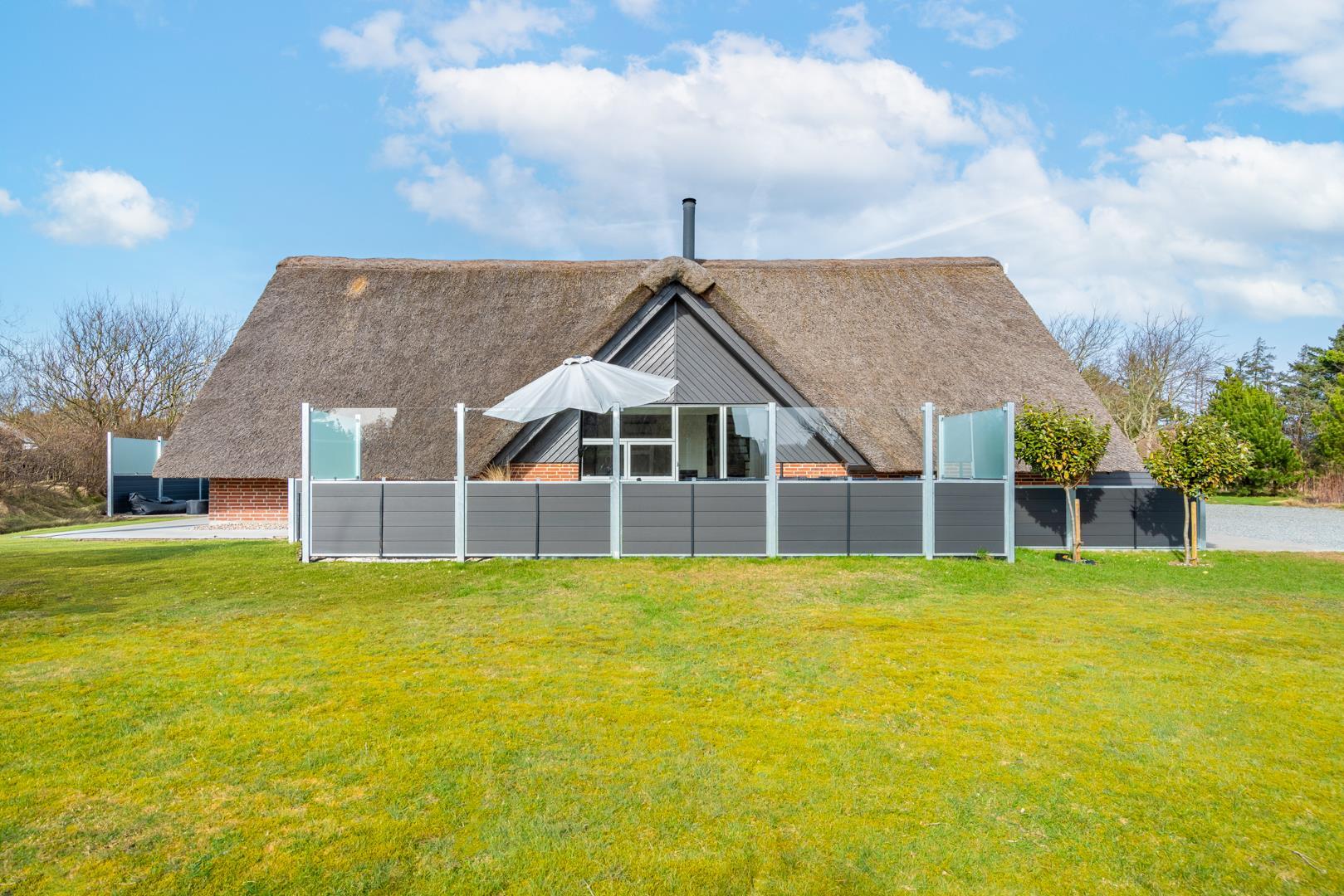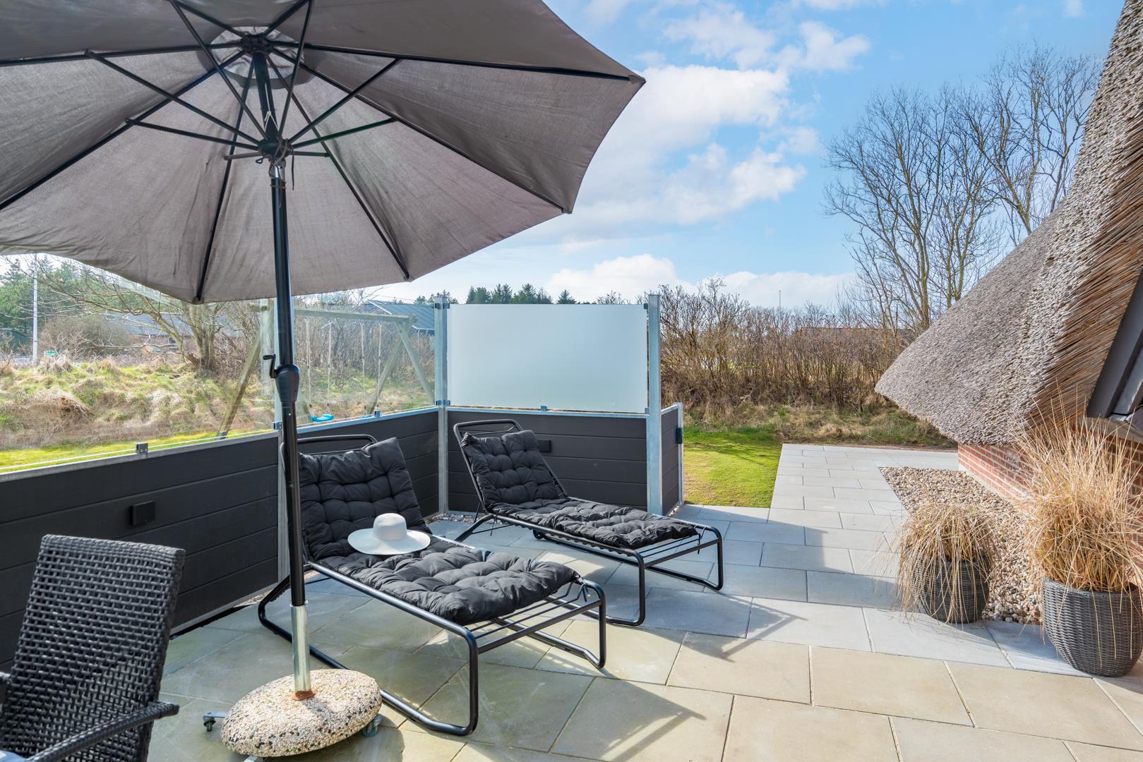 Her finder I også et af sommerhusets højdepunkter: det udendørs spabad, hvor I kan slappe af under åben himmel efter en dag fuld af oplevelser. Ved siden af ligger en udendørs bruser, som er ideel efter en tur i saunaen eller en dag ved stranden.