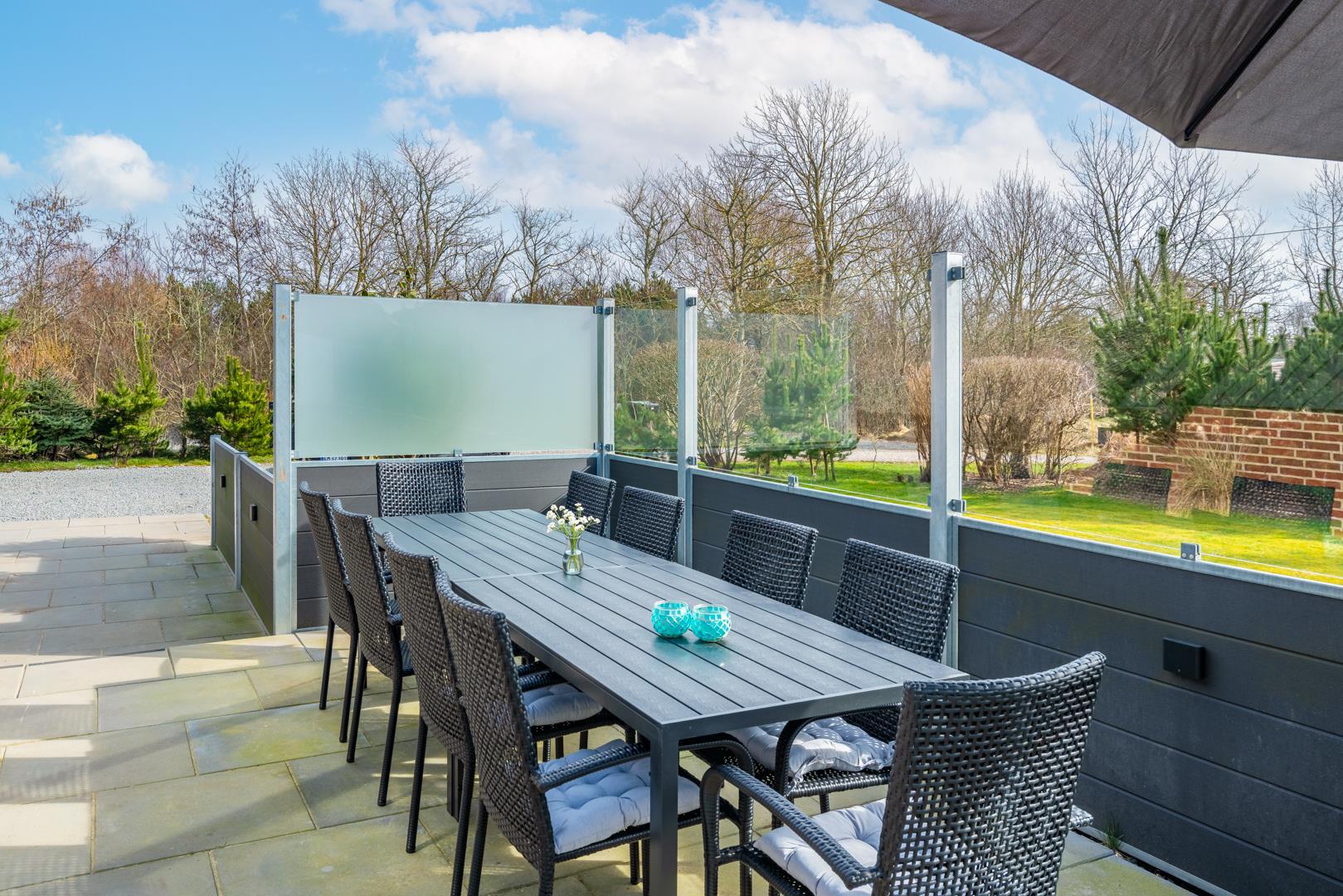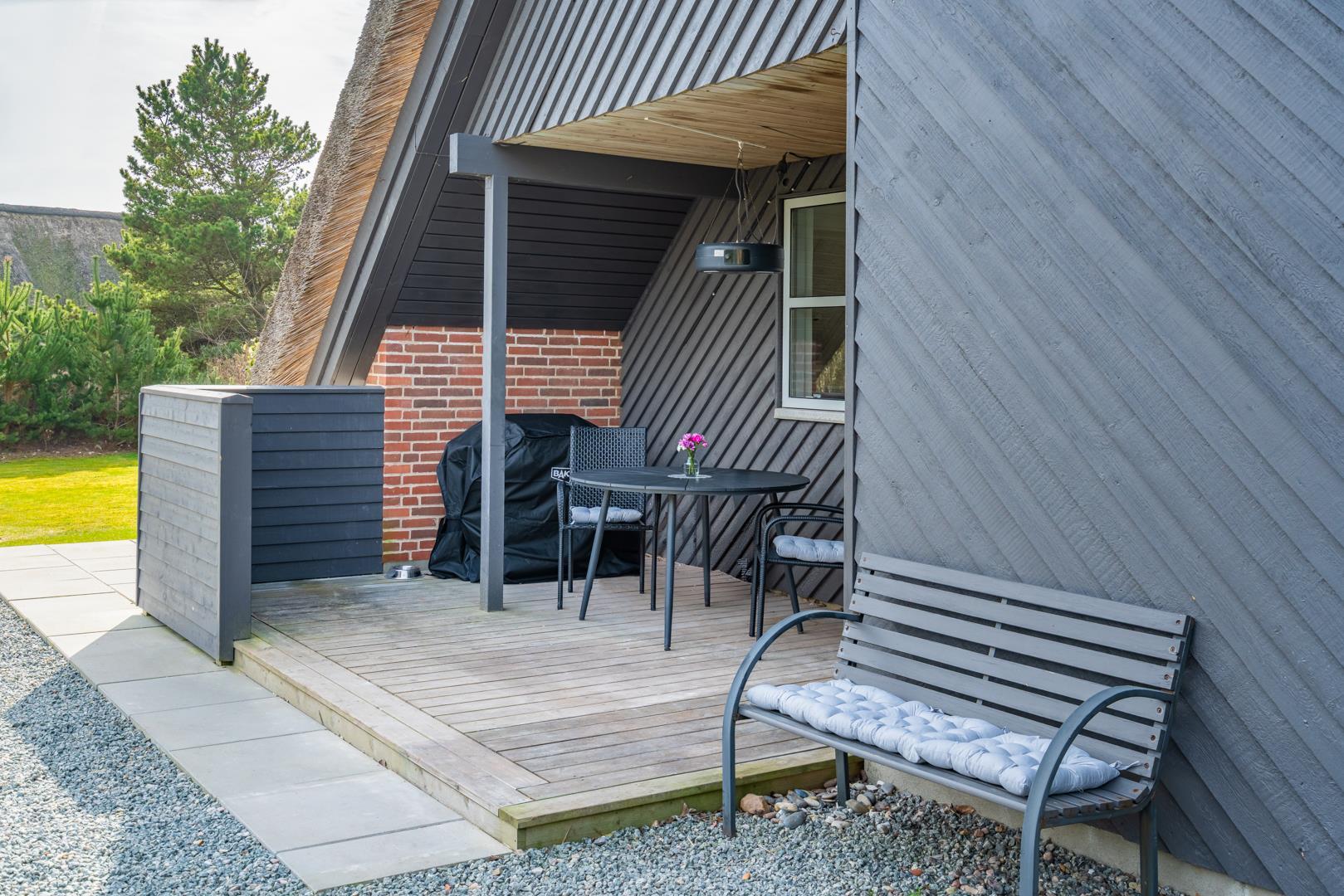 Udendørs venter en dejlig terrasse og et roligt, privat område omgivet af buske og træer.