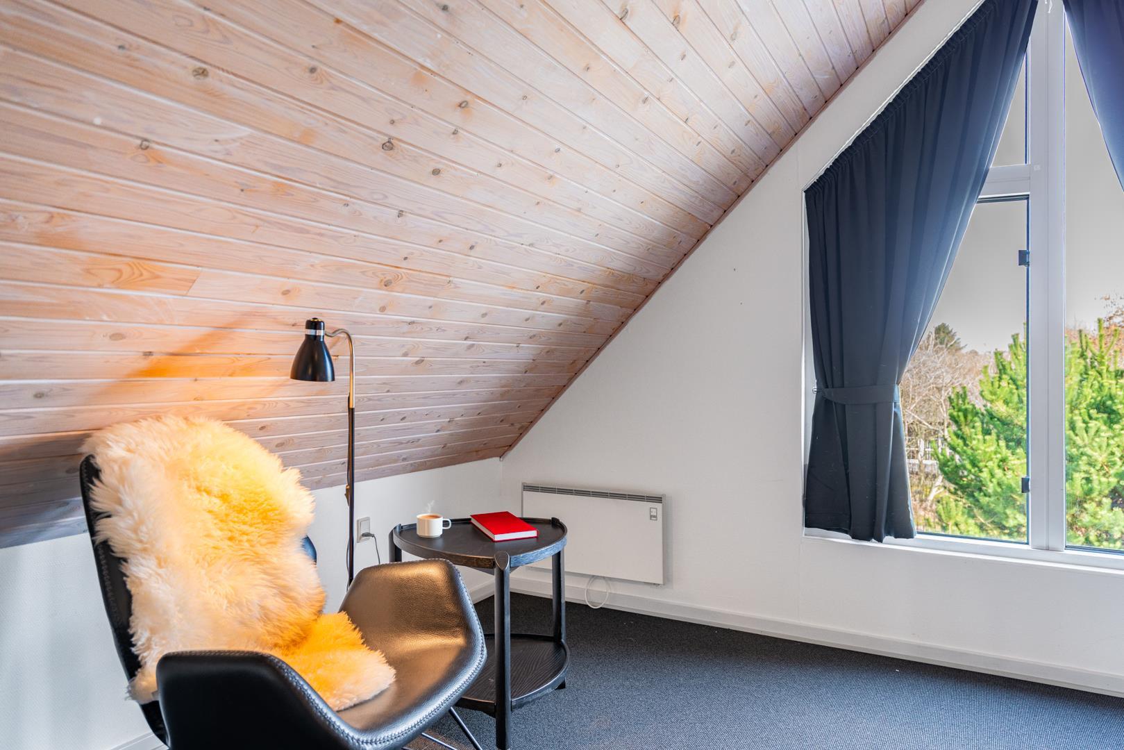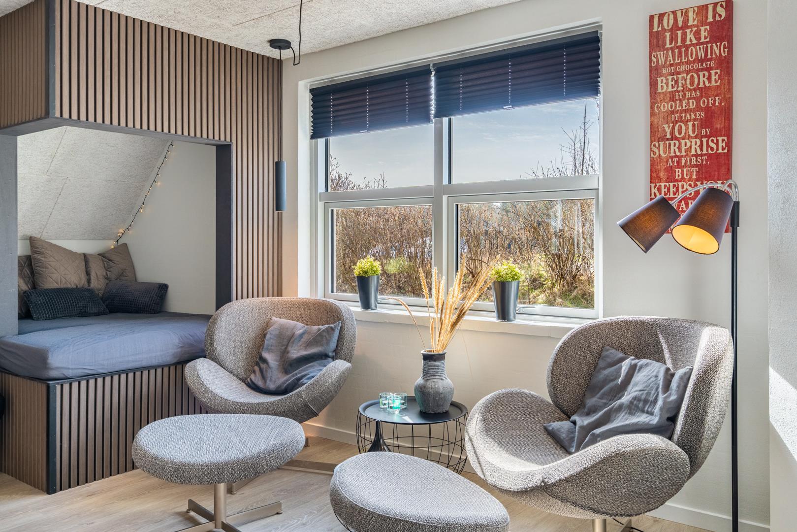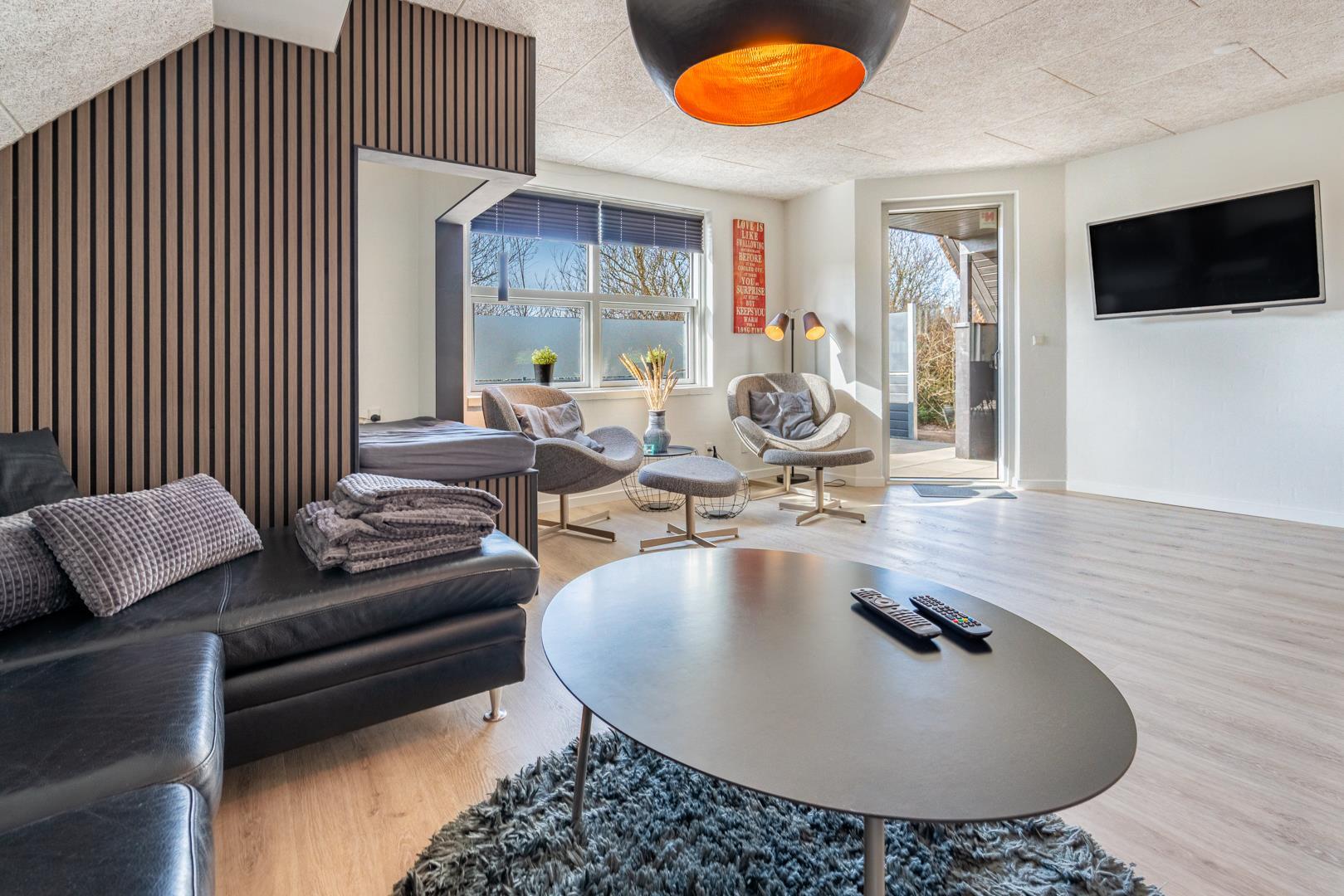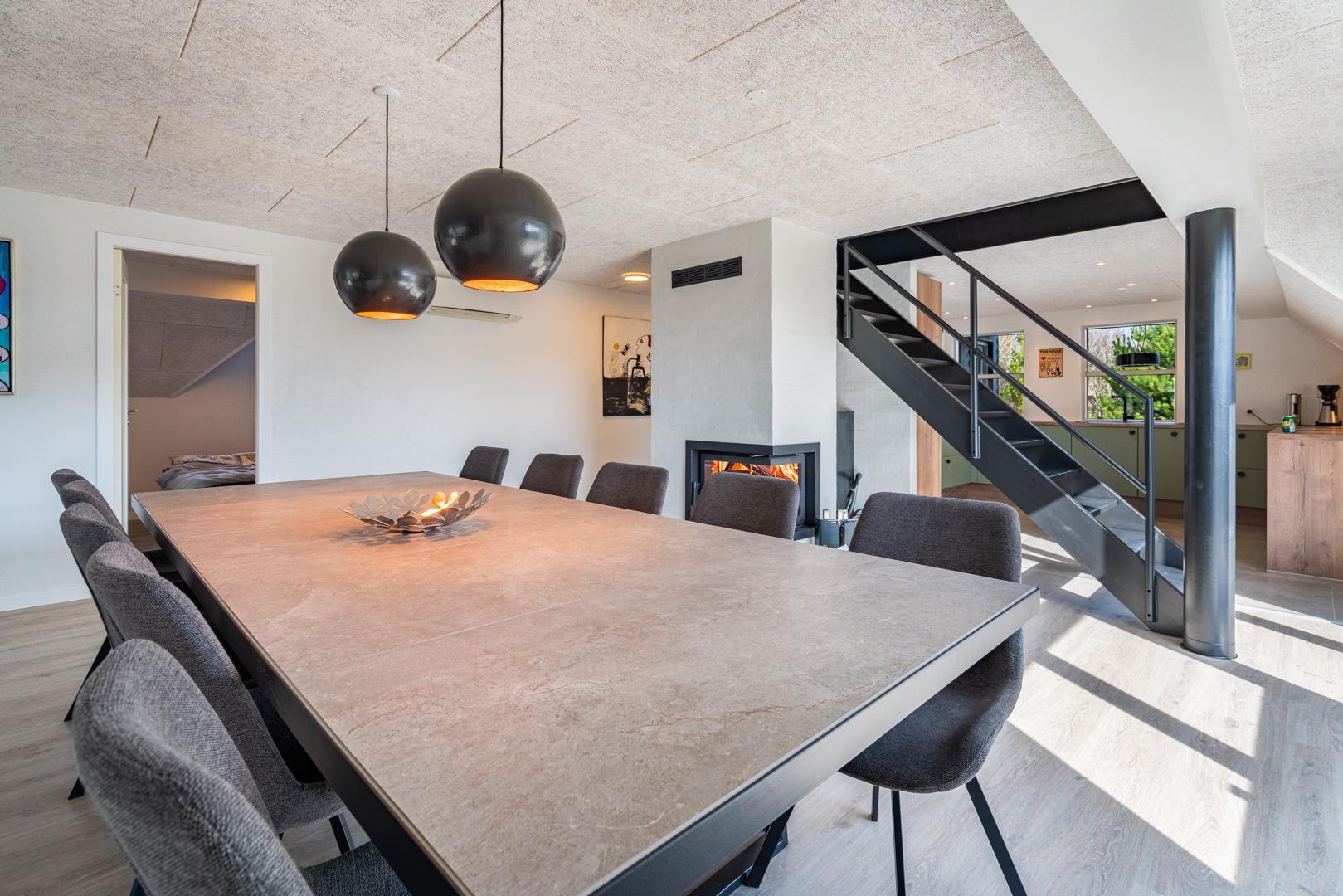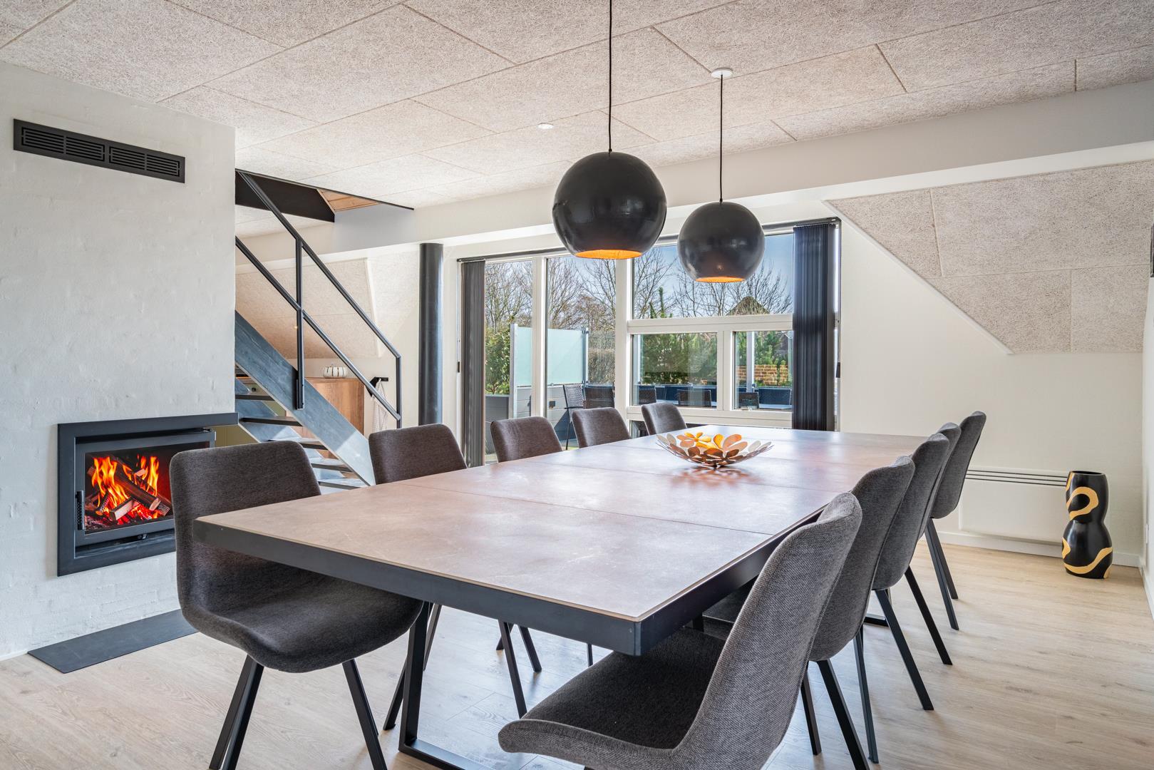 I stuen skaber brændeovnen den klassiske feriehusstemning, mens en energivenlige varmepumpe sørger for et behageligt indeklima året rundt. Fra opholdsrummet er der direkte adgang til terrassen, så inde- og udeliv nemt flyder sammen.