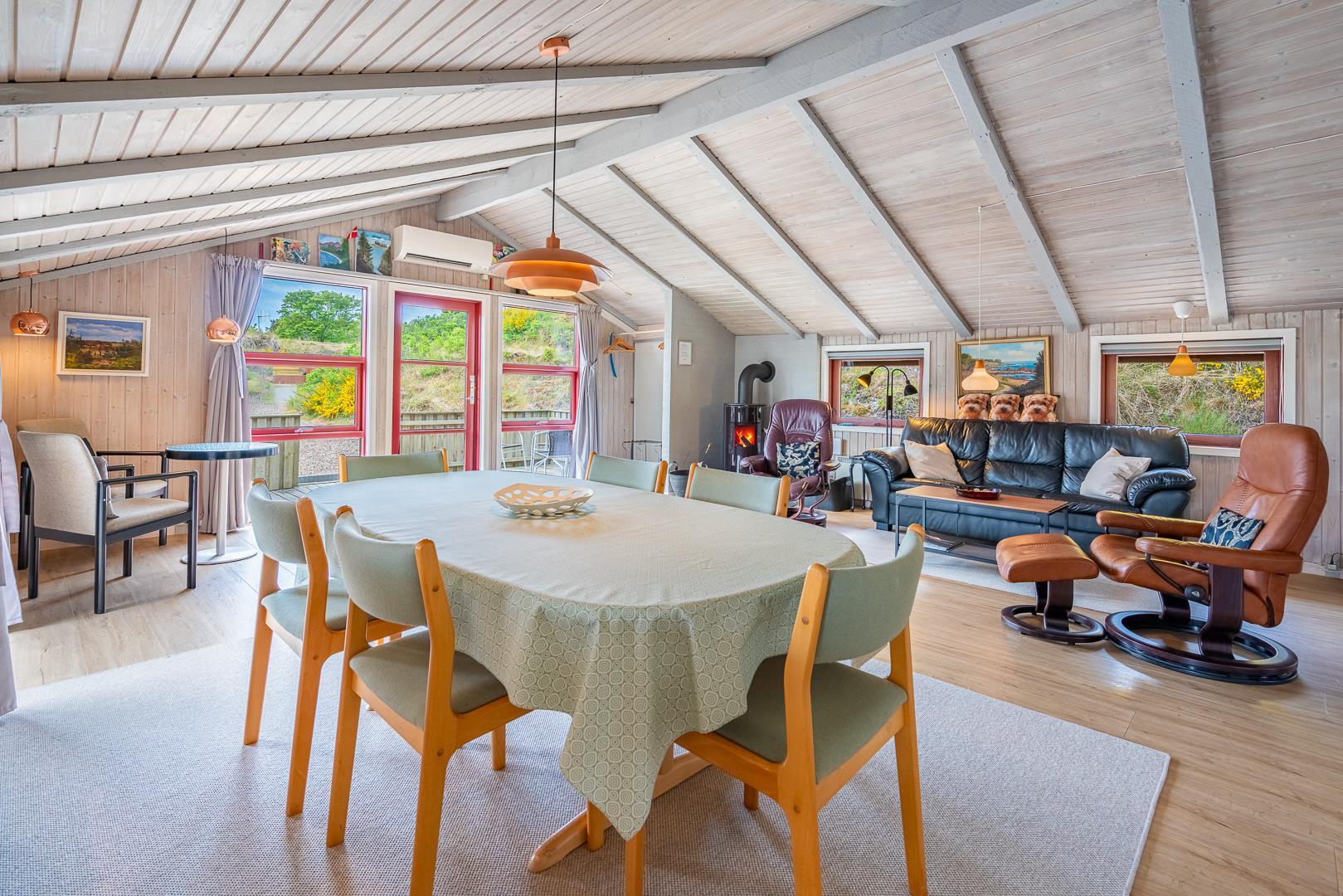 Timianvej 13 på 92 m² byder på god plads til velvære. Det lyse opholdsrum med brændeovn skaber en hyggelig atmosfære – ideelt til afslappede aftener efter en lang dag på stranden. Takket være varmepumpen har sommerhuset en behagelig temperatur hele året rundt.