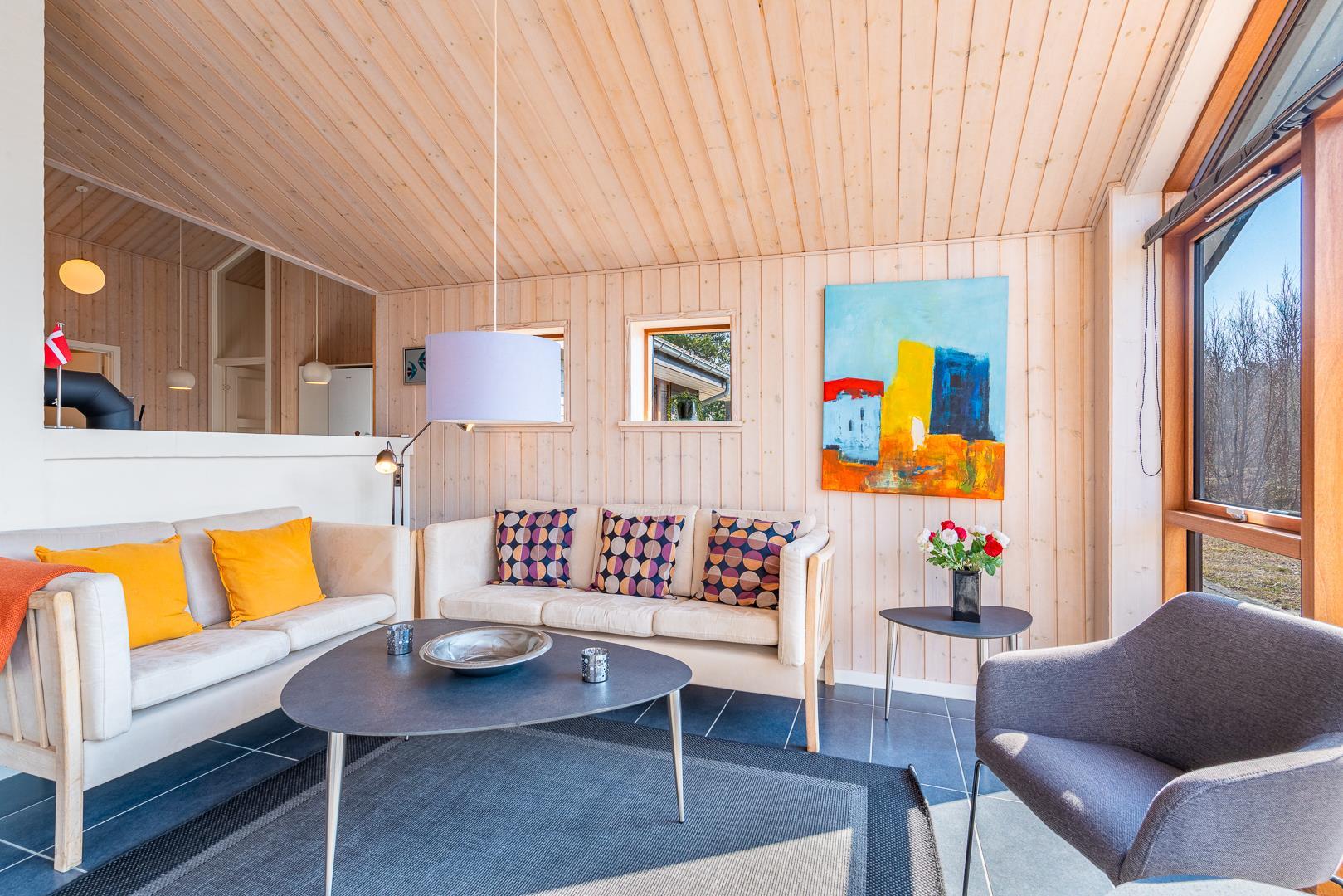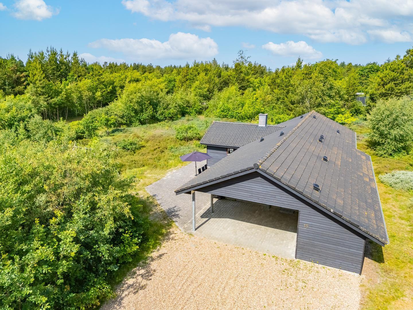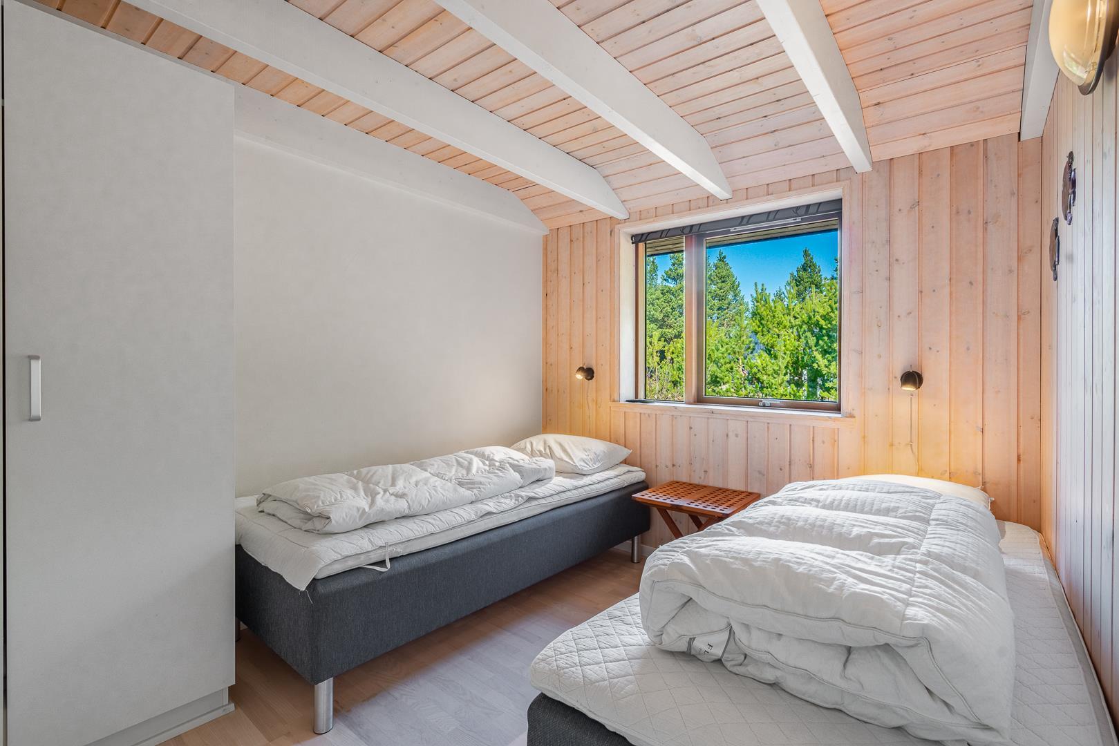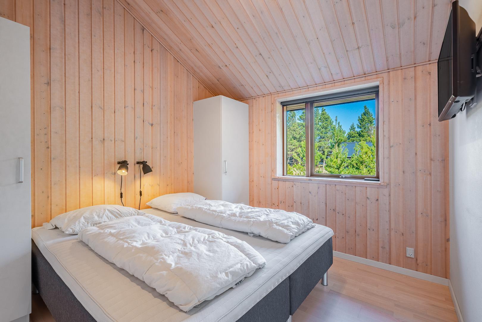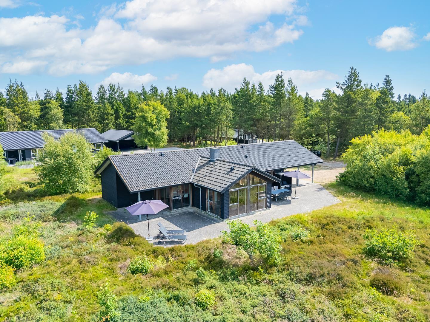 Huset titter frem i en lysning blandt nåletræer og stedsegrøn bevoksning. Indenfor er der skruet op for den hyggelige stemning, uden at der er gået på kompromis med moderne komfort. Lofterne går til kip og store vinduespartier lader lyset strømme ubesværet ind fra syd. Opholdsrummet byder på et tidløst køkken og en hyggelig afdeling med spiseplads og sofahjørne. Der er desuden adgang til en hems, hvor ungerne kan lege sørøvere og prinsesser. Huset er udstyret med TV i alle soverum, to højstole, barneseng og vaskefaciliteter.