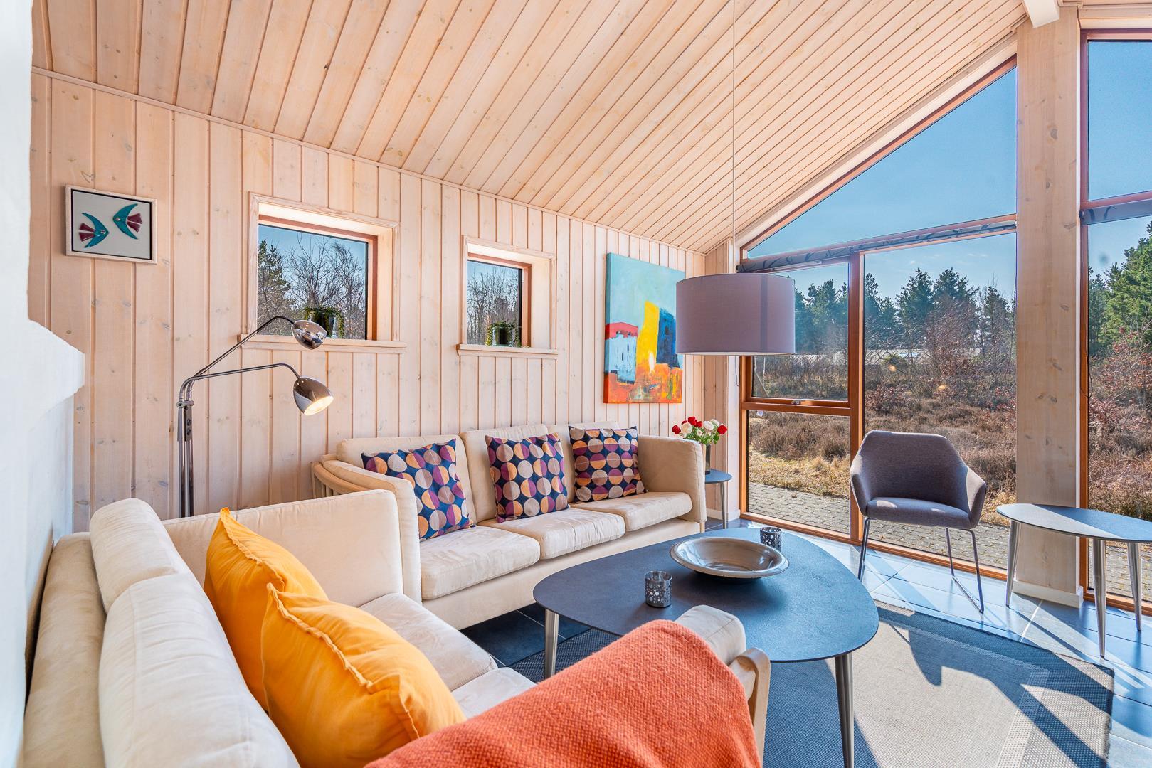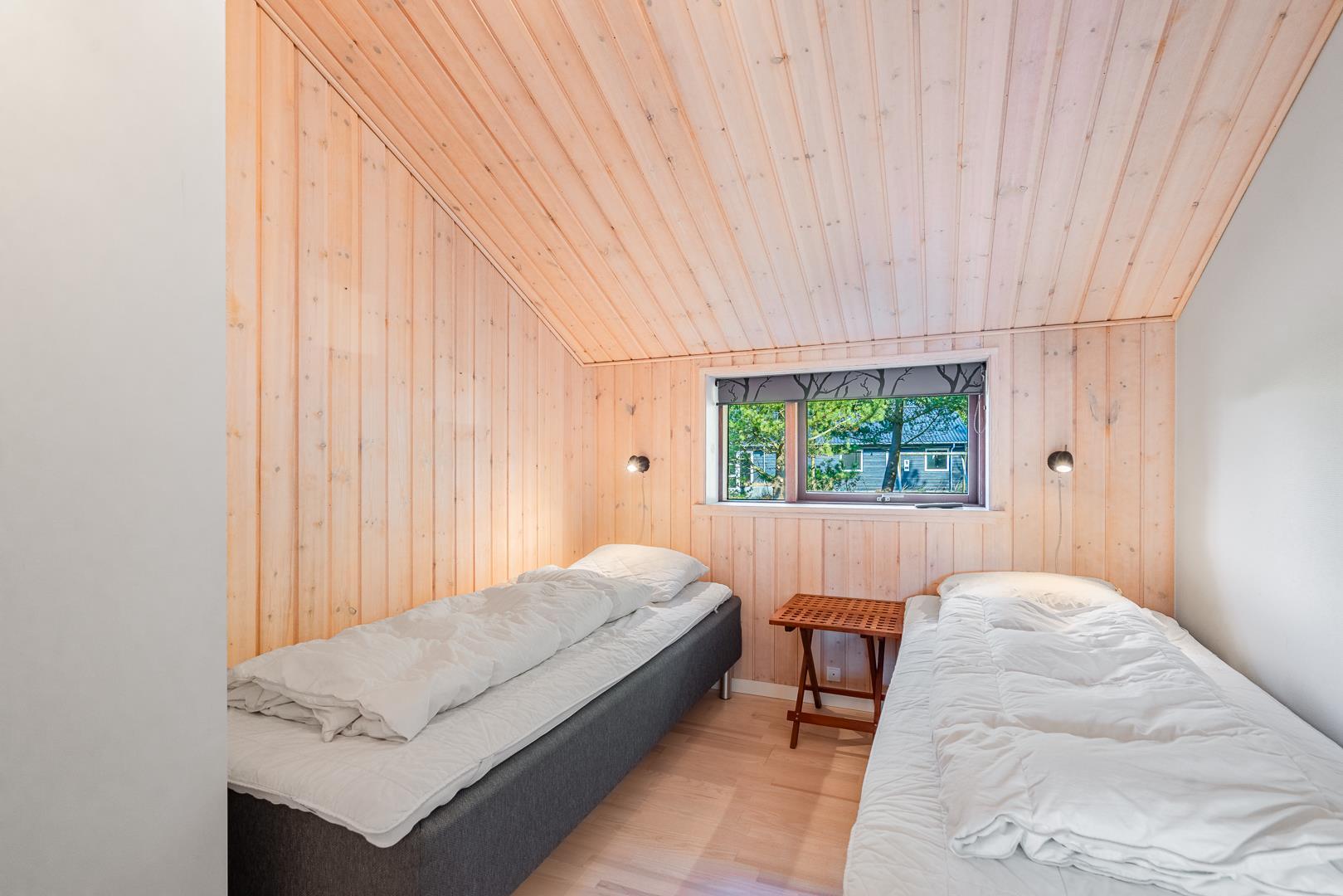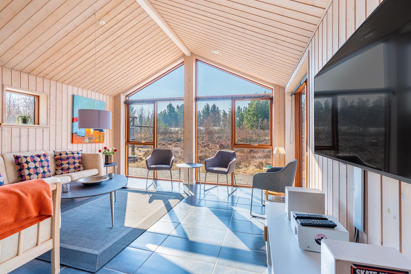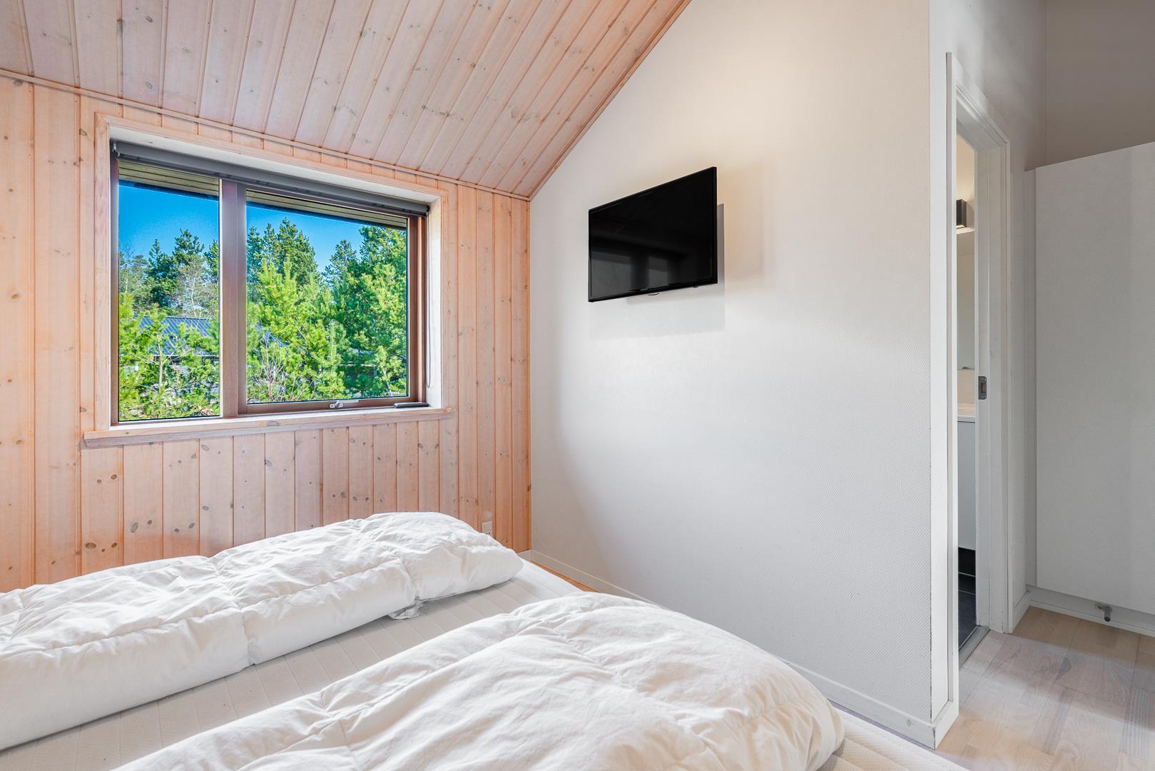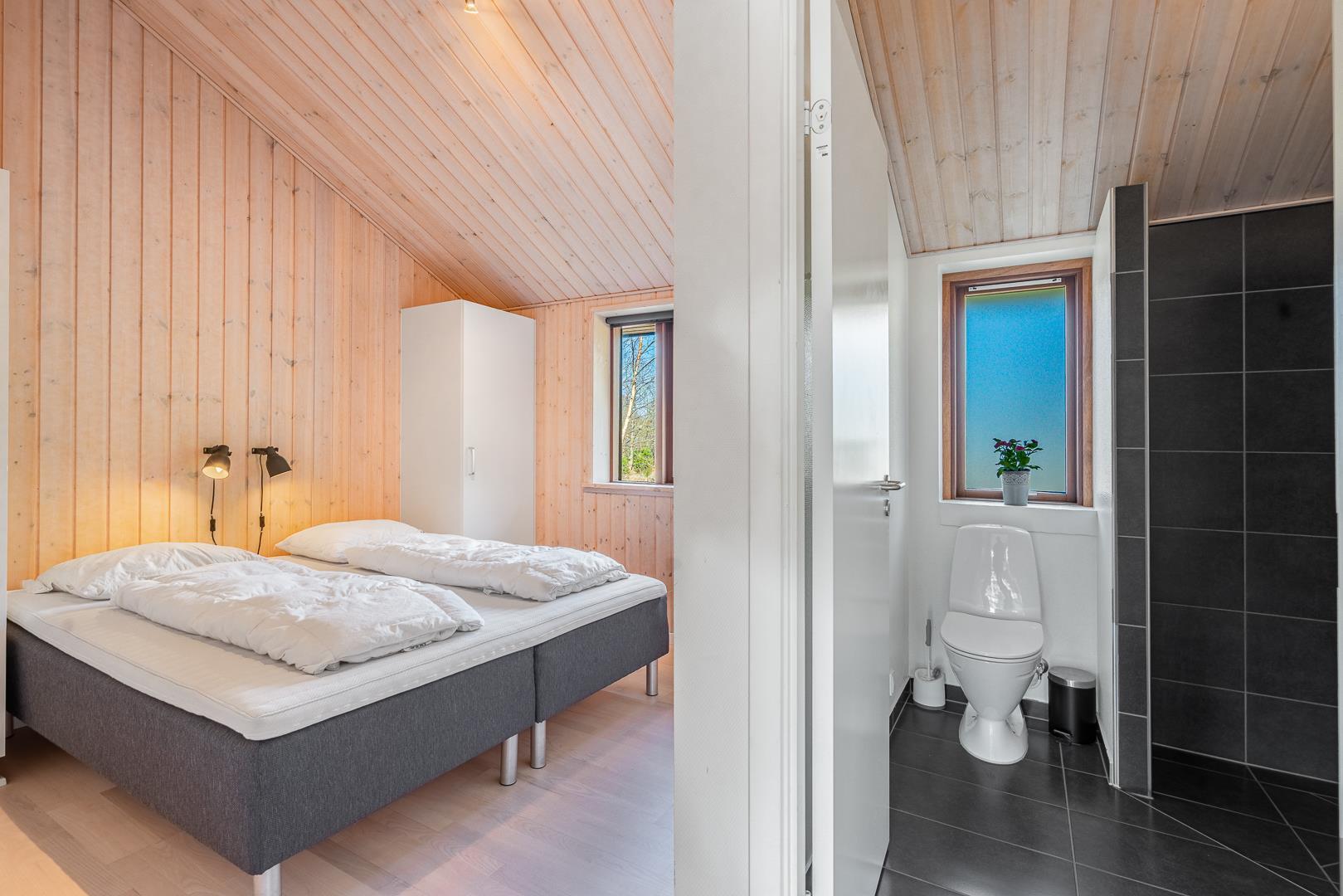 Huset titter frem i en lysning blandt nåletræer og stedsegrøn bevoksning. Indenfor er der skruet op for den hyggelige stemning, uden at der er gået på kompromis med moderne komfort. Lofterne går til kip og store vinduespartier lader lyset strømme ubesværet ind fra syd. Opholdsrummet byder på et tidløst køkken og en hyggelig afdeling med spiseplads og sofahjørne. Der er desuden adgang til en hems, hvor ungerne kan lege sørøvere og prinsesser. Huset er udstyret med TV i alle soverum, to højstole, barneseng og vaskefaciliteter.