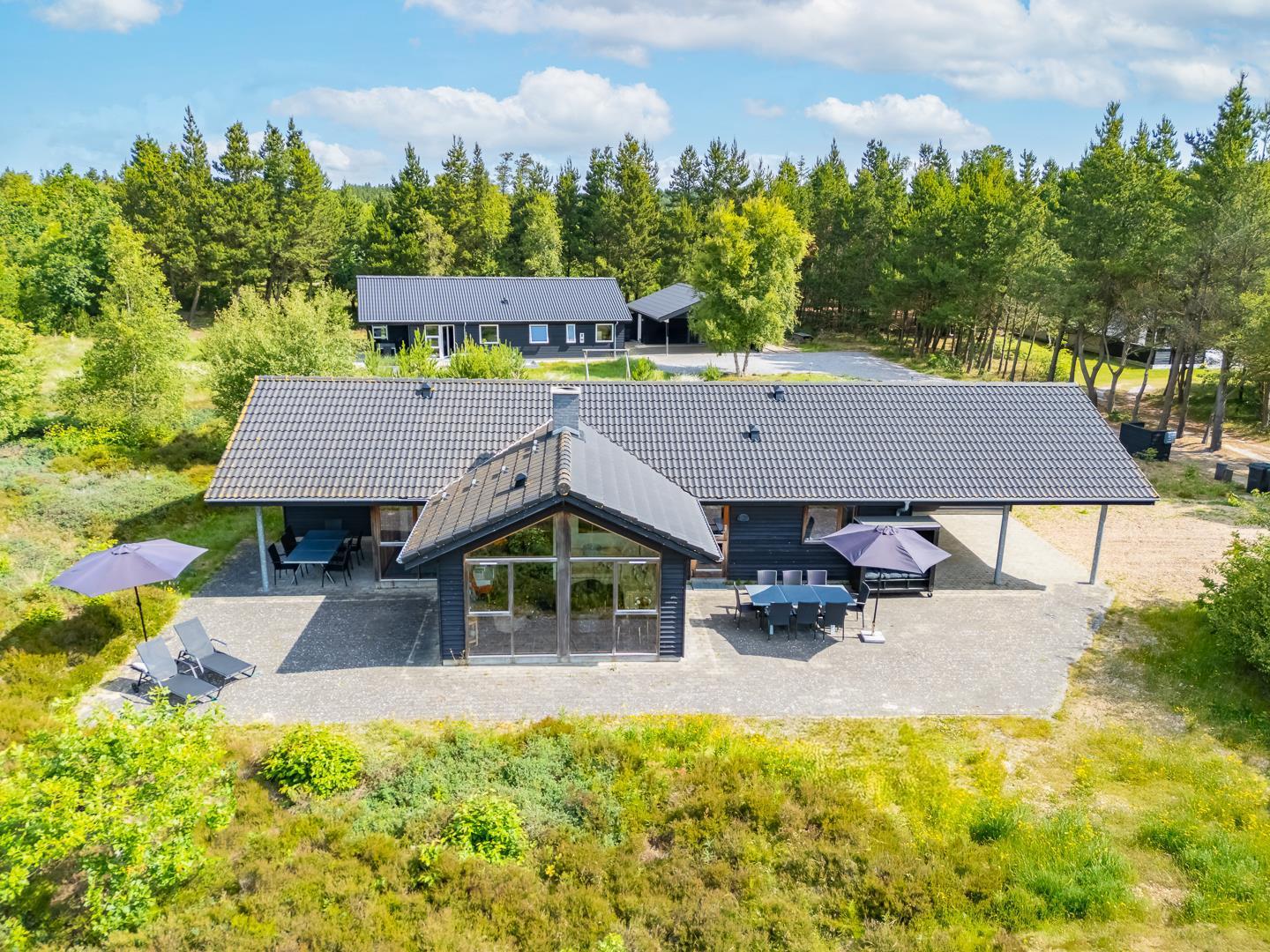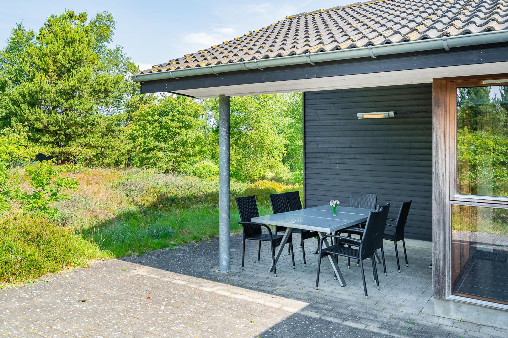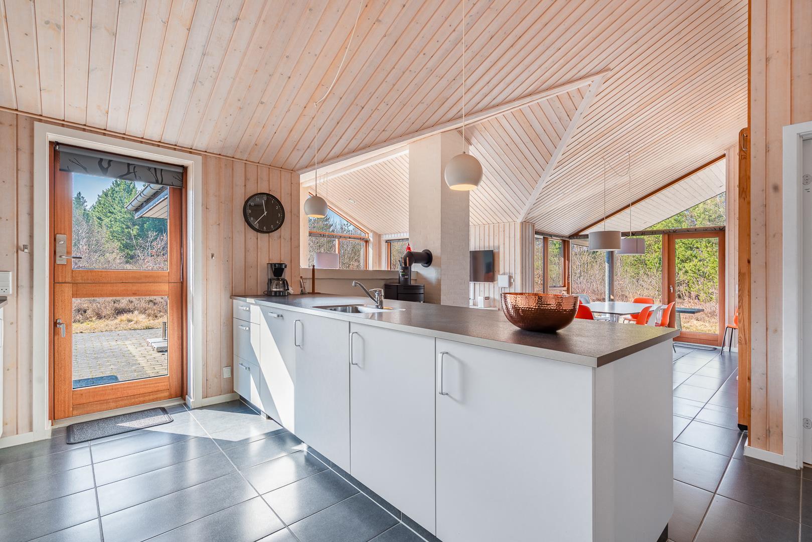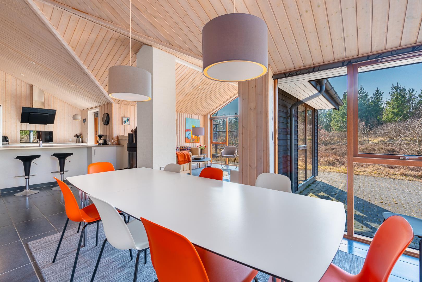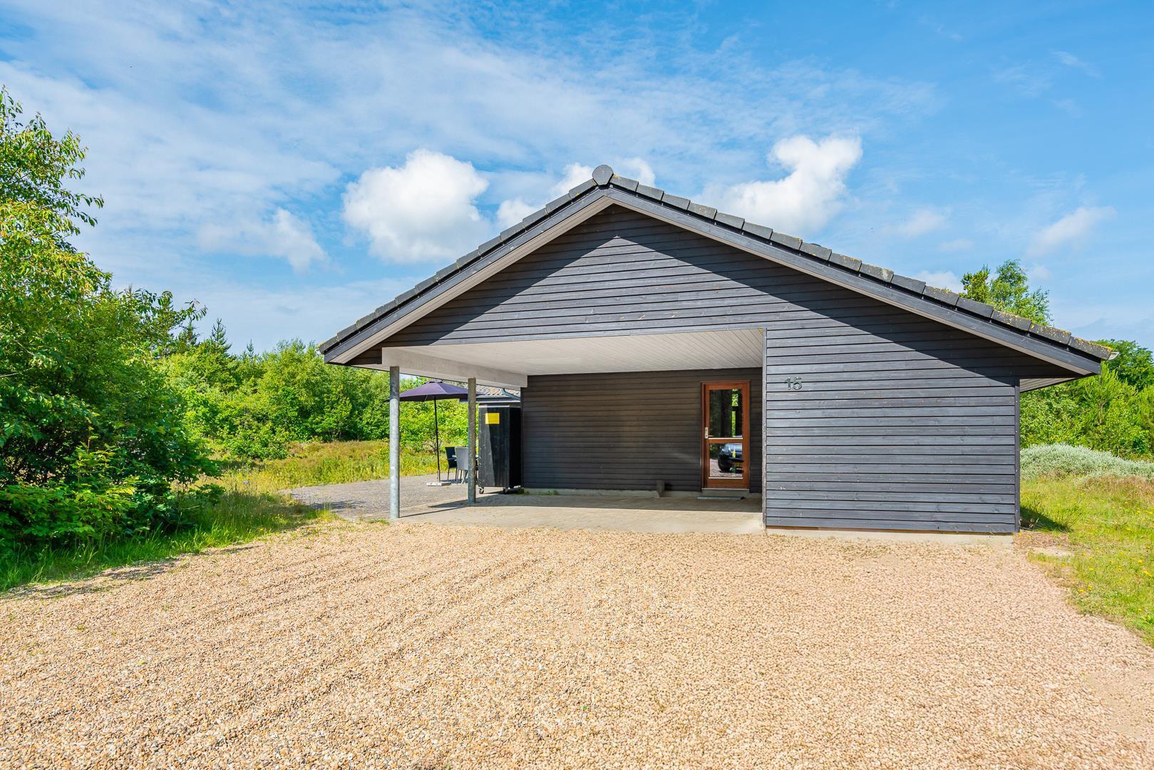 Huset titter frem i en lysning blandt nåletræer og stedsegrøn bevoksning. Indenfor er der skruet op for den hyggelige stemning, uden at der er gået på kompromis med moderne komfort. Lofterne går til kip og store vinduespartier lader lyset strømme ubesværet ind fra syd. Opholdsrummet byder på et tidløst køkken og en hyggelig afdeling med spiseplads og sofahjørne. Der er desuden adgang til en hems, hvor ungerne kan lege sørøvere og prinsesser. Huset er udstyret med TV i alle soverum, to højstole, barneseng og vaskefaciliteter.