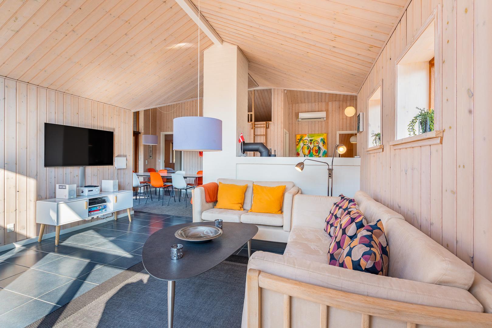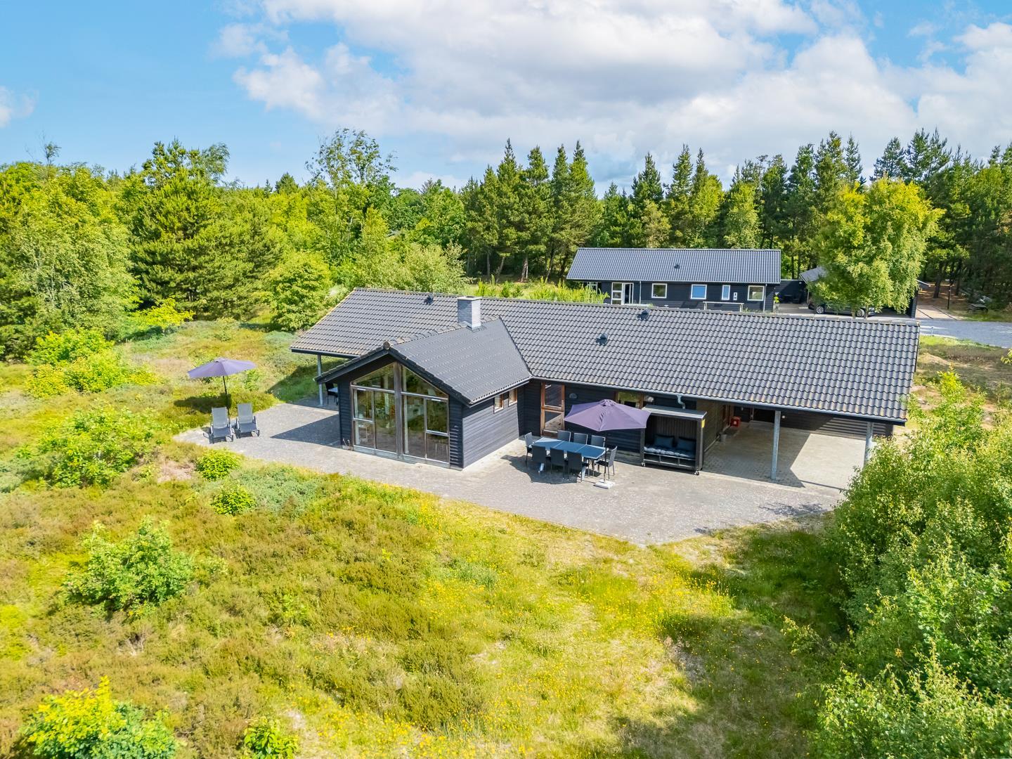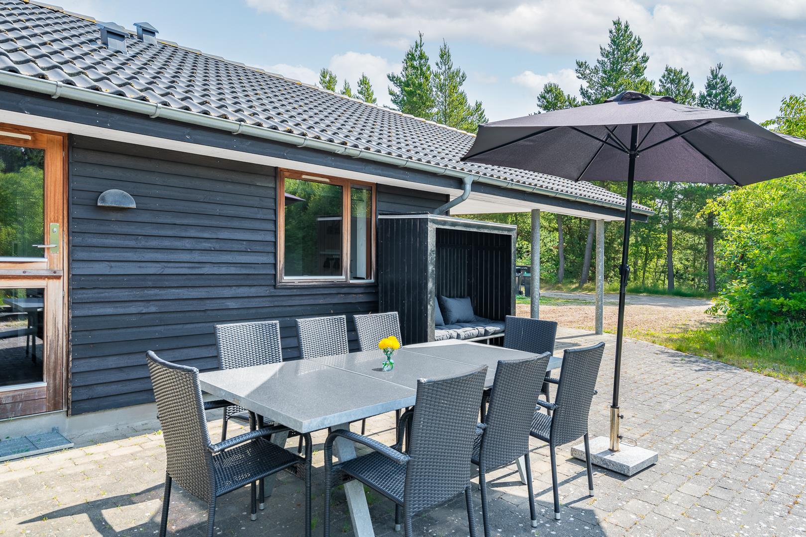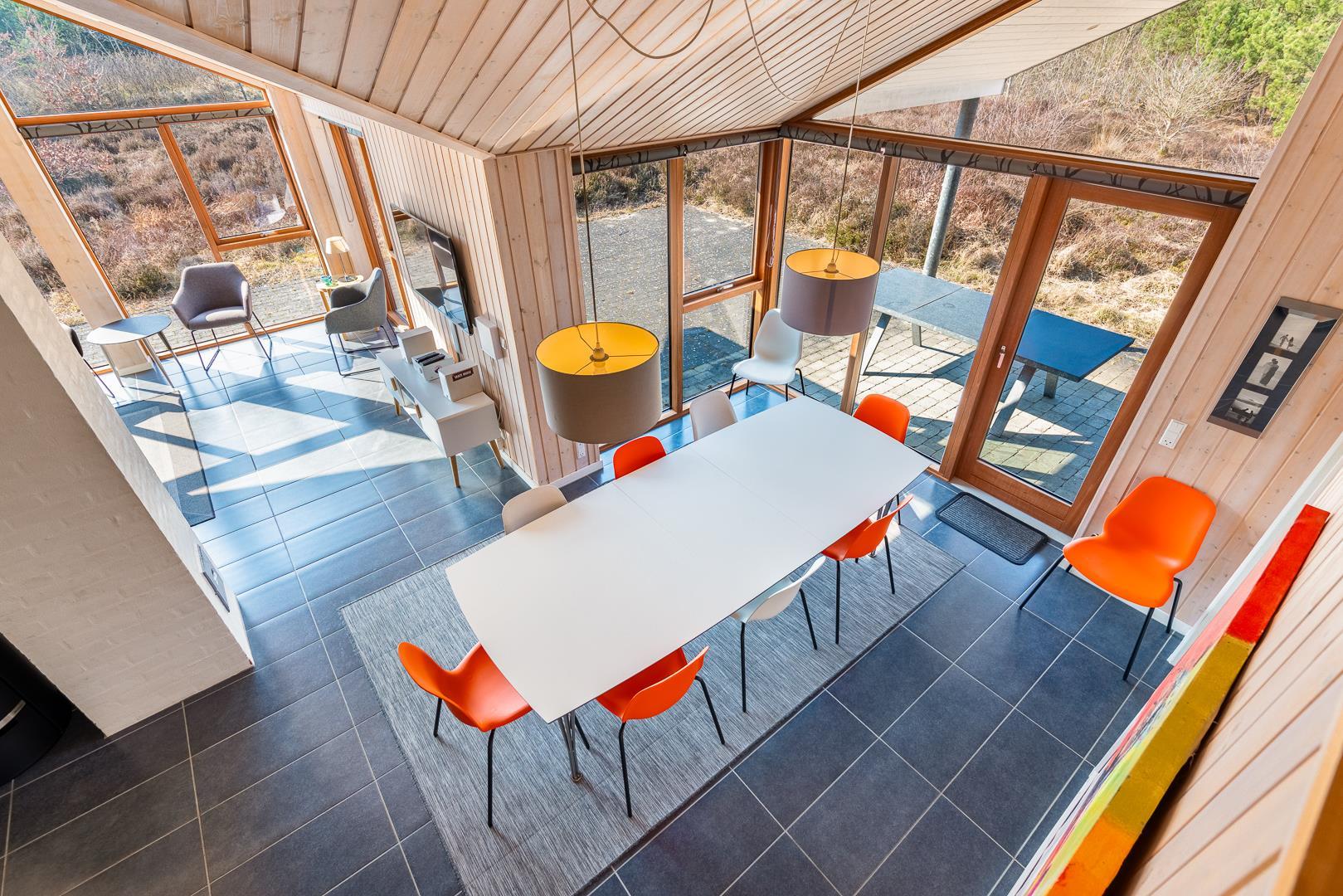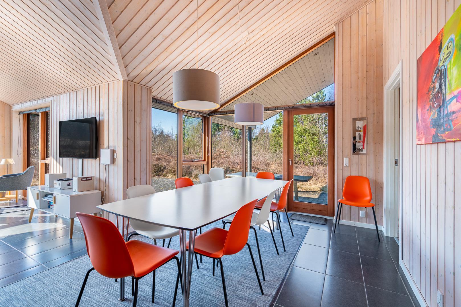 Huset titter frem i en lysning blandt nåletræer og stedsegrøn bevoksning. Indenfor er der skruet op for den hyggelige stemning, uden at der er gået på kompromis med moderne komfort. Lofterne går til kip og store vinduespartier lader lyset strømme ubesværet ind fra syd. Opholdsrummet byder på et tidløst køkken og en hyggelig afdeling med spiseplads og sofahjørne. Der er desuden adgang til en hems, hvor ungerne kan lege sørøvere og prinsesser. Huset er udstyret med TV i alle soverum, to højstole, barneseng og vaskefaciliteter.