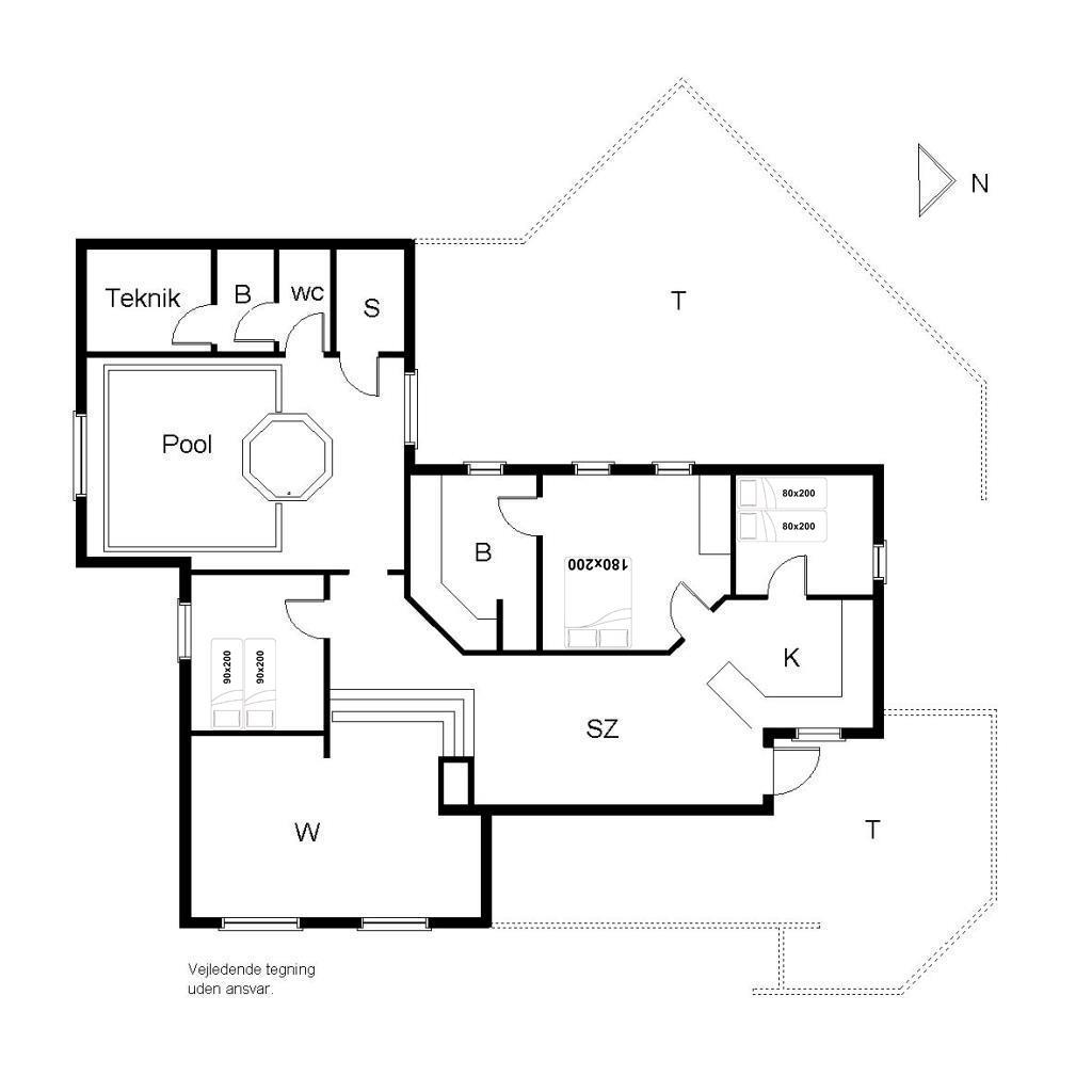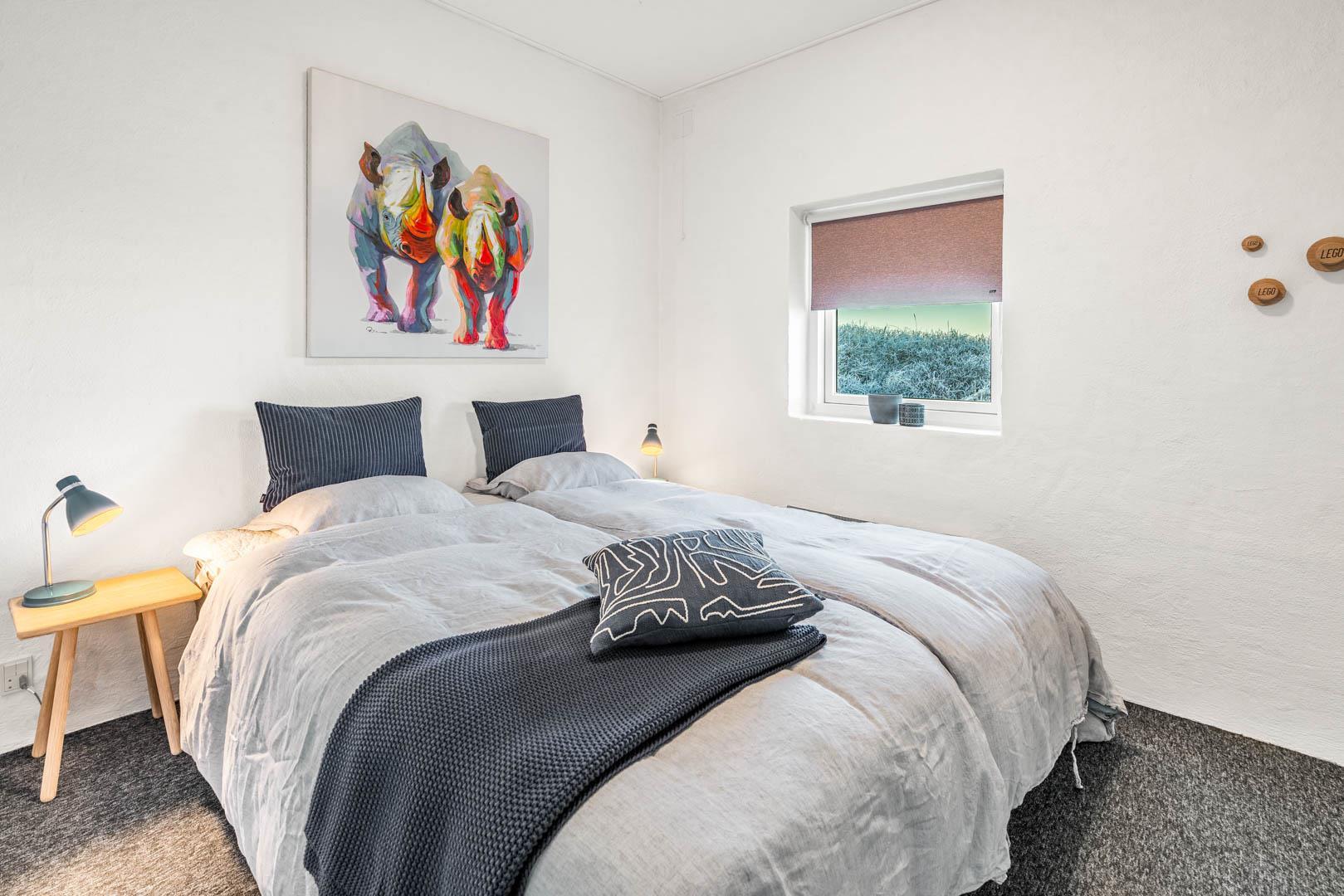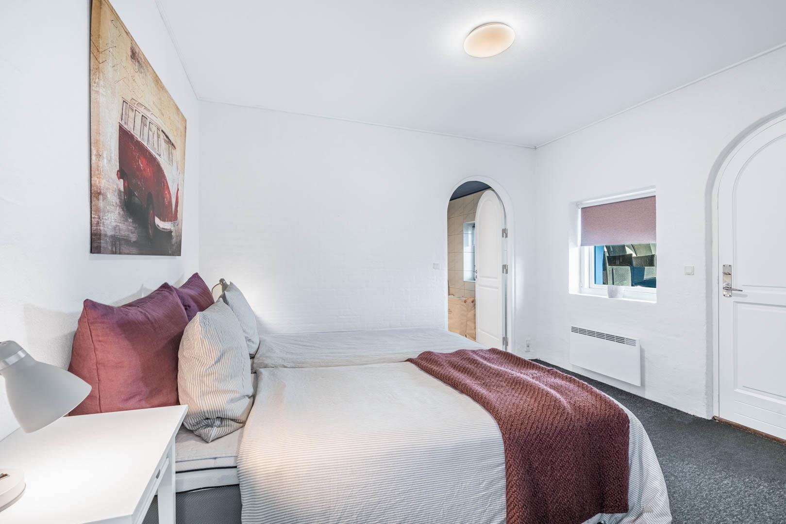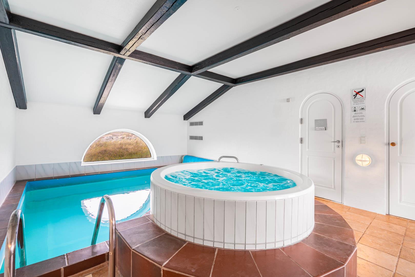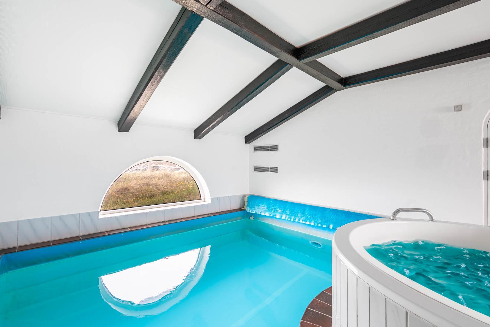 Et rundbuet vindue i samme stil som pejsen lader dagslyset danse i fine mønstre på poolens klare vand. Bassinet måler 3,8 x 3,3 meter, og poolafdelingen byder desuden på både badekar, sauna og badeværelse. Husets andet badeværelse ligger i værelsesafdelingen. Der er plads til seks overnattende feriegæster i huset, som er indrettet med to dobbeltværelser og et tvillingeværelse med enkeltsenge.