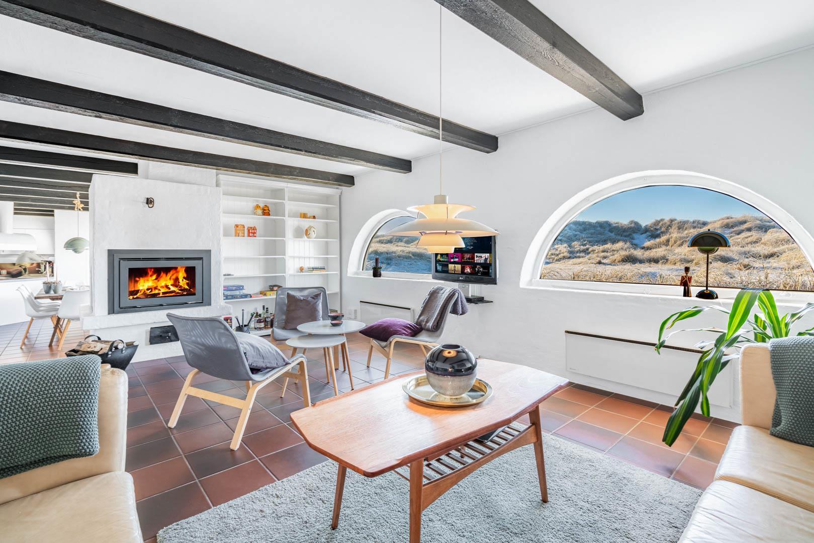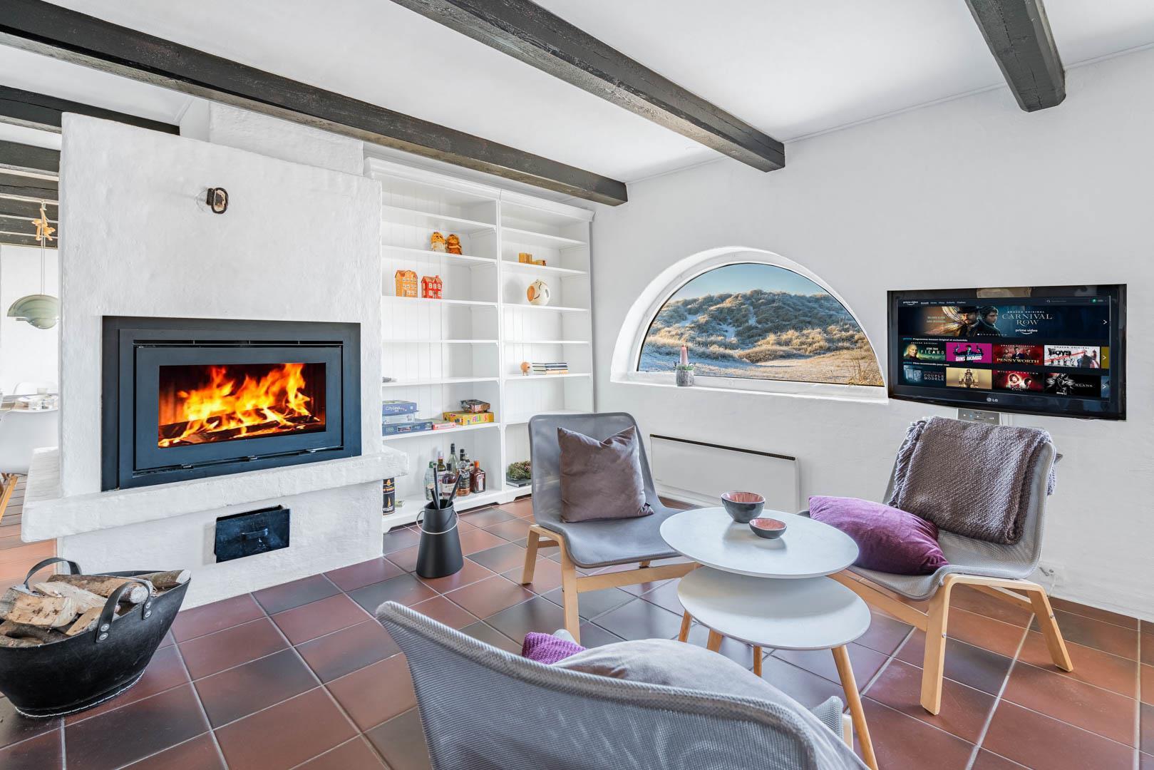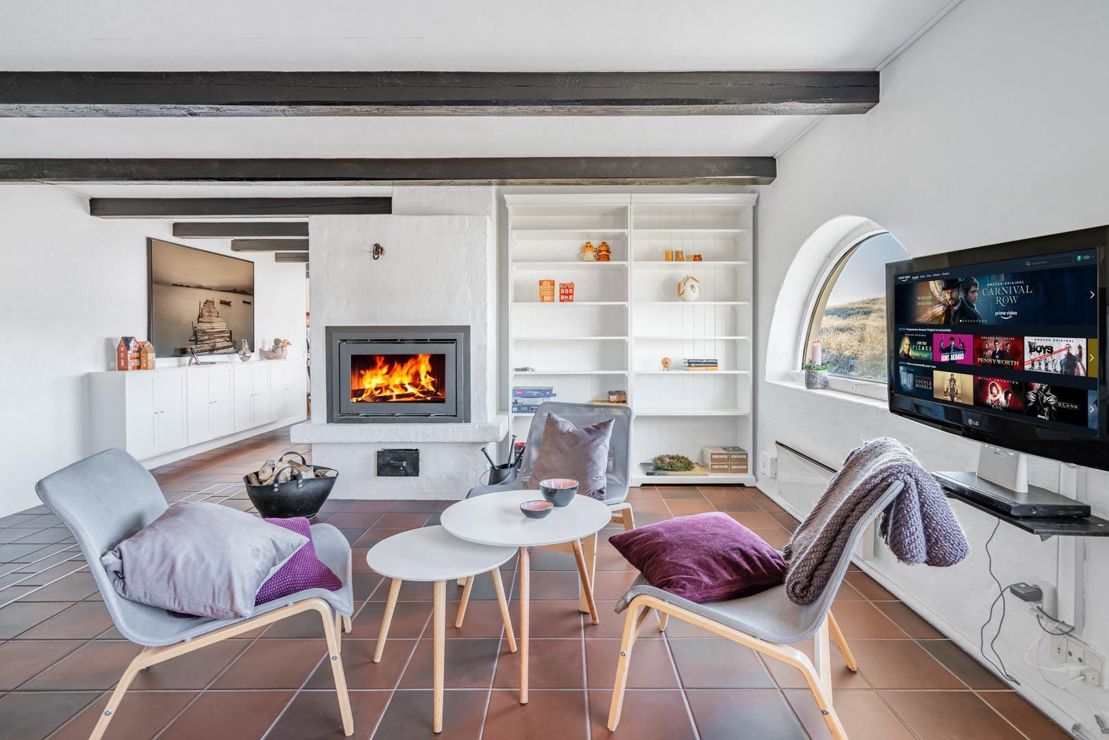 Der bydes til fællesmiddage, brætspil og afslapning i husets åbne opholdsrum, der består af en lys spiseplads, et pænt køkken og en let hævet stue. Midt i rummet er spreder en rundbuet åben pejs varme og spansk stemning.