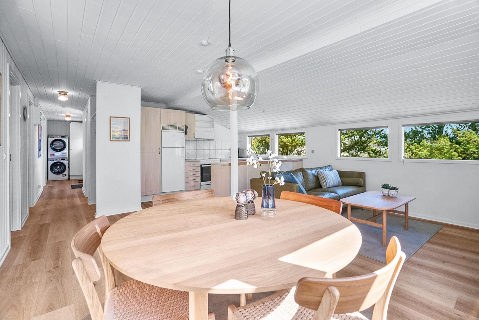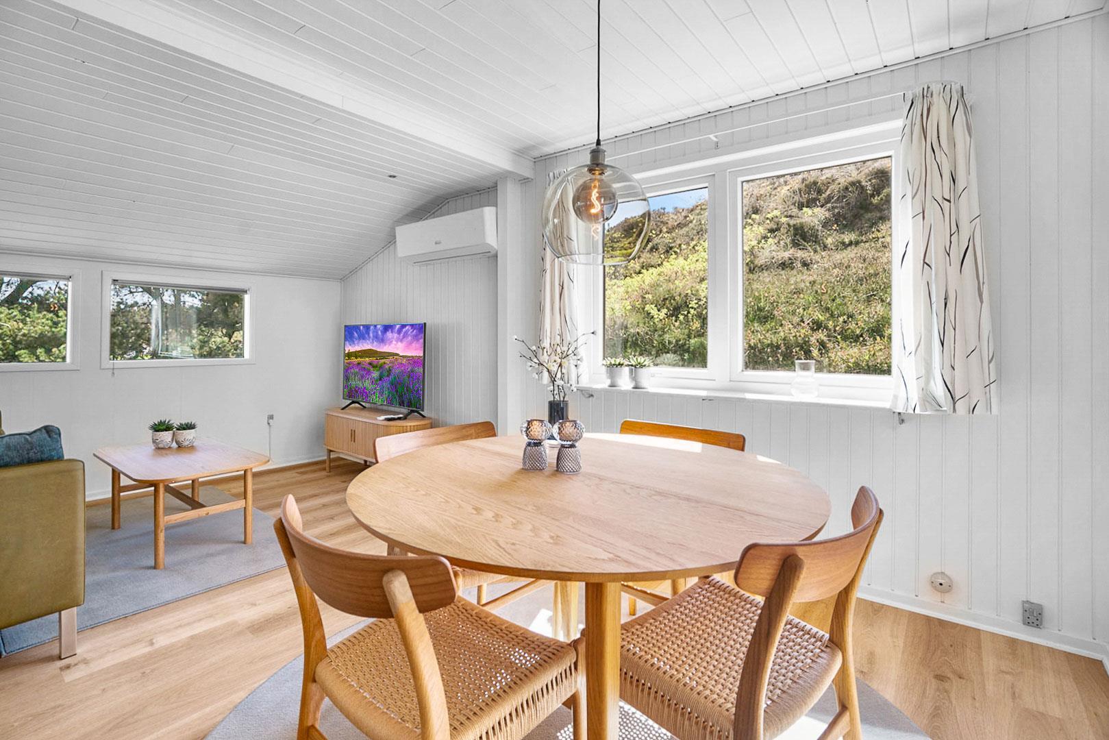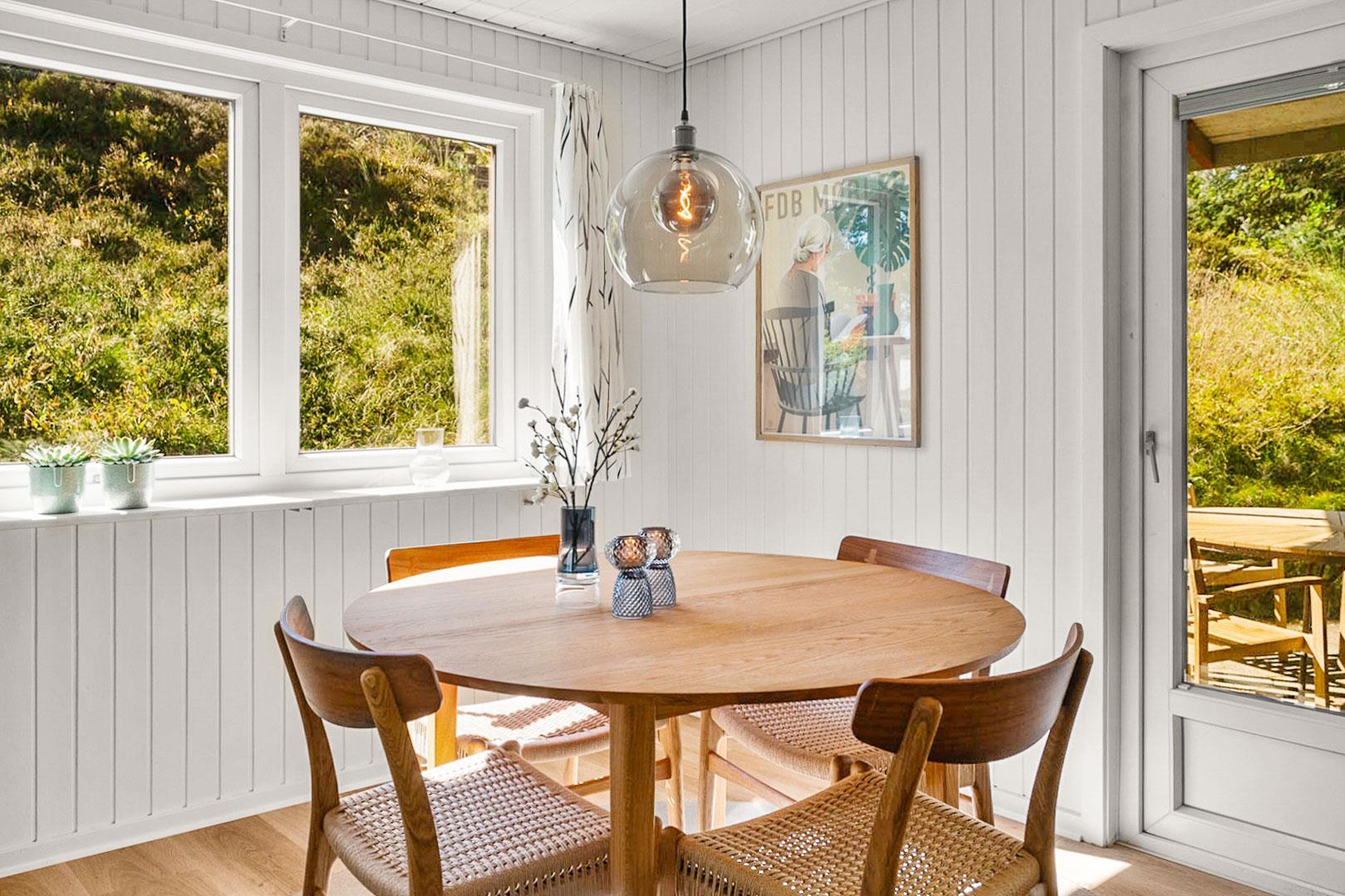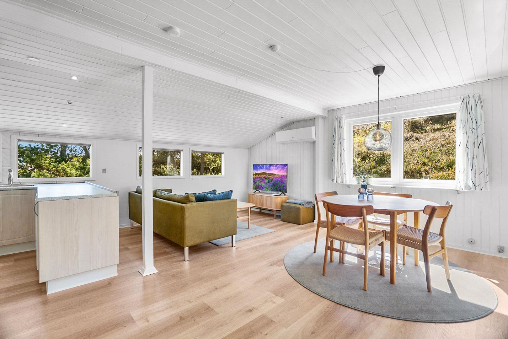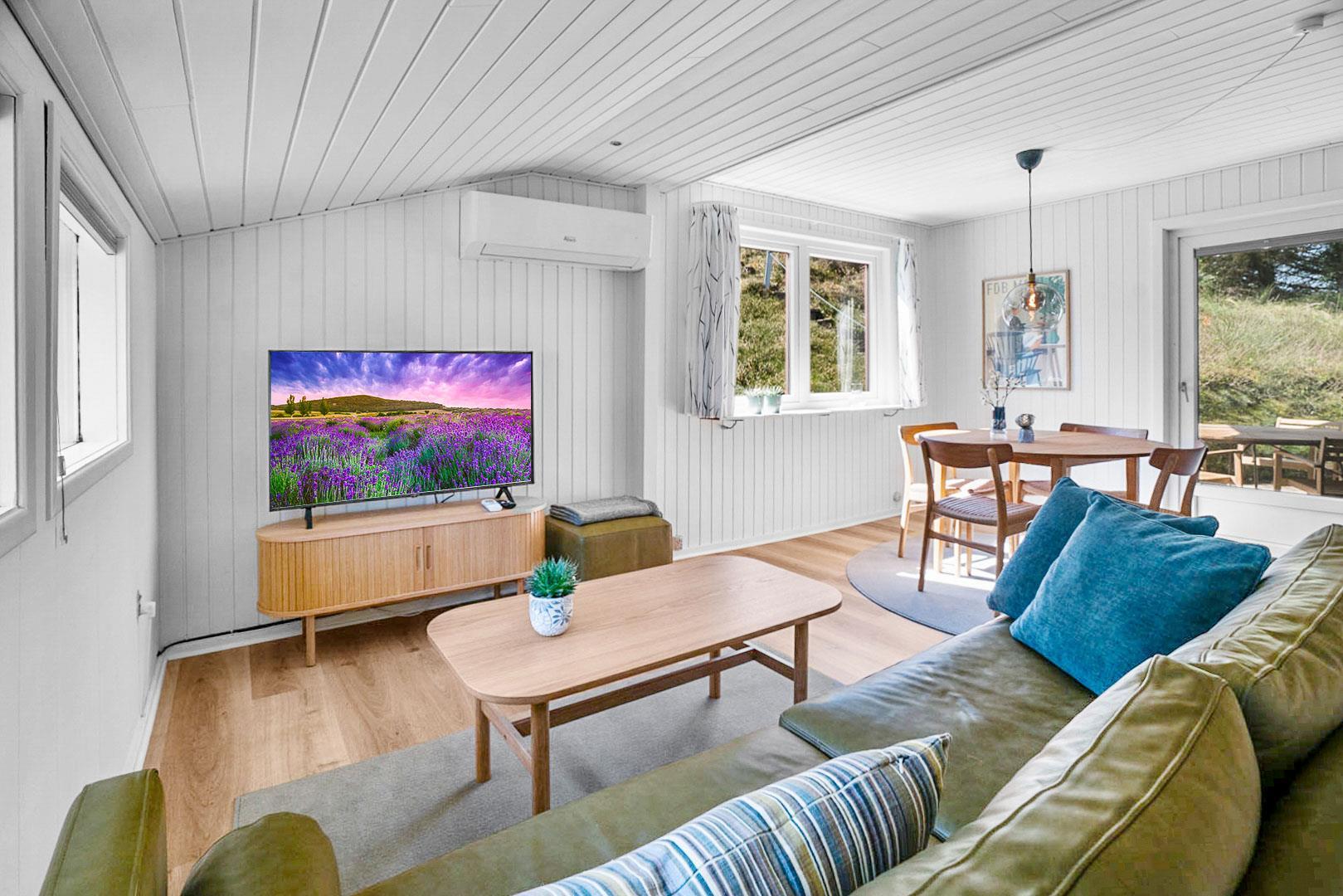 Den hyggelige stue er i åben forbindelse med køkkenet, så du kan nemt tilberede måltider, mens du stadig er en del af familiehyggen. Fra stuen leder en dør ud til en dejlig overdækket terrasse, hvor du kan tilbringe mange hyggelige timer og nyde den skønne natur omkring Henne Strand.