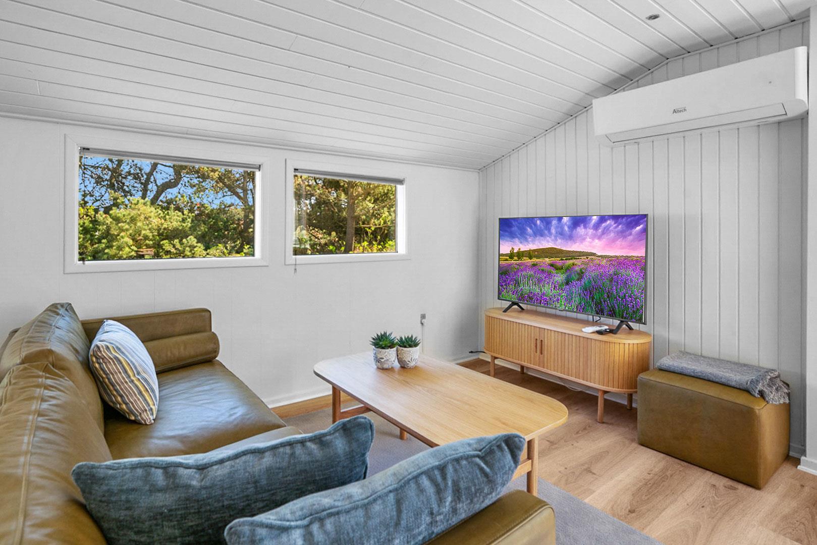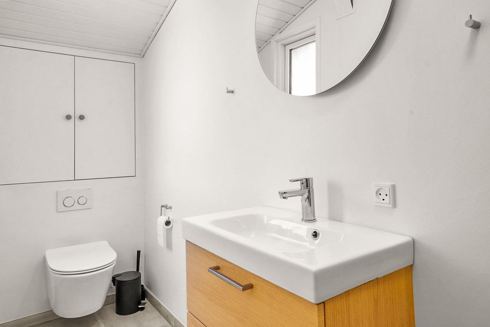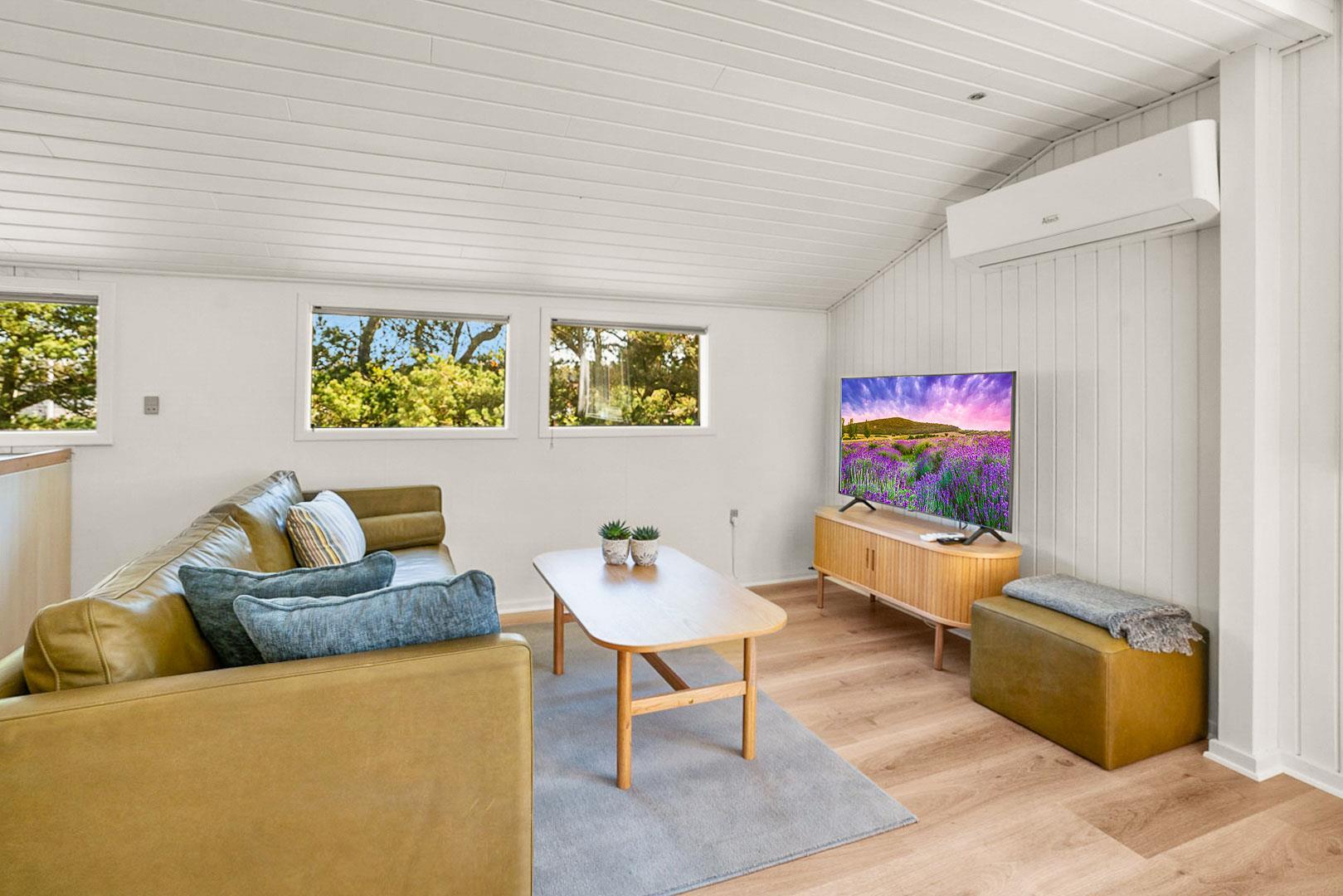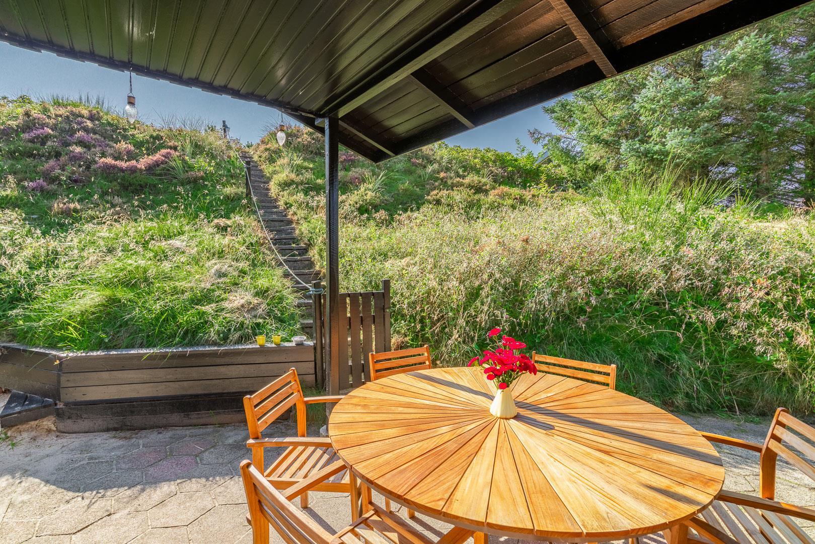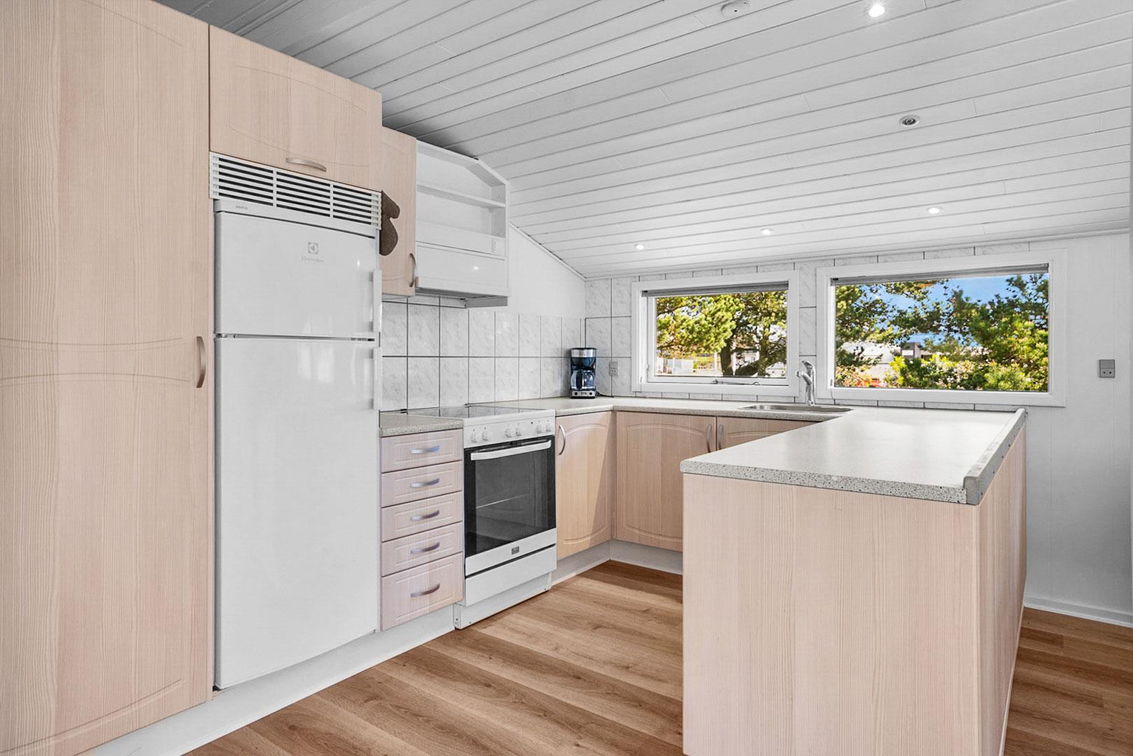 Den hyggelige stue er i åben forbindelse med køkkenet, så du kan nemt tilberede måltider, mens du stadig er en del af familiehyggen. Fra stuen leder en dør ud til en dejlig overdækket terrasse, hvor du kan tilbringe mange hyggelige timer og nyde den skønne natur omkring Henne Strand.