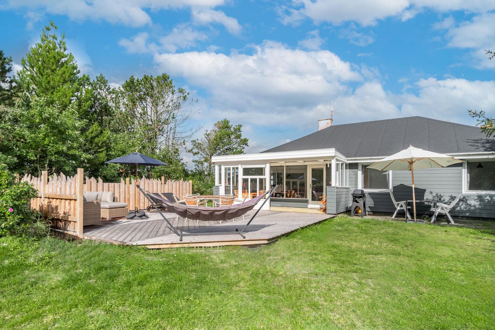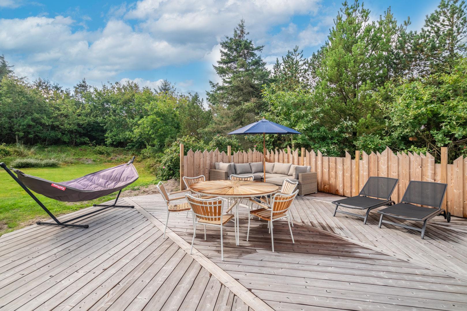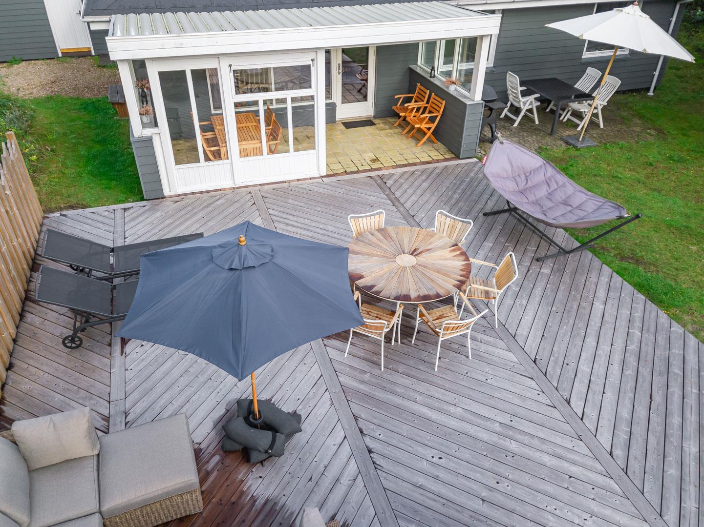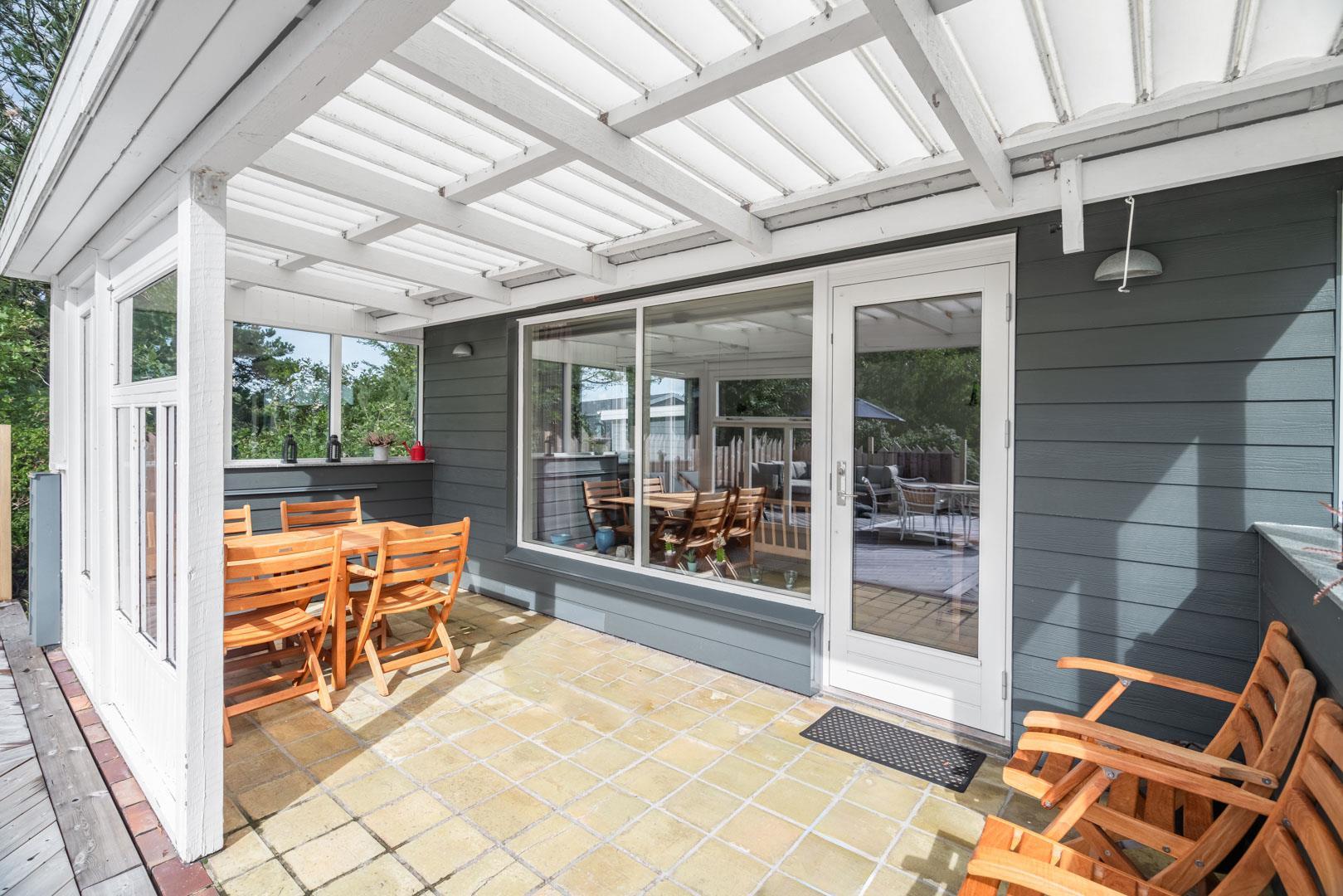 Husets hyggelige stue er smagfuldt indrettet og leder ud til en overdækket terrasse, hvor du kan nyde morgenkaffen uanset vejret. Terrassen strækker sig videre ud til en charmerende træterrasse med hegn, der både skaber læ og en hyggelig krog med sofa og liggestole. Her kan du koble af i hængekøjen eller lade tankerne vandre til lyden af fuglefløjt, mens du slapper af med en god bog.
