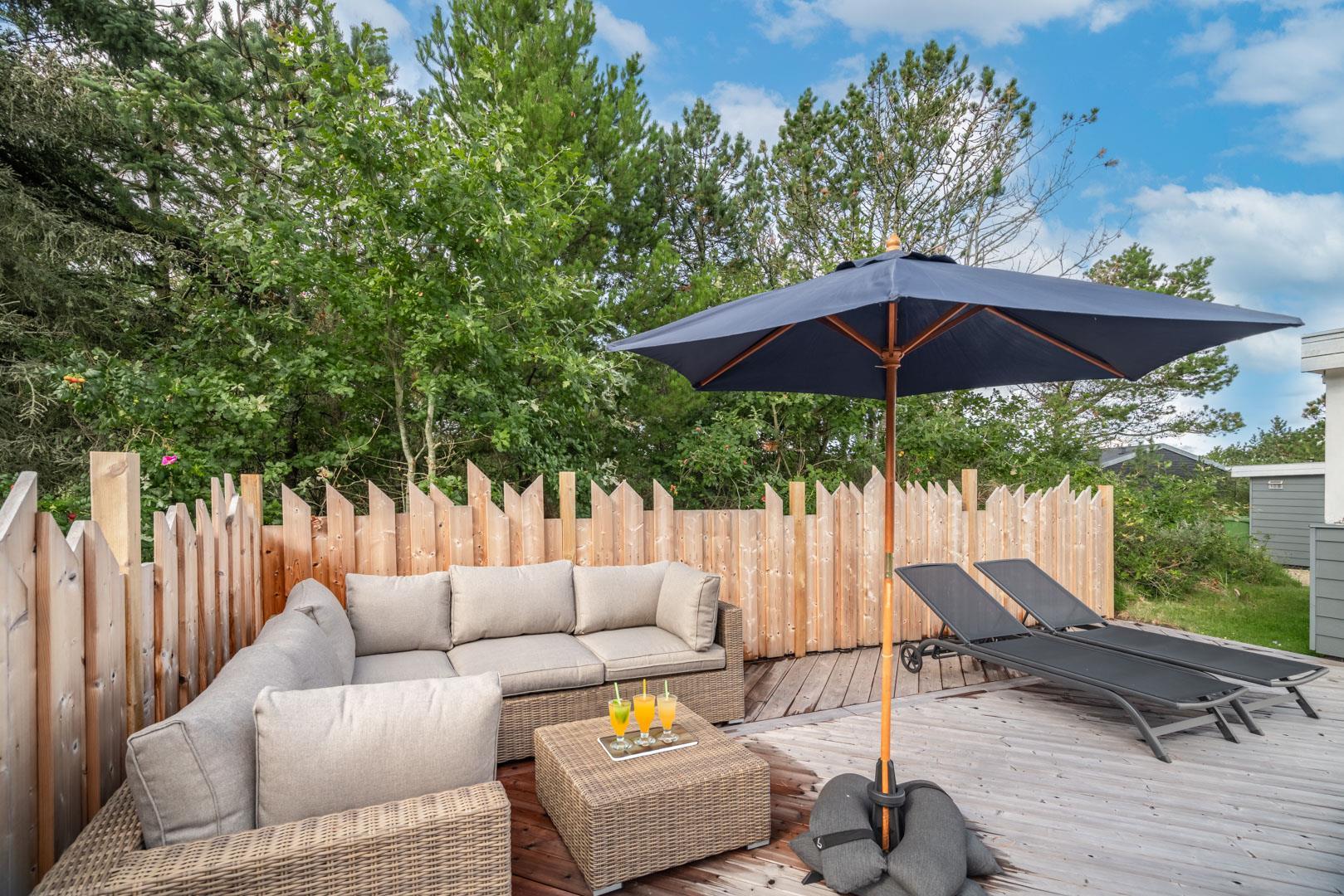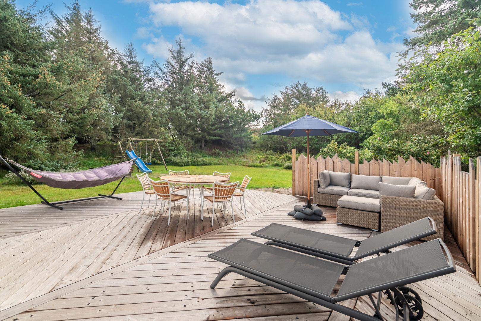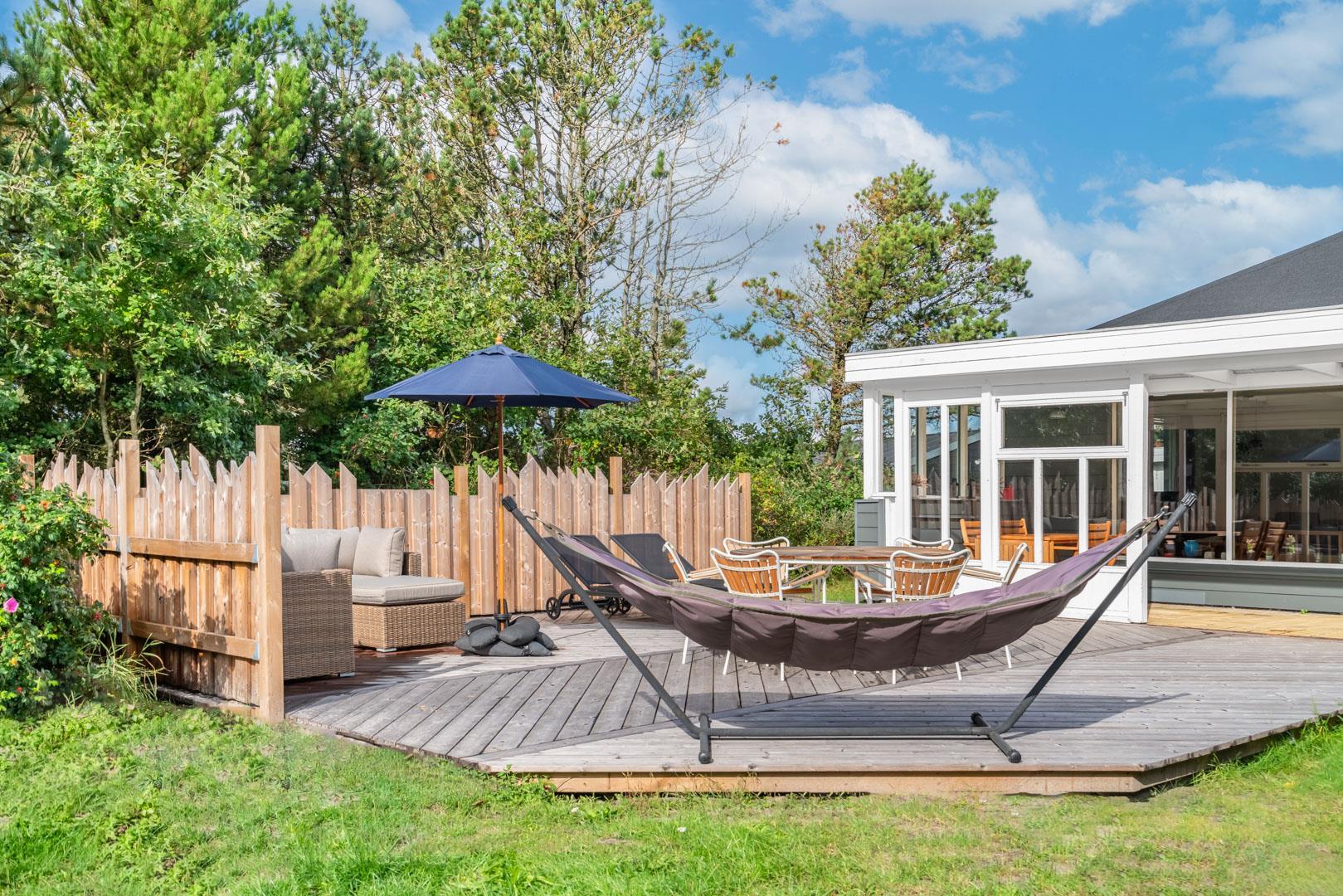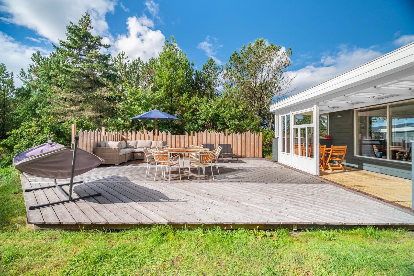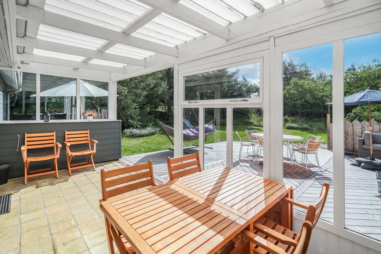 Husets hyggelige stue er smagfuldt indrettet og leder ud til en overdækket terrasse, hvor du kan nyde morgenkaffen uanset vejret. Terrassen strækker sig videre ud til en charmerende træterrasse med hegn, der både skaber læ og en hyggelig krog med sofa og liggestole. Her kan du koble af i hængekøjen eller lade tankerne vandre til lyden af fuglefløjt, mens du slapper af med en god bog.