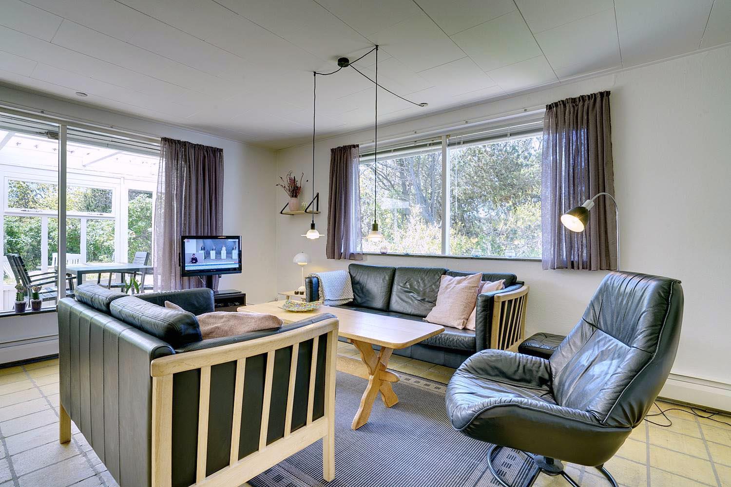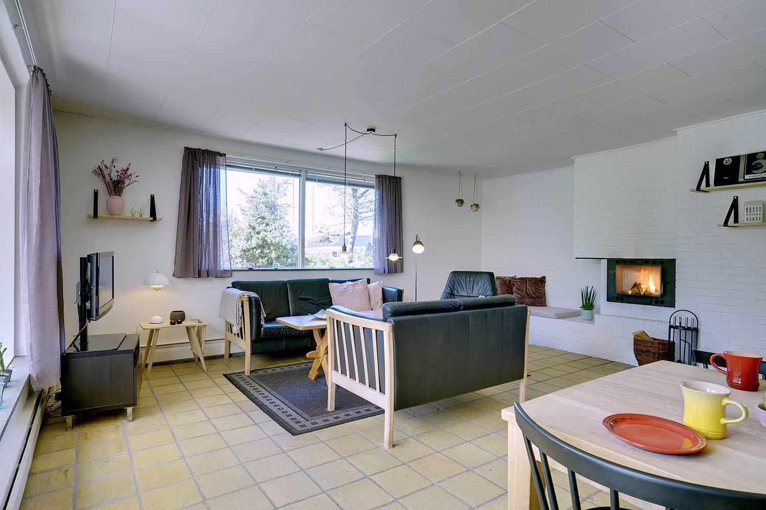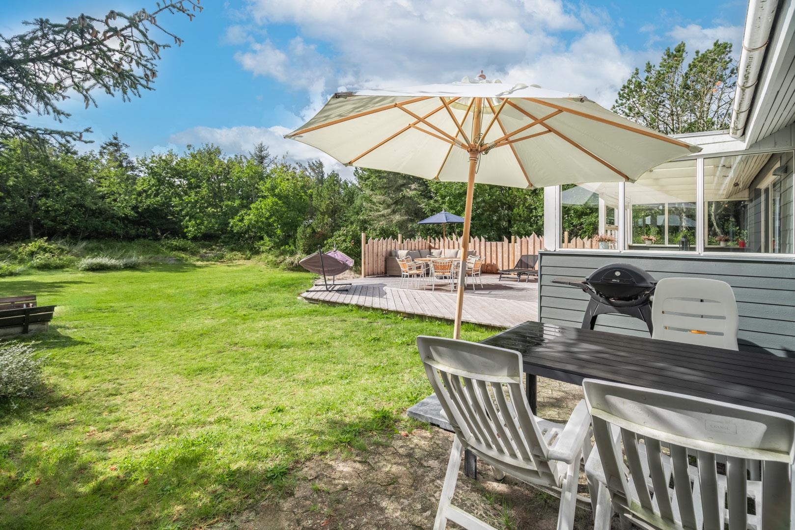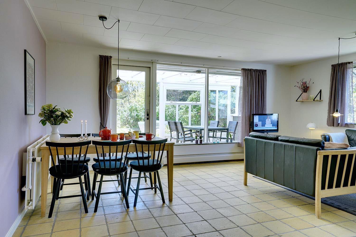 Husets hyggelige stue er smagfuldt indrettet og leder ud til en overdækket terrasse, hvor du kan nyde morgenkaffen uanset vejret. Terrassen strækker sig videre ud til en charmerende træterrasse med hegn, der både skaber læ og en hyggelig krog med sofa og liggestole. Her kan du koble af i hængekøjen eller lade tankerne vandre til lyden af fuglefløjt, mens du slapper af med en god bog.