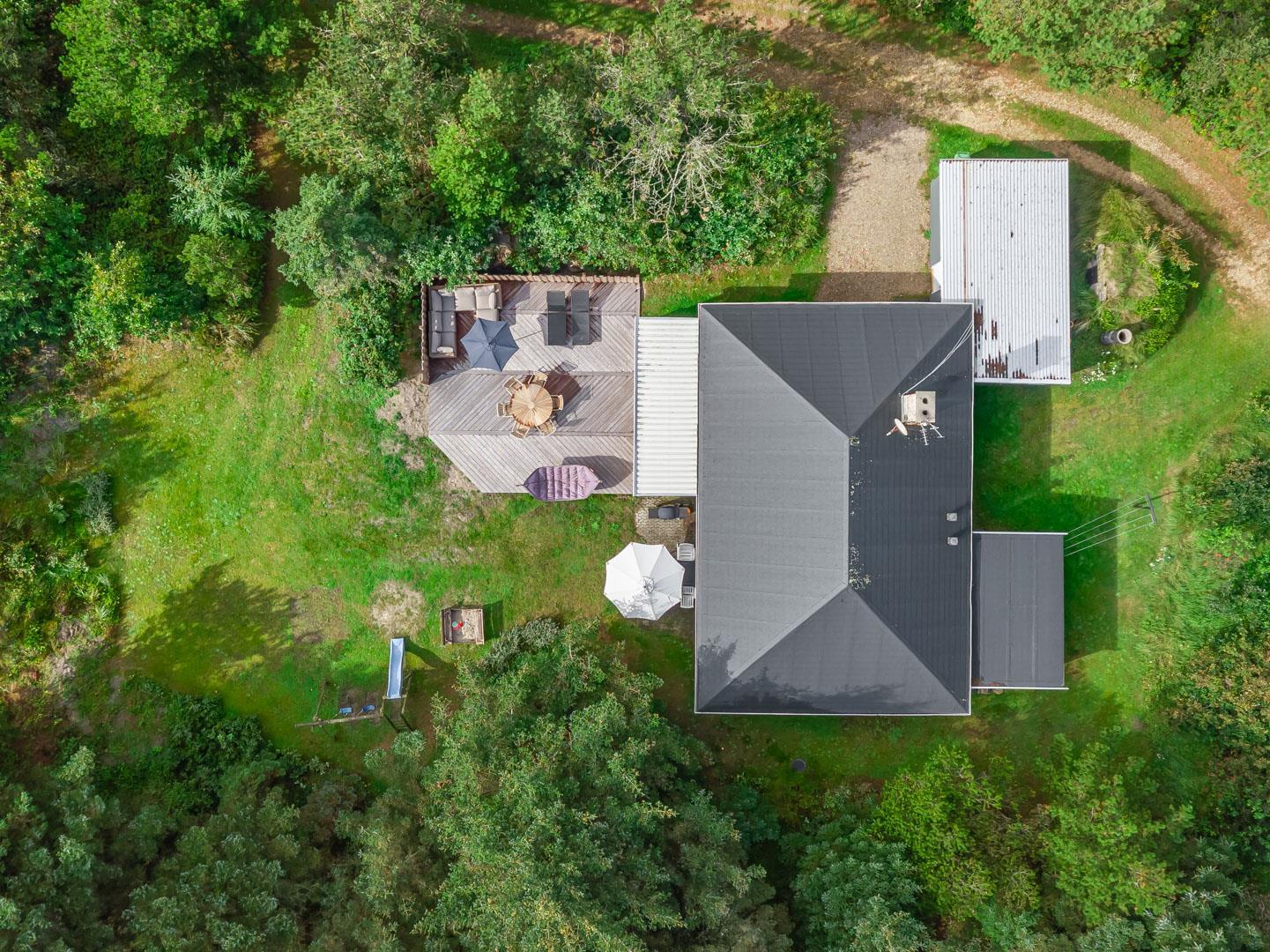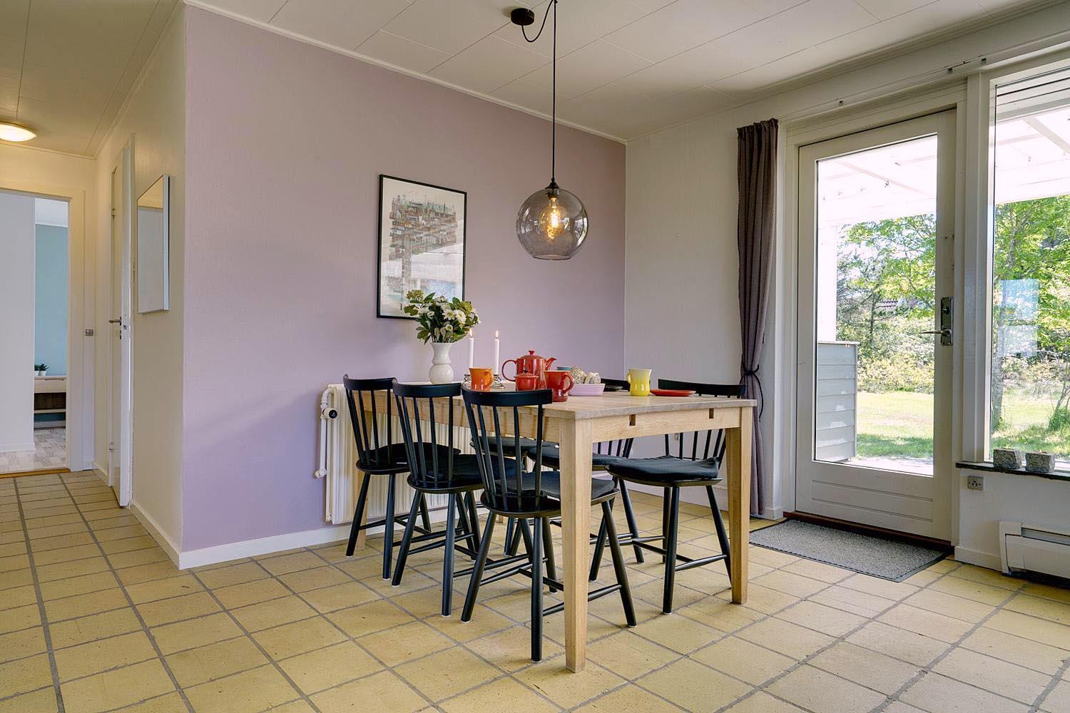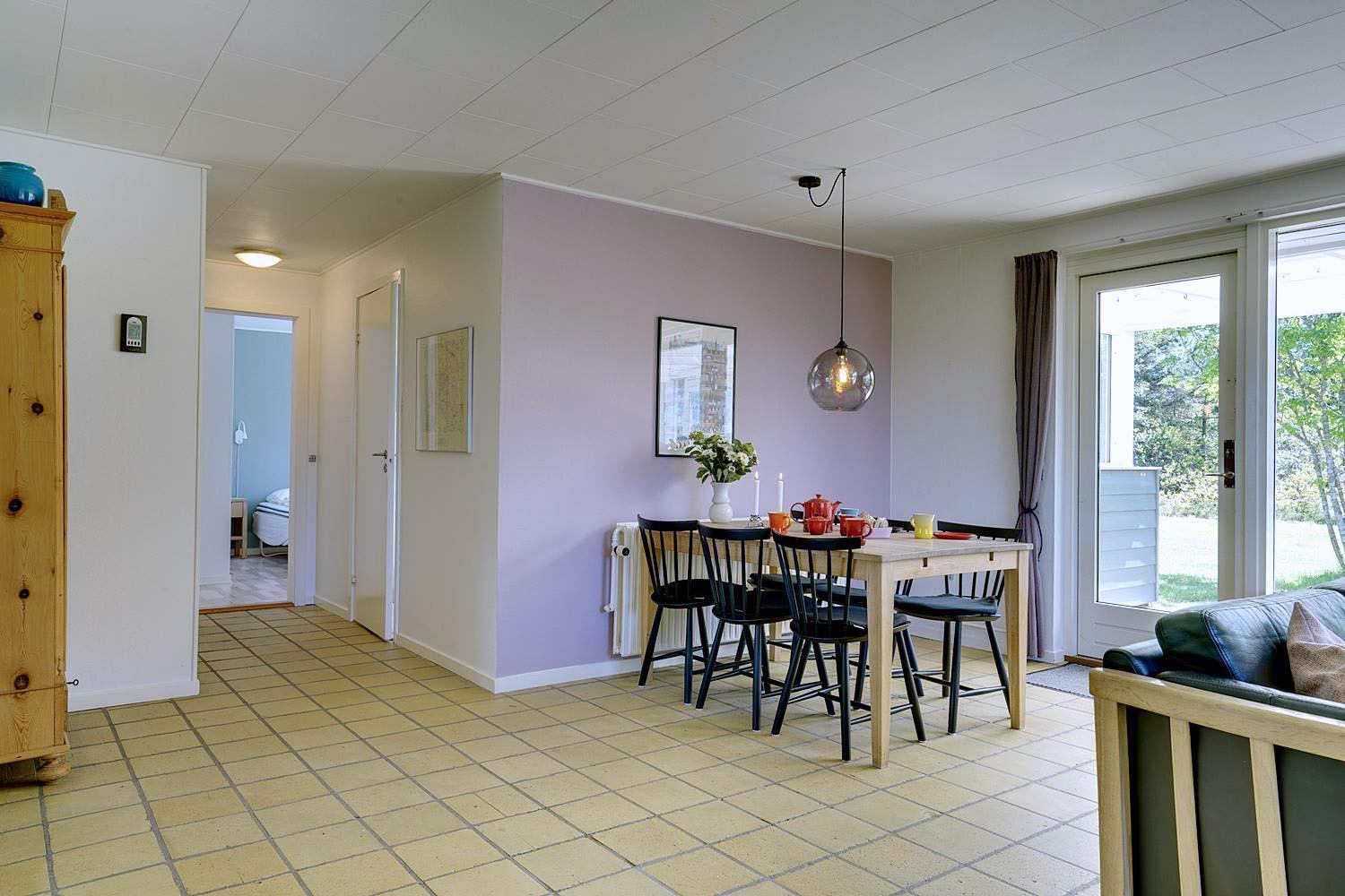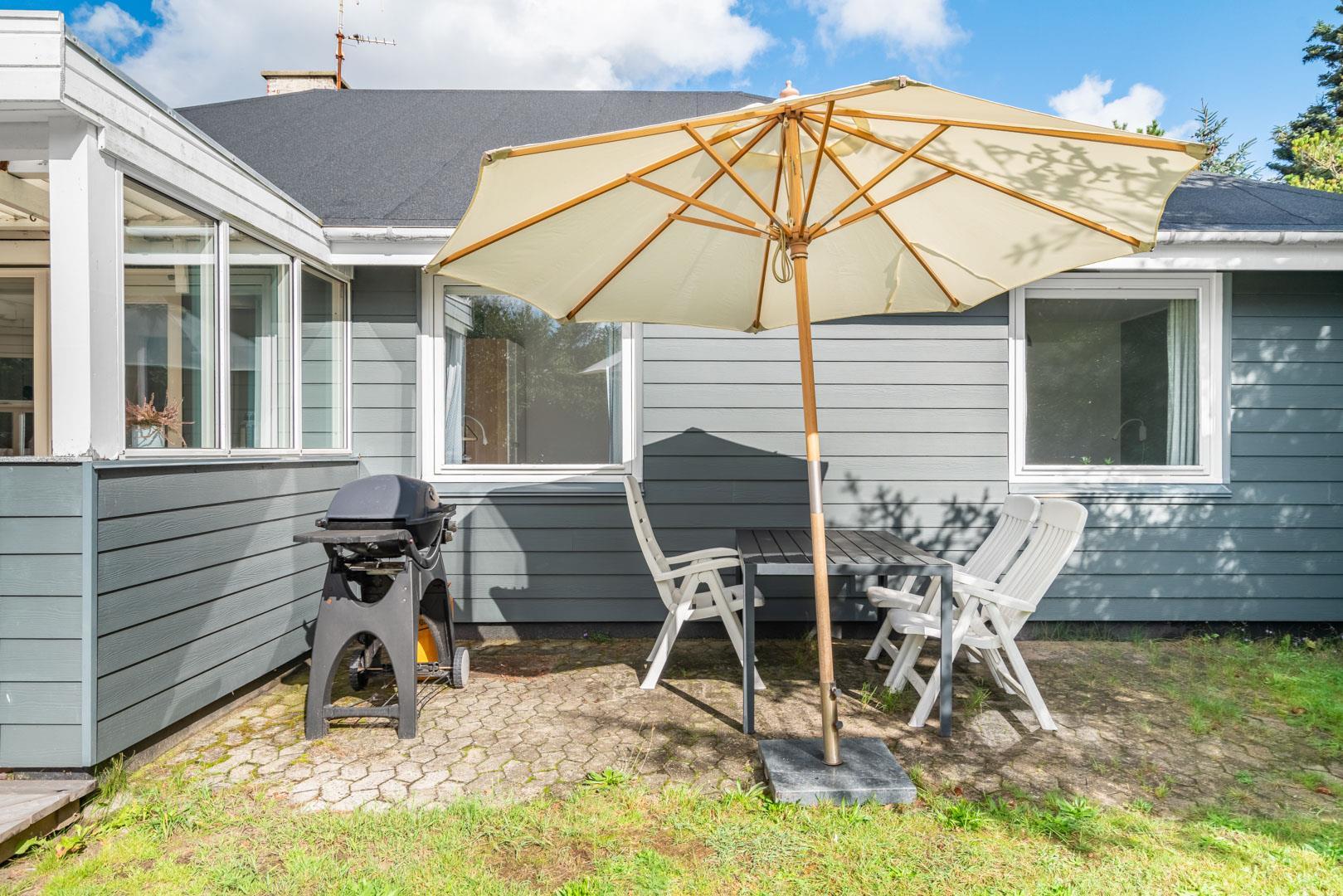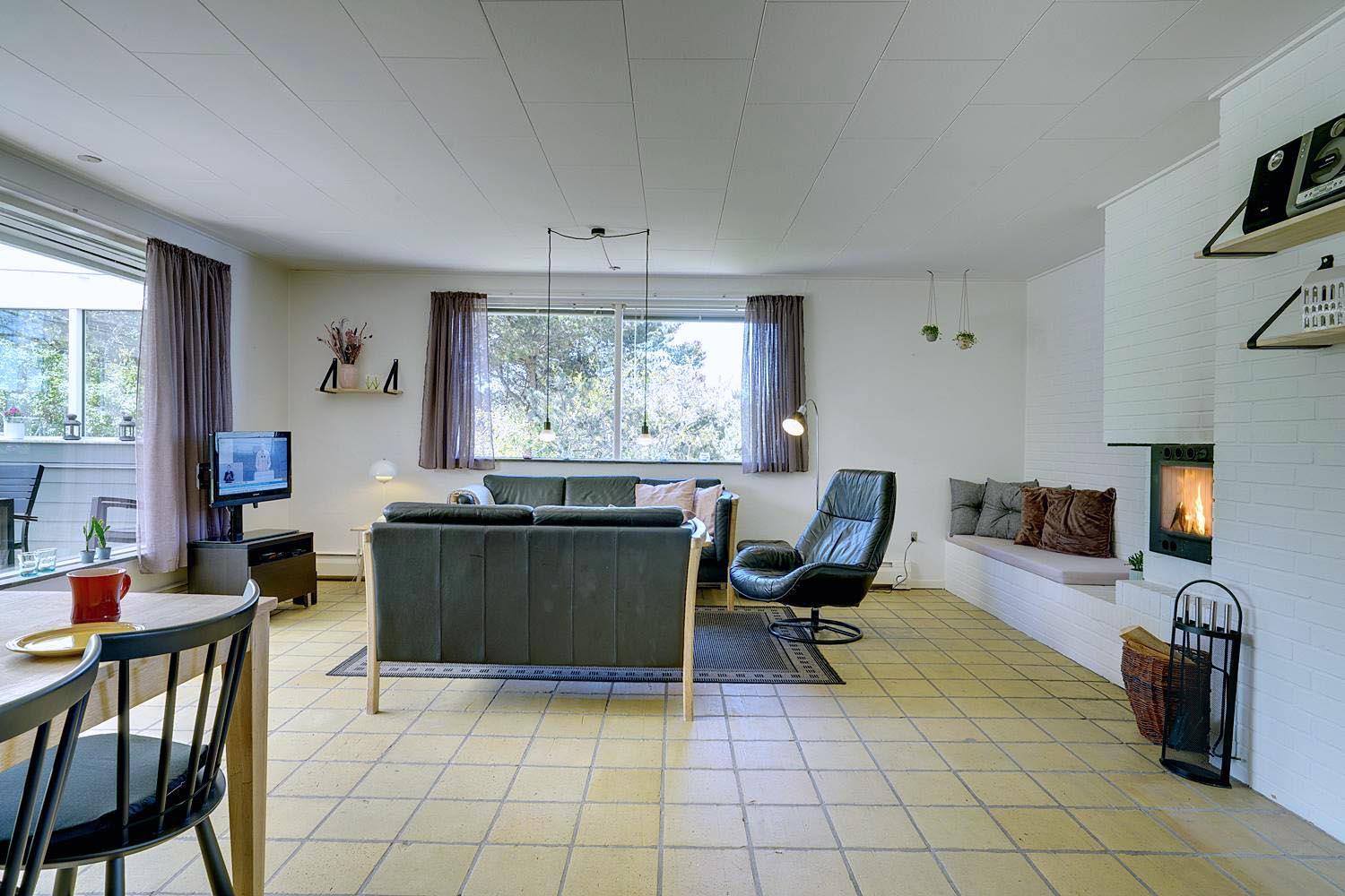 Husets hyggelige stue er smagfuldt indrettet og leder ud til en overdækket terrasse, hvor du kan nyde morgenkaffen uanset vejret. Terrassen strækker sig videre ud til en charmerende træterrasse med hegn, der både skaber læ og en hyggelig krog med sofa og liggestole. Her kan du koble af i hængekøjen eller lade tankerne vandre til lyden af fuglefløjt, mens du slapper af med en god bog.