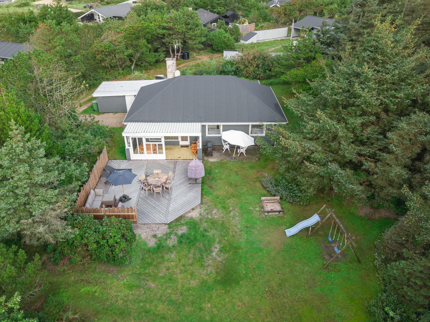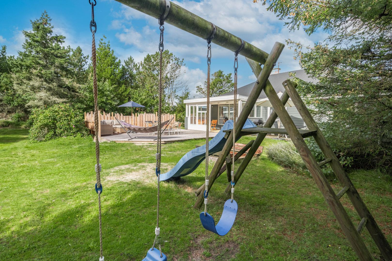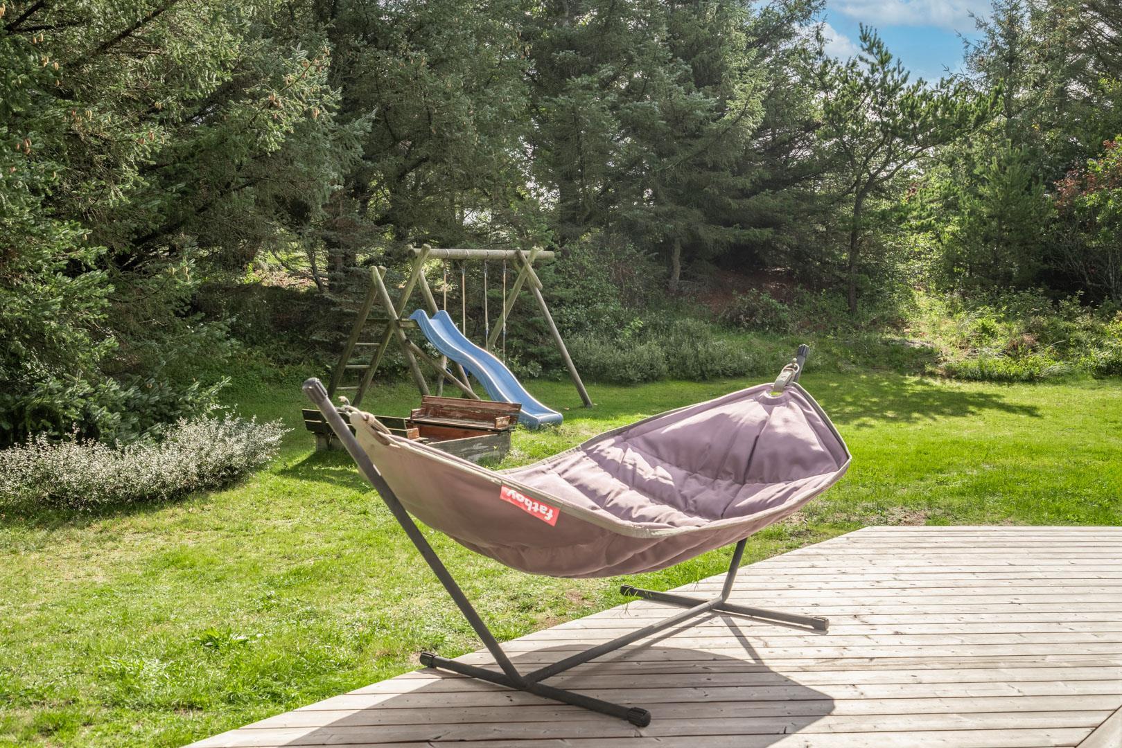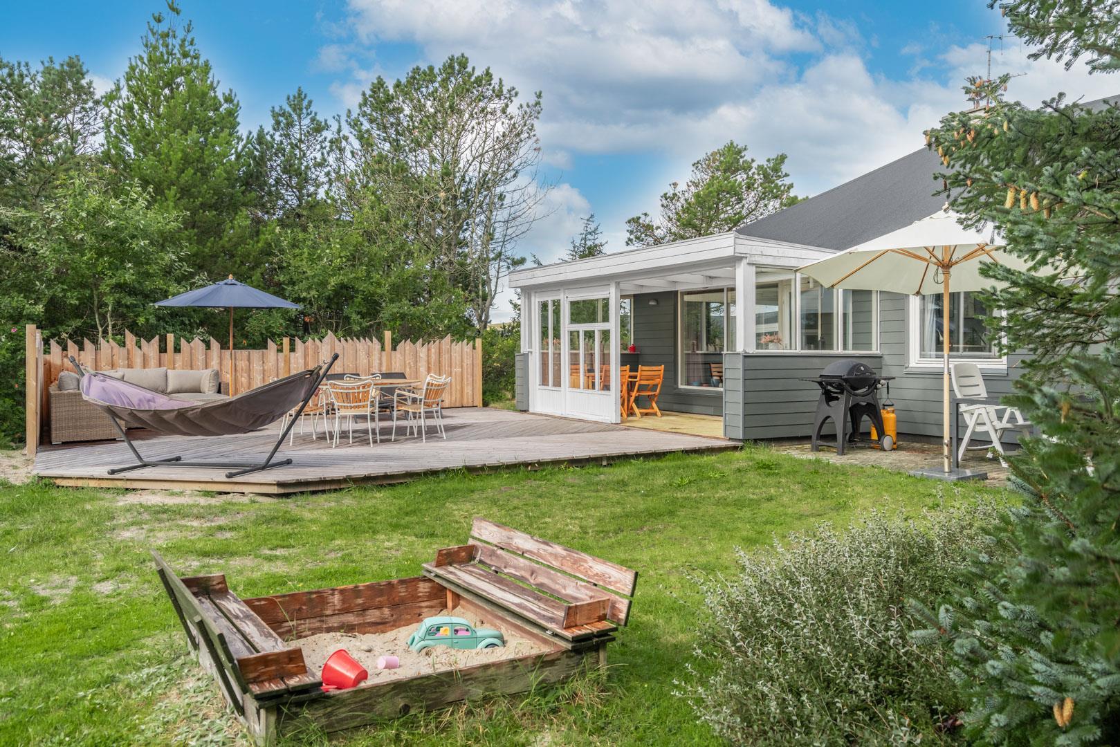 Udendørs er der rig mulighed for leg og aktiviteter – børnene vil elske legestativet og sandkassen, og der er masser af plads til boldspil og udendørs eventyr.