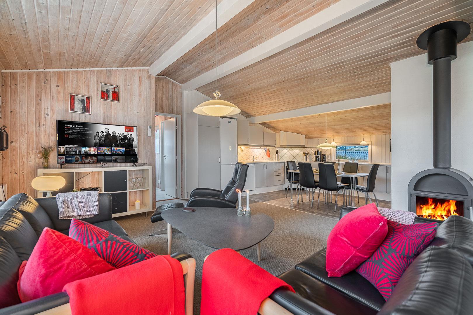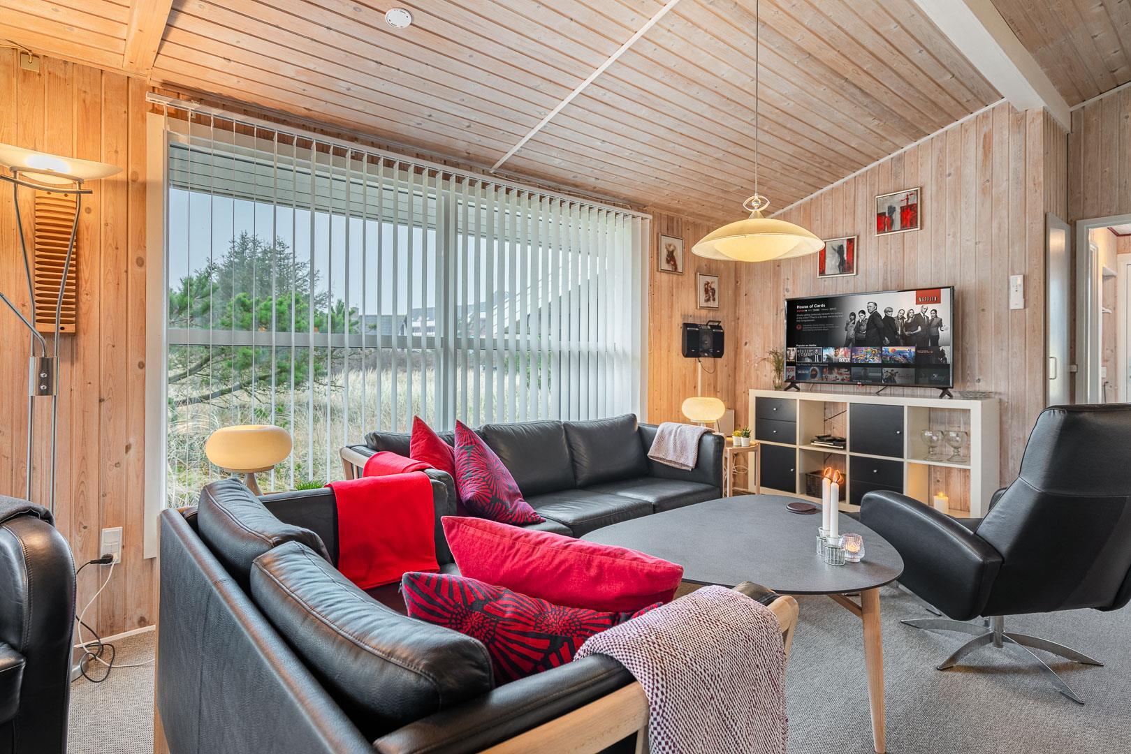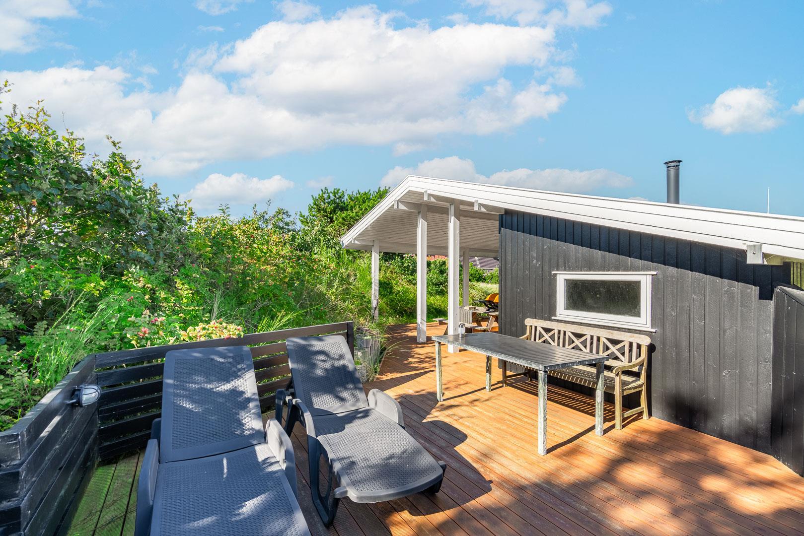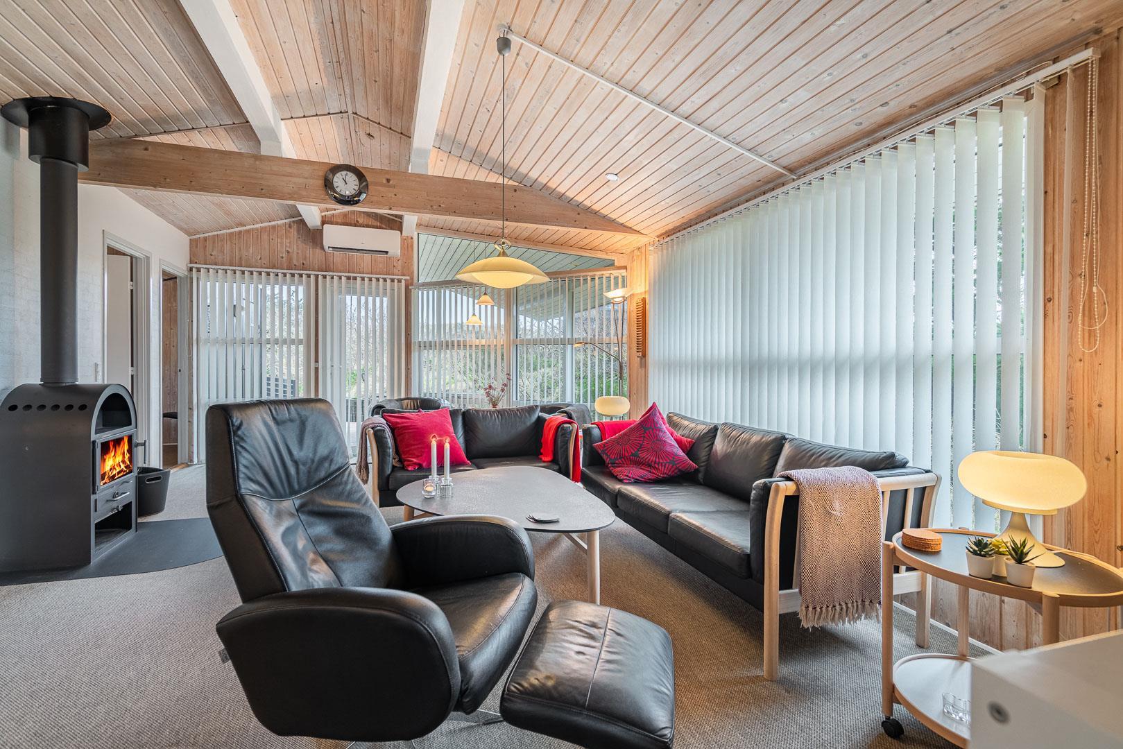 Her finder du en rigtig fin lille perle tæt på Vesterhavet, der indbyder til hygge hele året rundt. I sommerhuset finder du en dejlig stor stue, hvor du i de kolde vintermåneder kan nyde varmen fra brændeovnen. Derudover kan det nævnes, at der også er en varmepumpe i stuen der bidrager til ekstra komfort. Fra stuen er der udgang til den dejligste overdækket terrasse med terrassevarmer, perfekt til at sidde og snakke over et koldt glas rosé imens I nyder udsigten over området. På terrassen finder du også gode muligheder for at finde læ, spise en frokost i solen eller bare ligge og slappe af med en god bog.