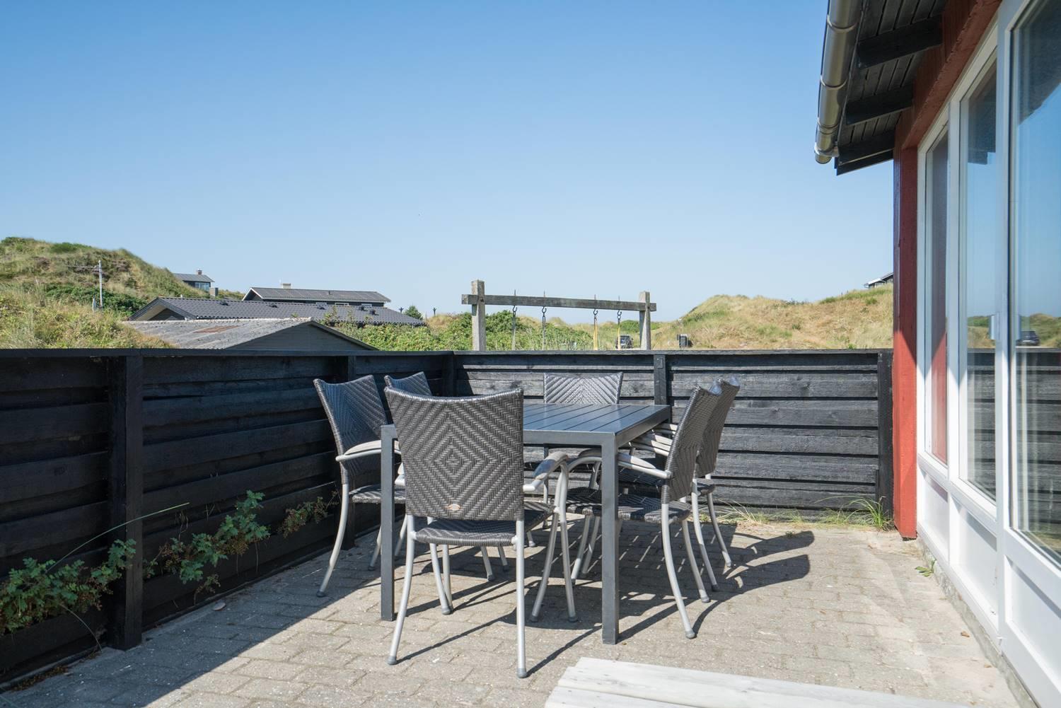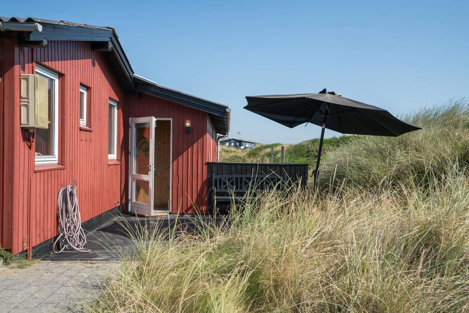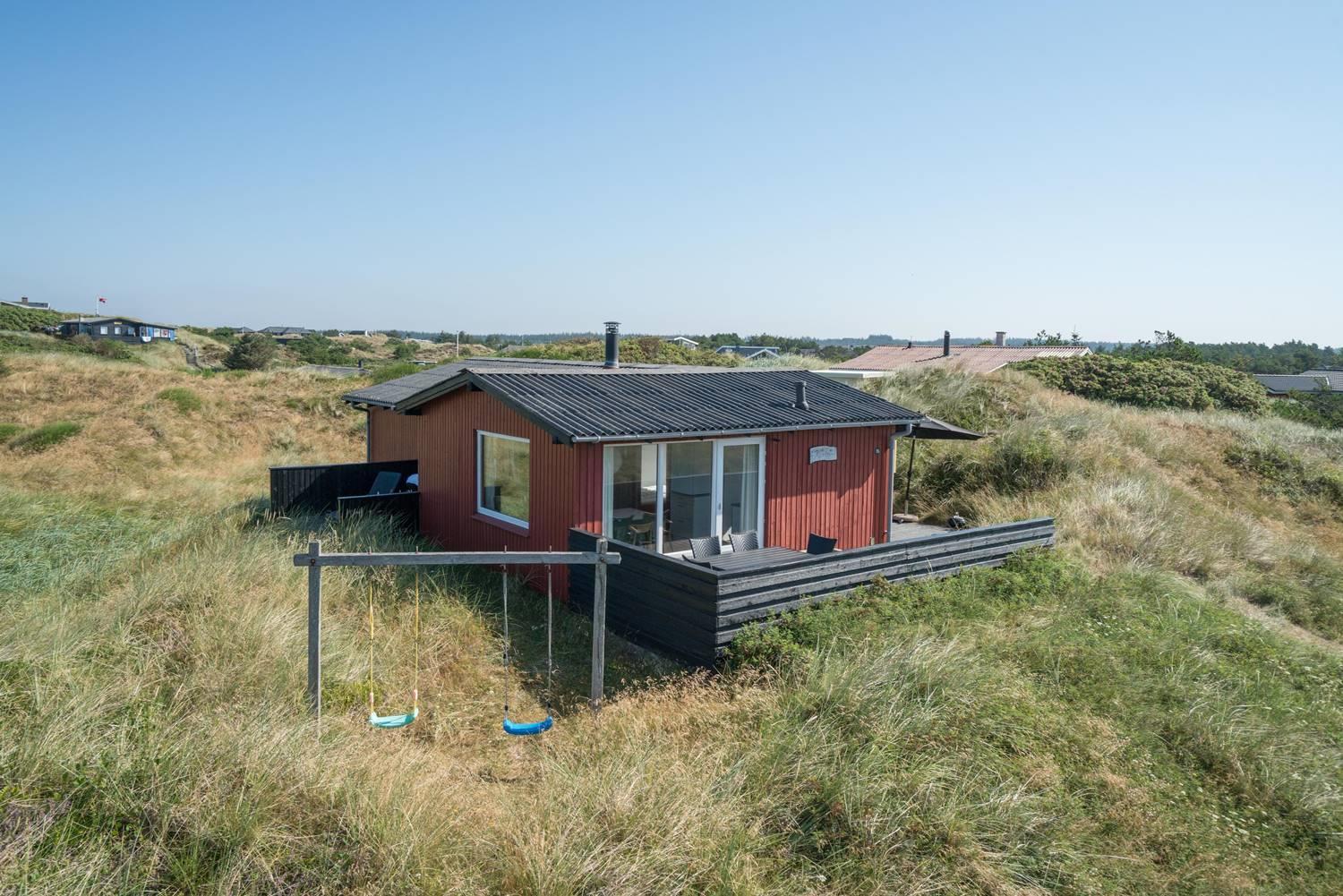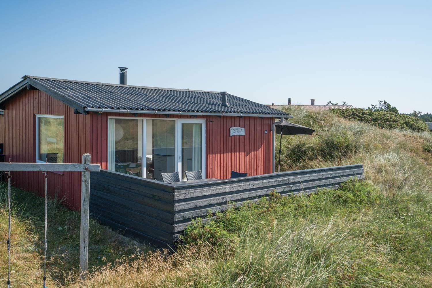 Hyggeligt feriehus i Henne Strand med sauna, 3 terrasser og dejlig udsigt over klitterne, kun 400 m fra vandet.
