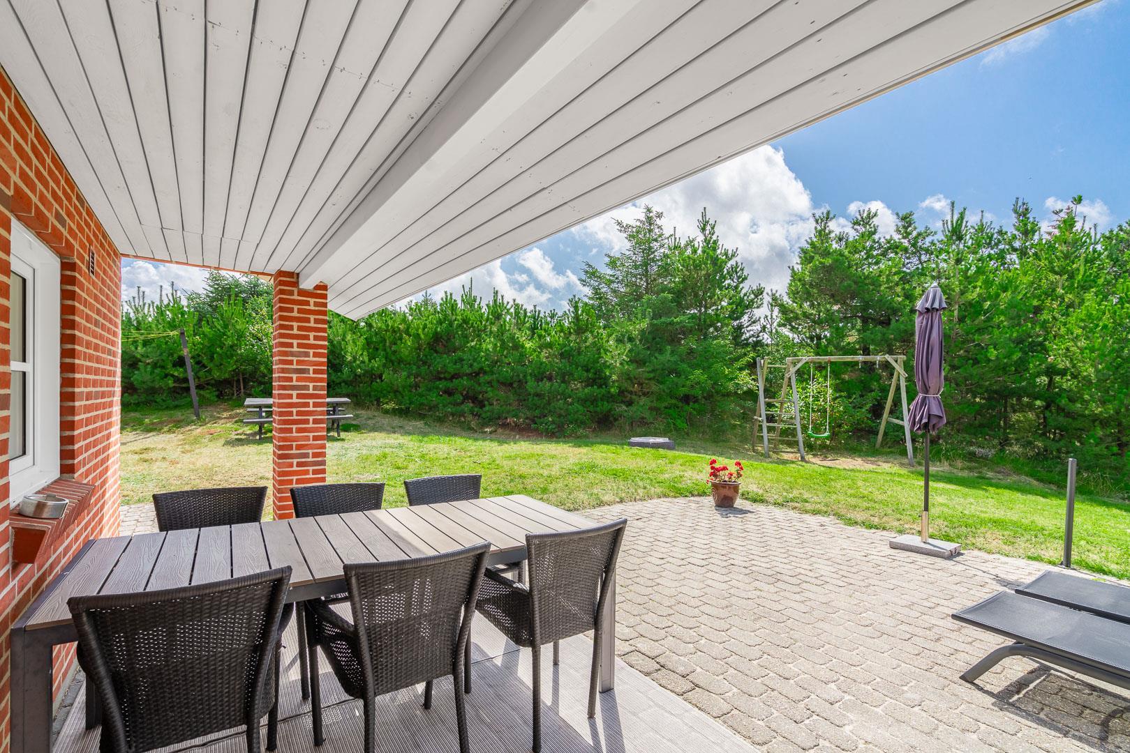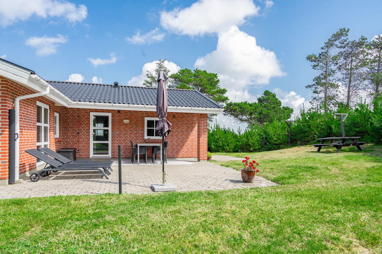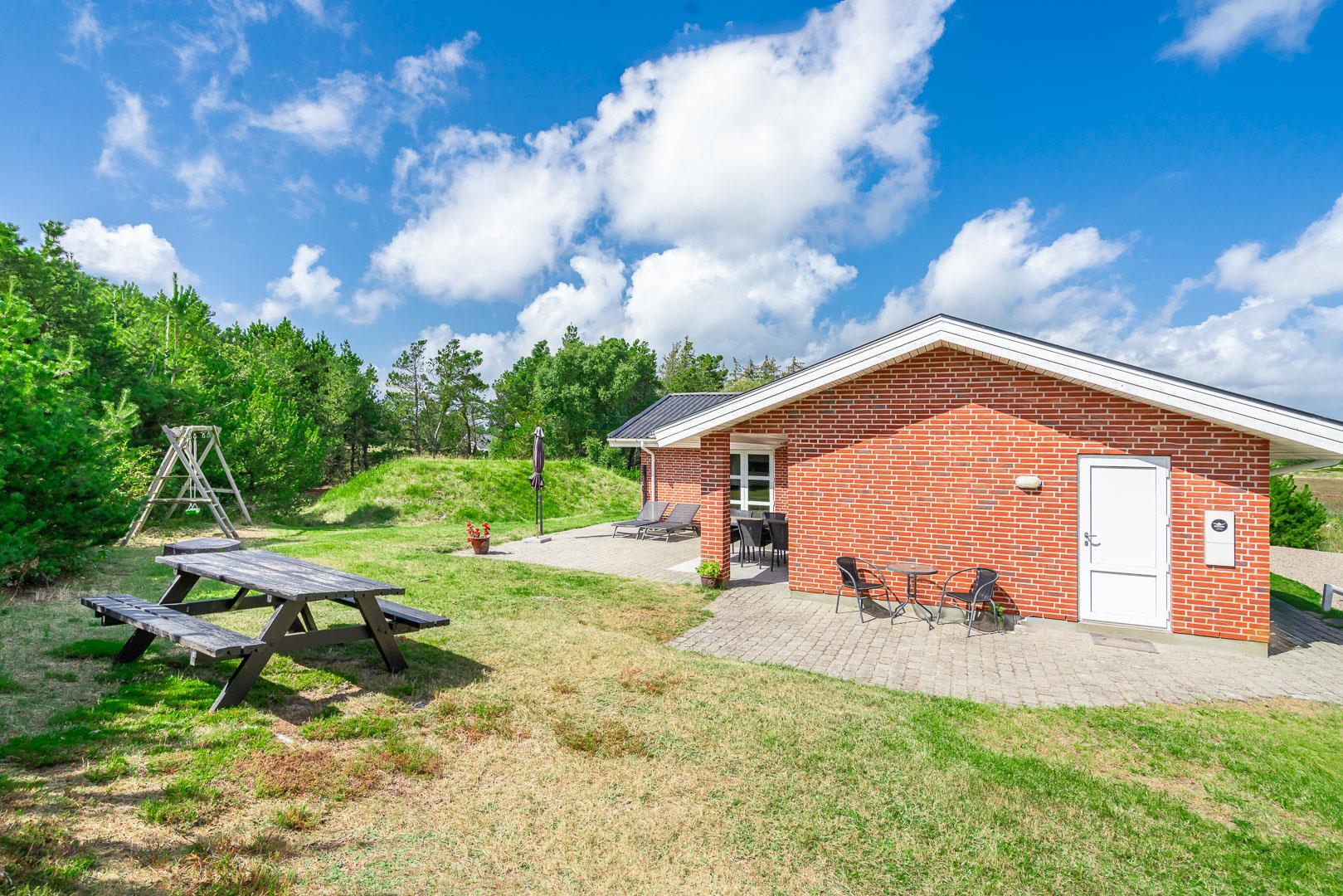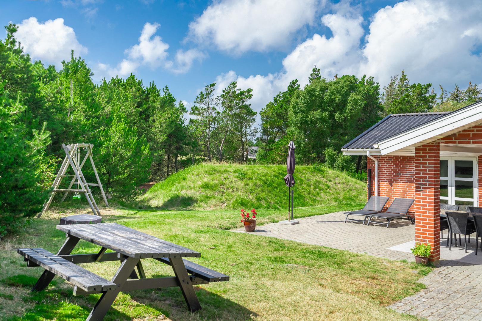 Hvis I booker i sommerperioden, vil I nok foretrække at nyde feriedagene udendørs. En skøn ugenert sydvendt terrasse med gode havemøbler og liggestole skaber de perfekte rammer for de voksne, og børnene kan nyde godt af gyngestativ, sandkasse og plads til boldspil.