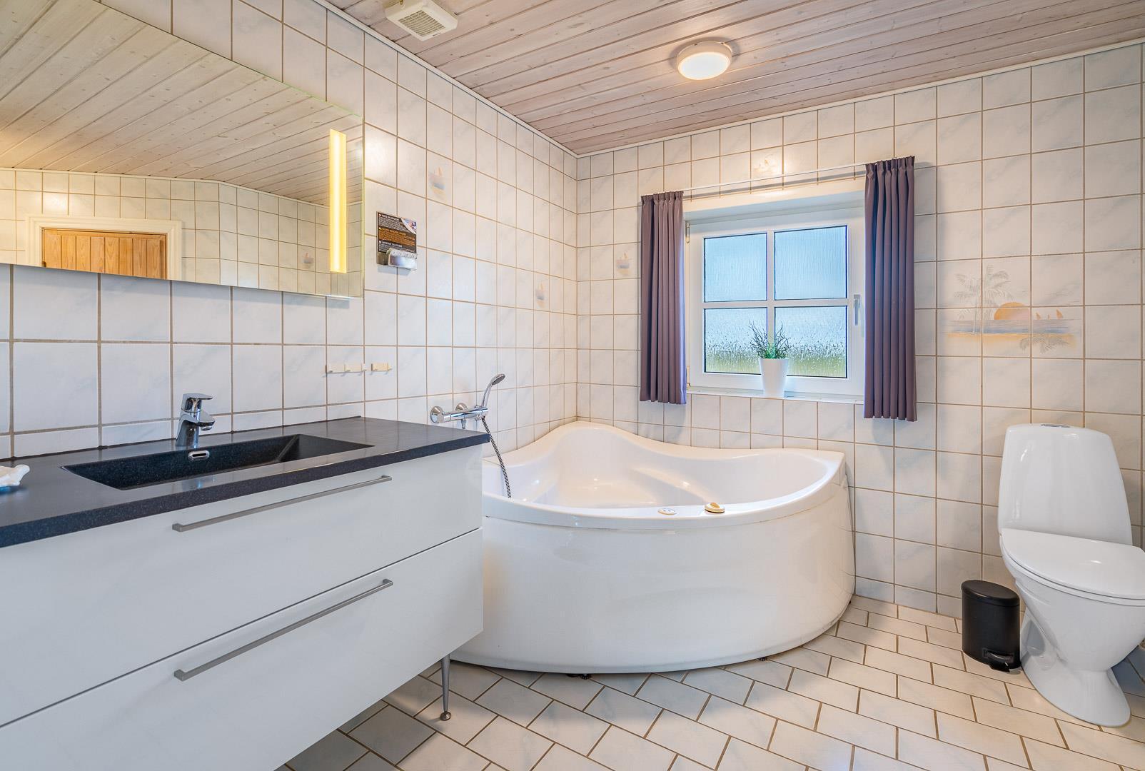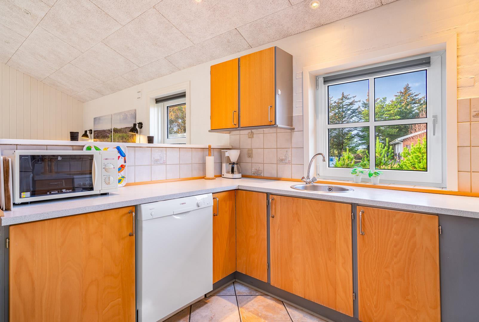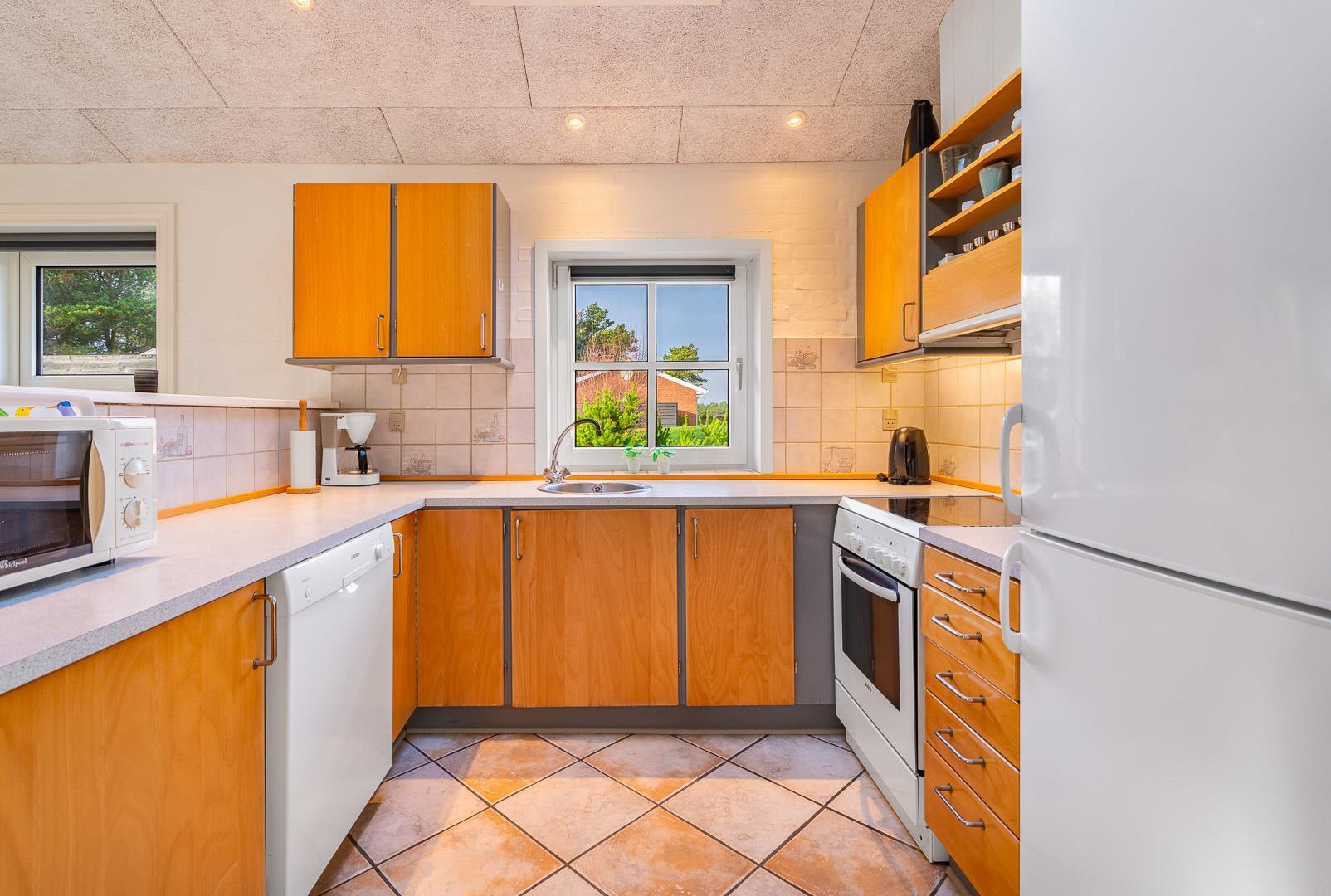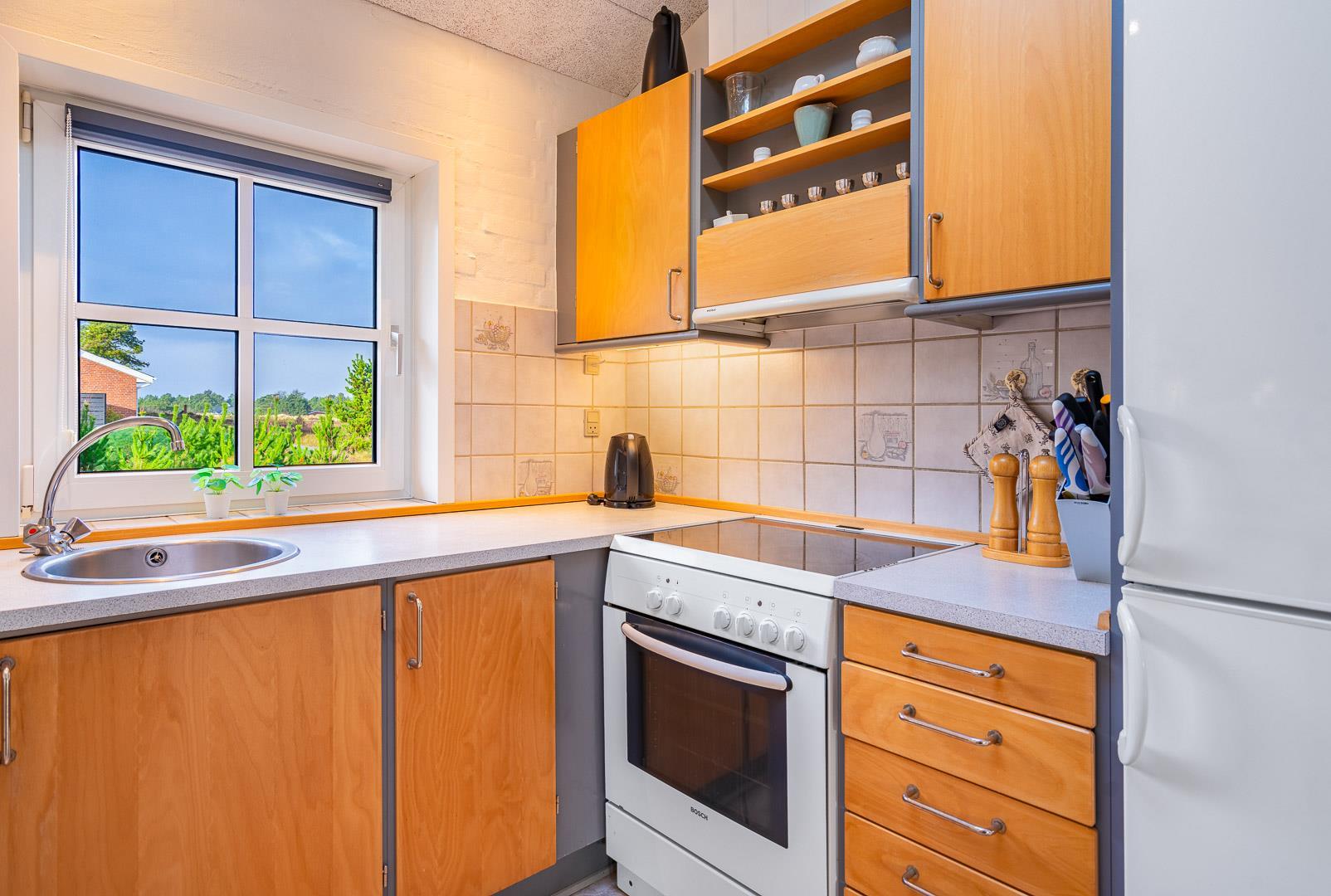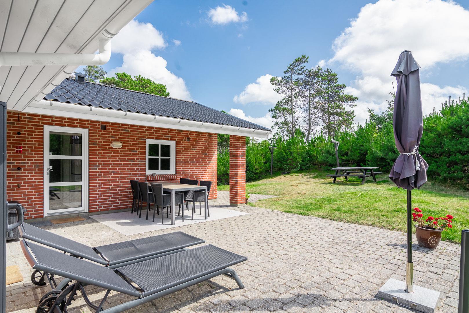 Hvis I booker i sommerperioden, vil I nok foretrække at nyde feriedagene udendørs. En skøn ugenert sydvendt terrasse med gode havemøbler og liggestole skaber de perfekte rammer for de voksne, og børnene kan nyde godt af gyngestativ, sandkasse og plads til boldspil.