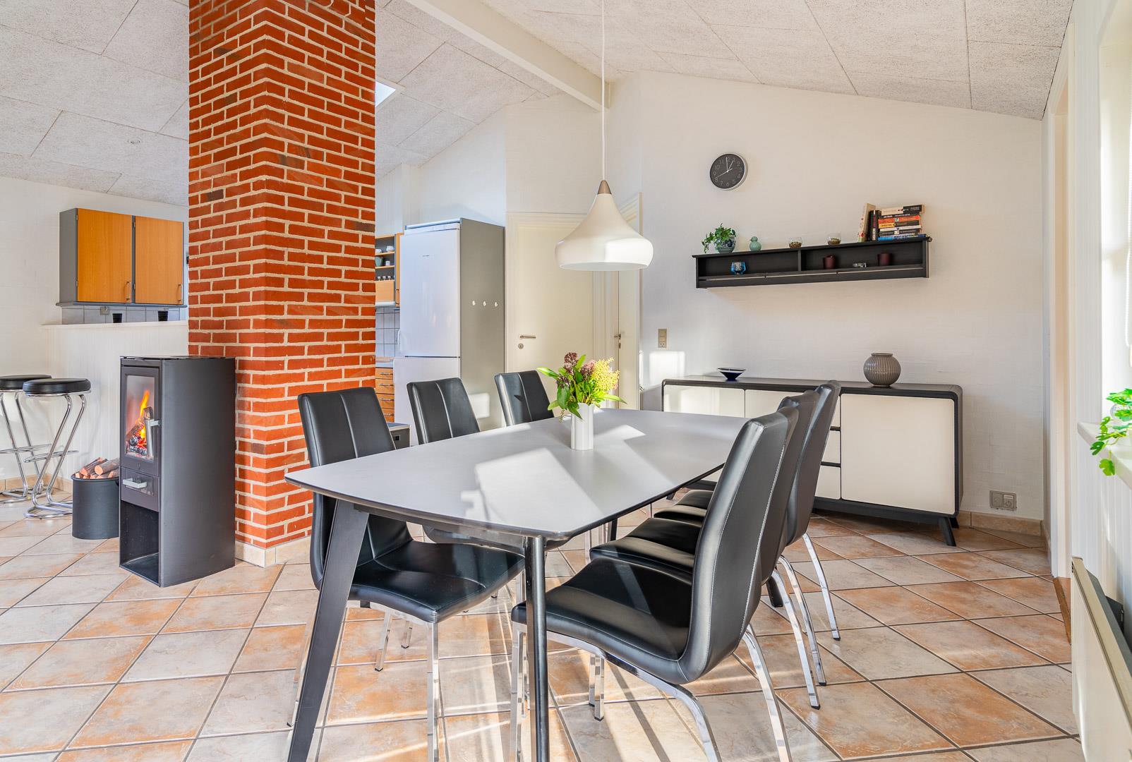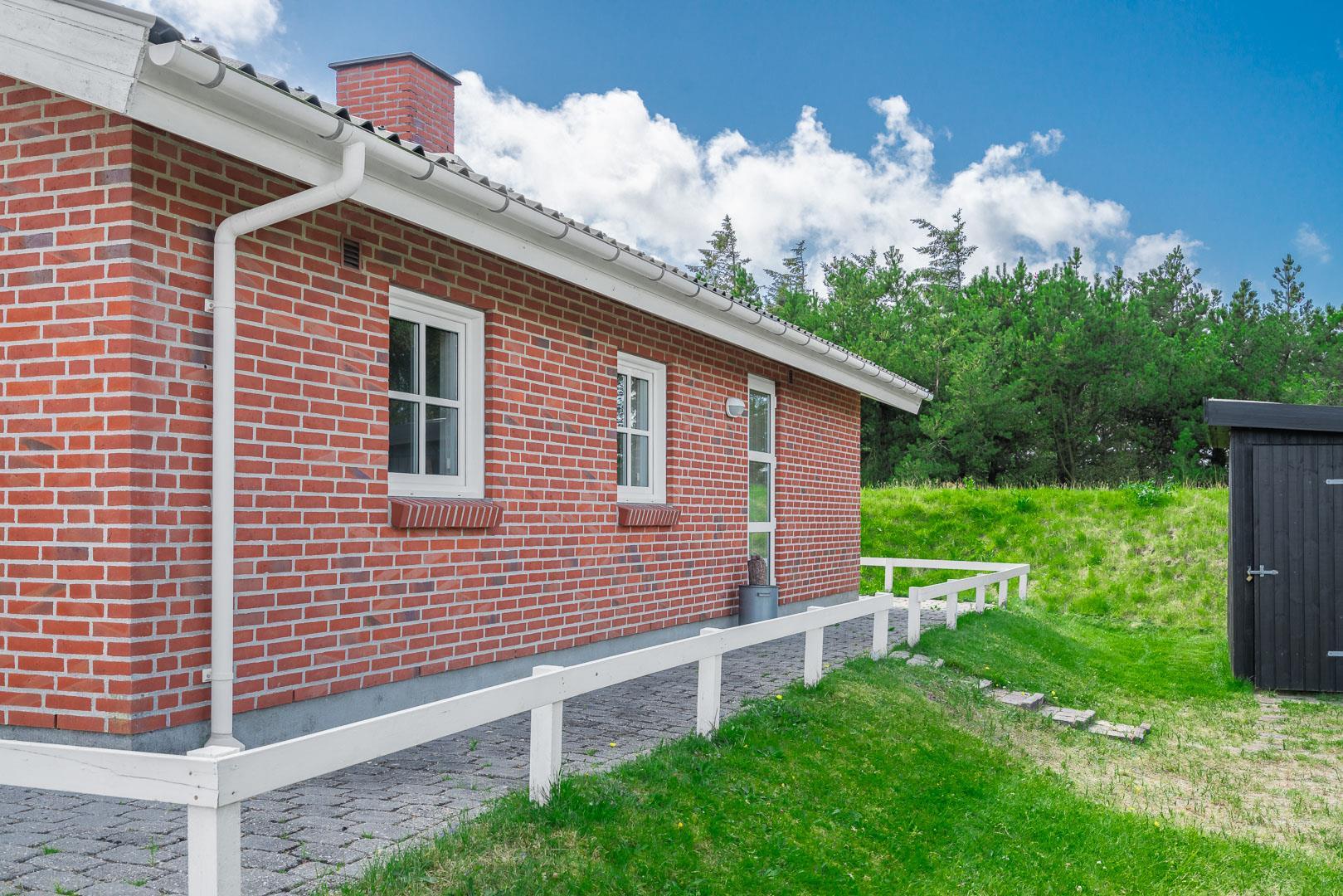 Turen hen til sommerhuset er en del af charmen; allerede når du kører gennem det grønne sommerhusområde, kan du begynde at slappe af. Hedelandskabet åbner sig på venstre side af bilen, lidt nede af Lyngbovej, og når du kommer til nummer 32, titter det røde murstenshus frem mellem nåletræerne trukket lidt tilbage for vejen. Sommerhusstemningen er skruet helt op indenfor i huset. Ikke mindst i stuen, hvor brændeovn og bløde møbler er med til at sætte scenen. Mange timer kan gå med at hygge og pjatte i spabadet eller saunaen, og gode familiestunder med brætspil kan finde sted i brændeovnens skær i stuen.