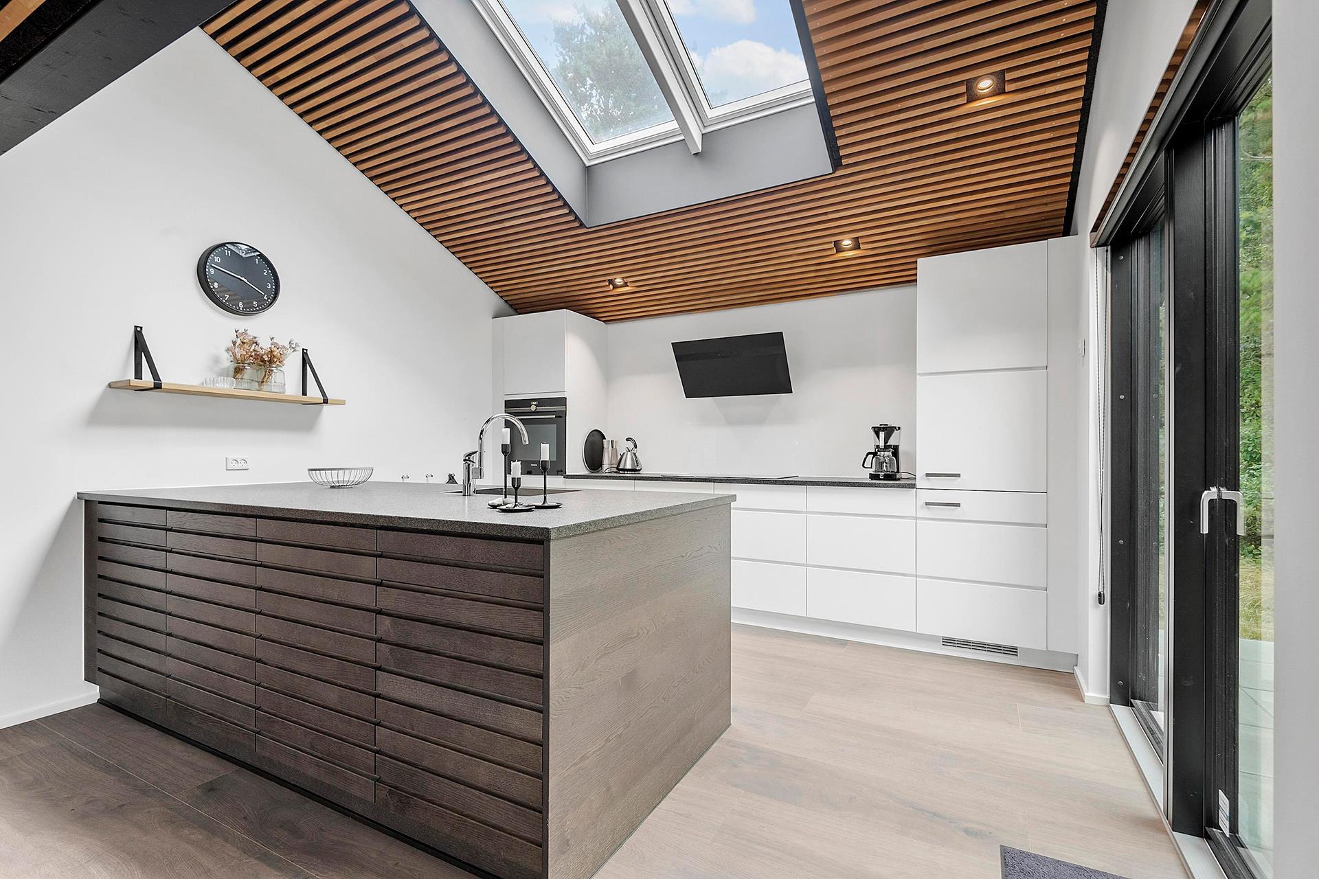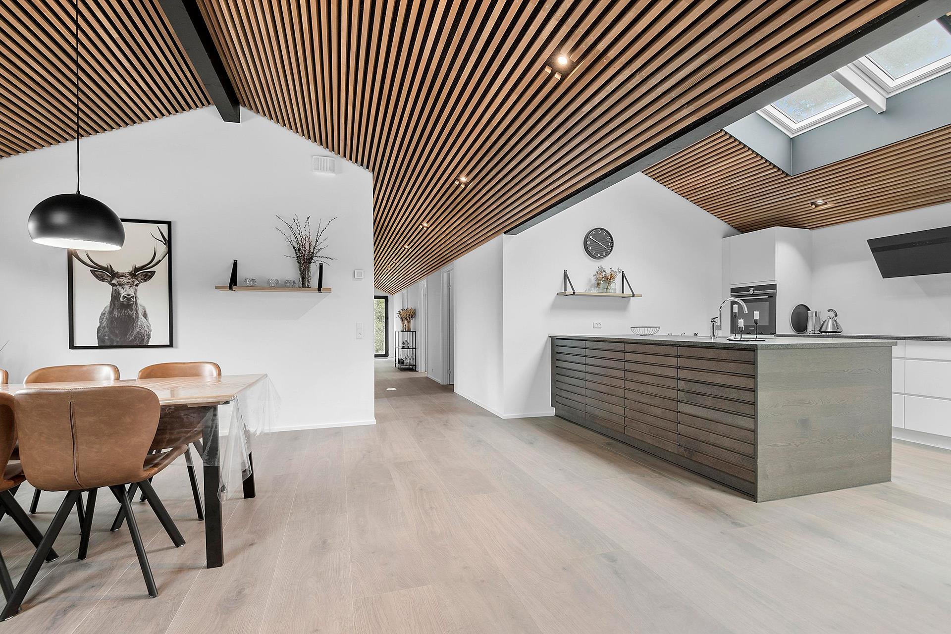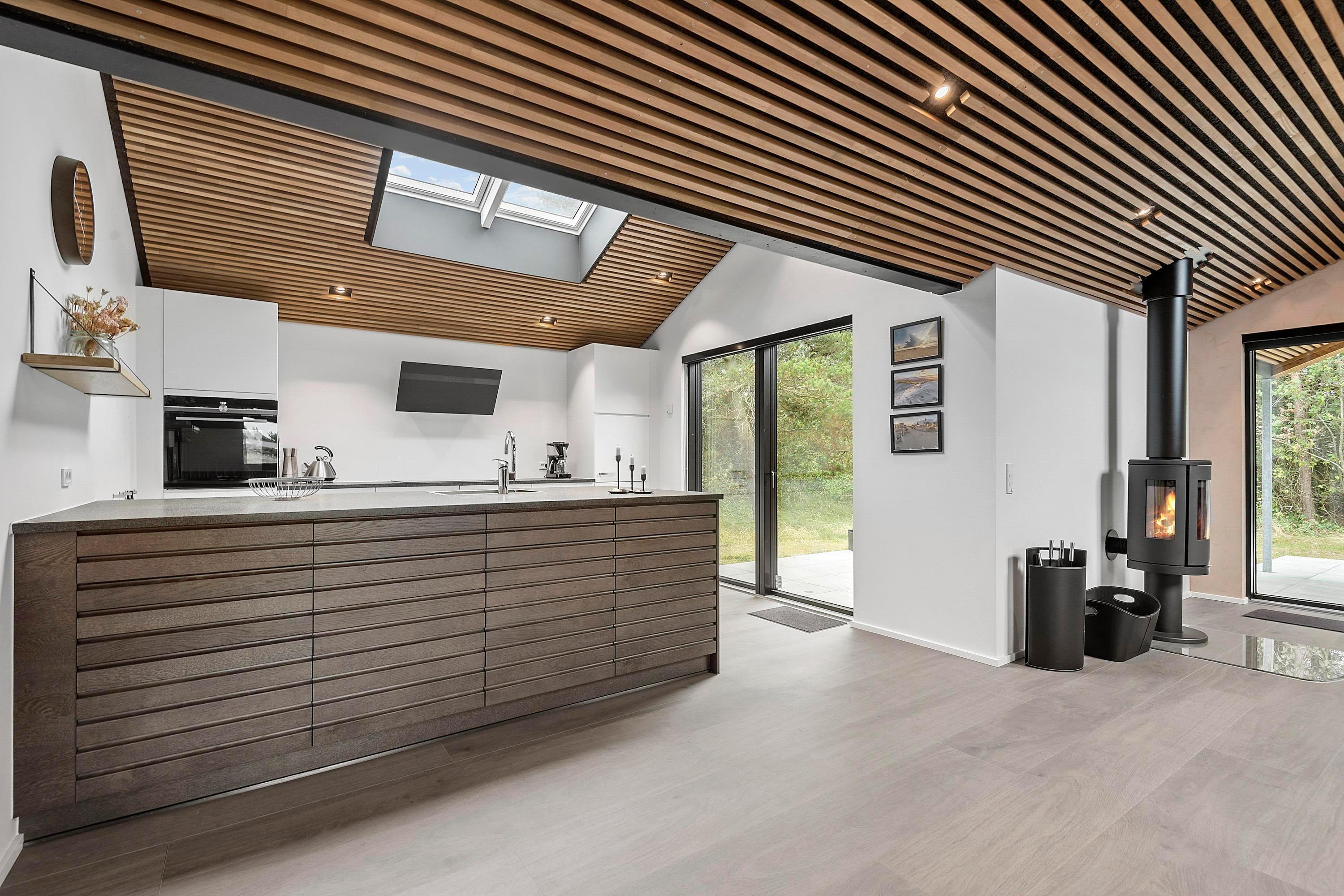 Det åbne køkken er udstyret med opvaskemaskine og gulvvarme og ligger i direkte forbindelse med den hyggelige stue. Her skaber brændeovnen en varm og indbydende stemning, mens varmepumpen sikrer et behageligt indeklima hele året.