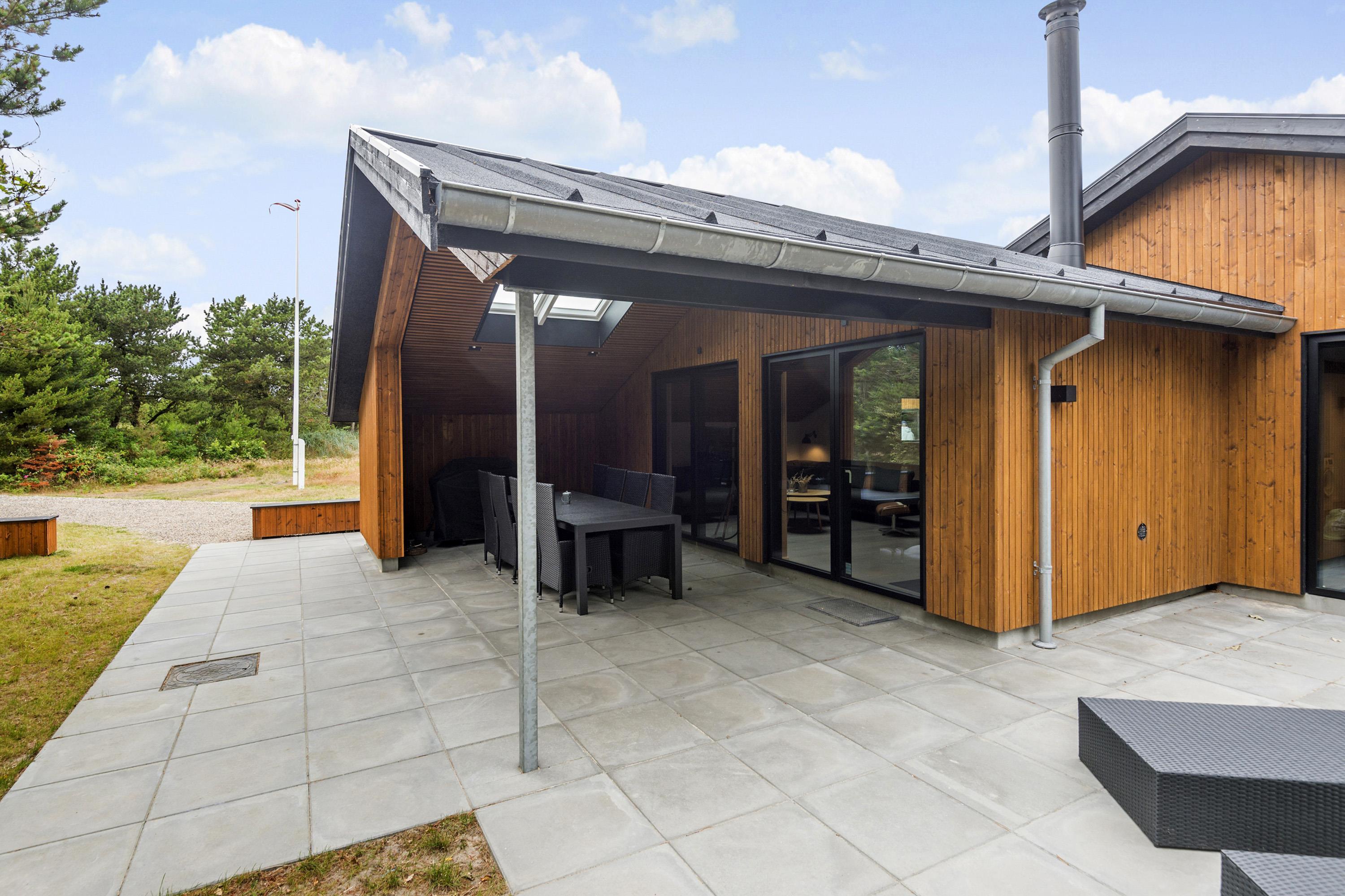 Udendørs fortsætter oplevelsen. Den overdækkede terrasse er oplagt til lange sommeraftener, morgenkaffe eller grillhygge.