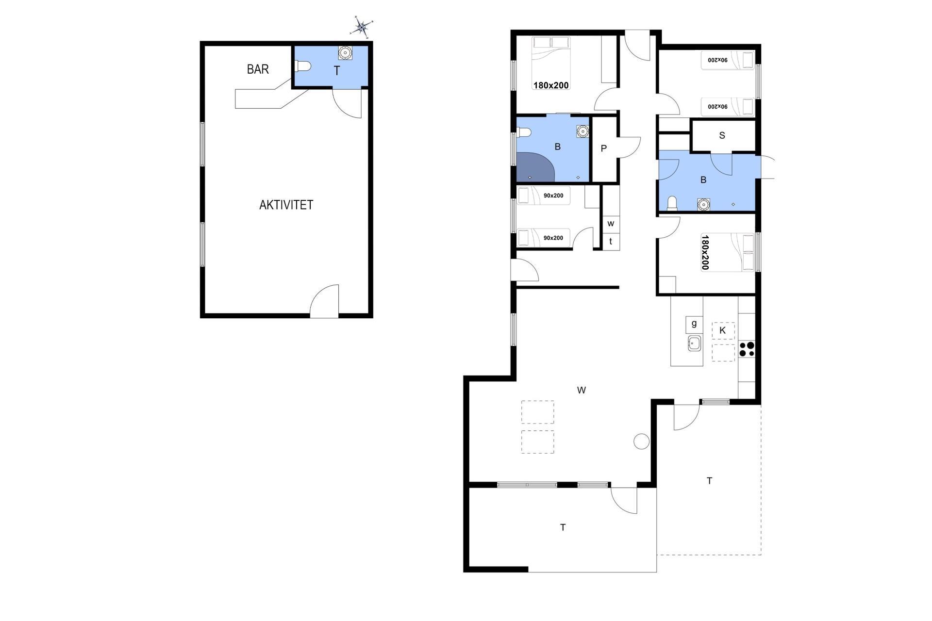 Sovepladser: 2 dobbeltsenge (180 x 200 cm) + 4 enkeltsenge (90 x 200 cm)