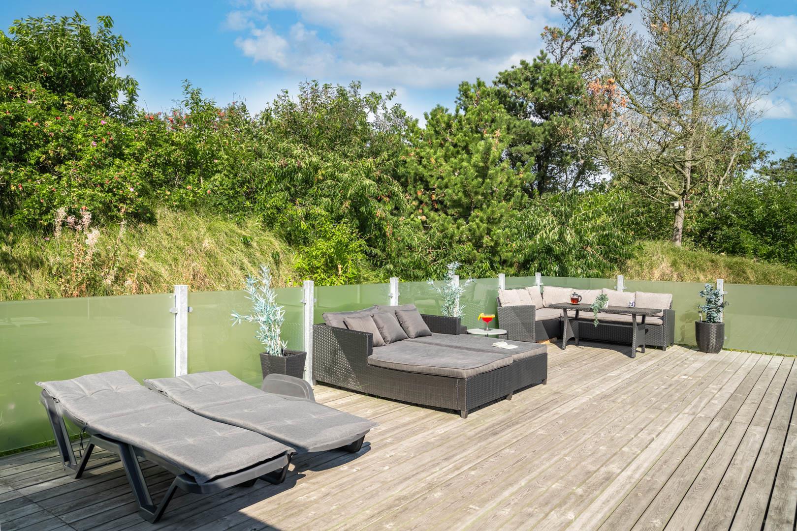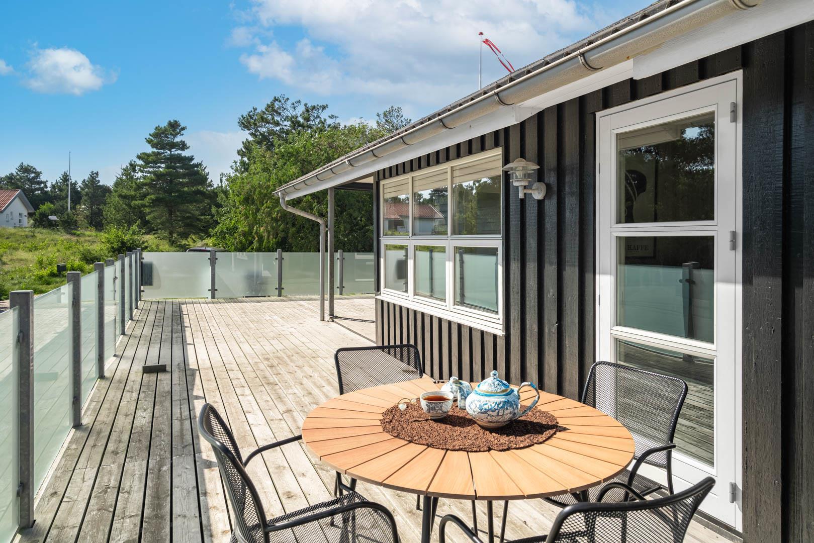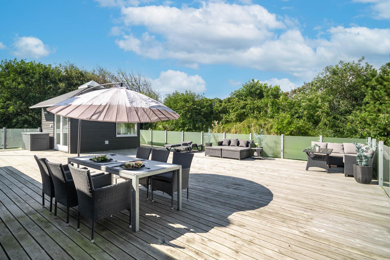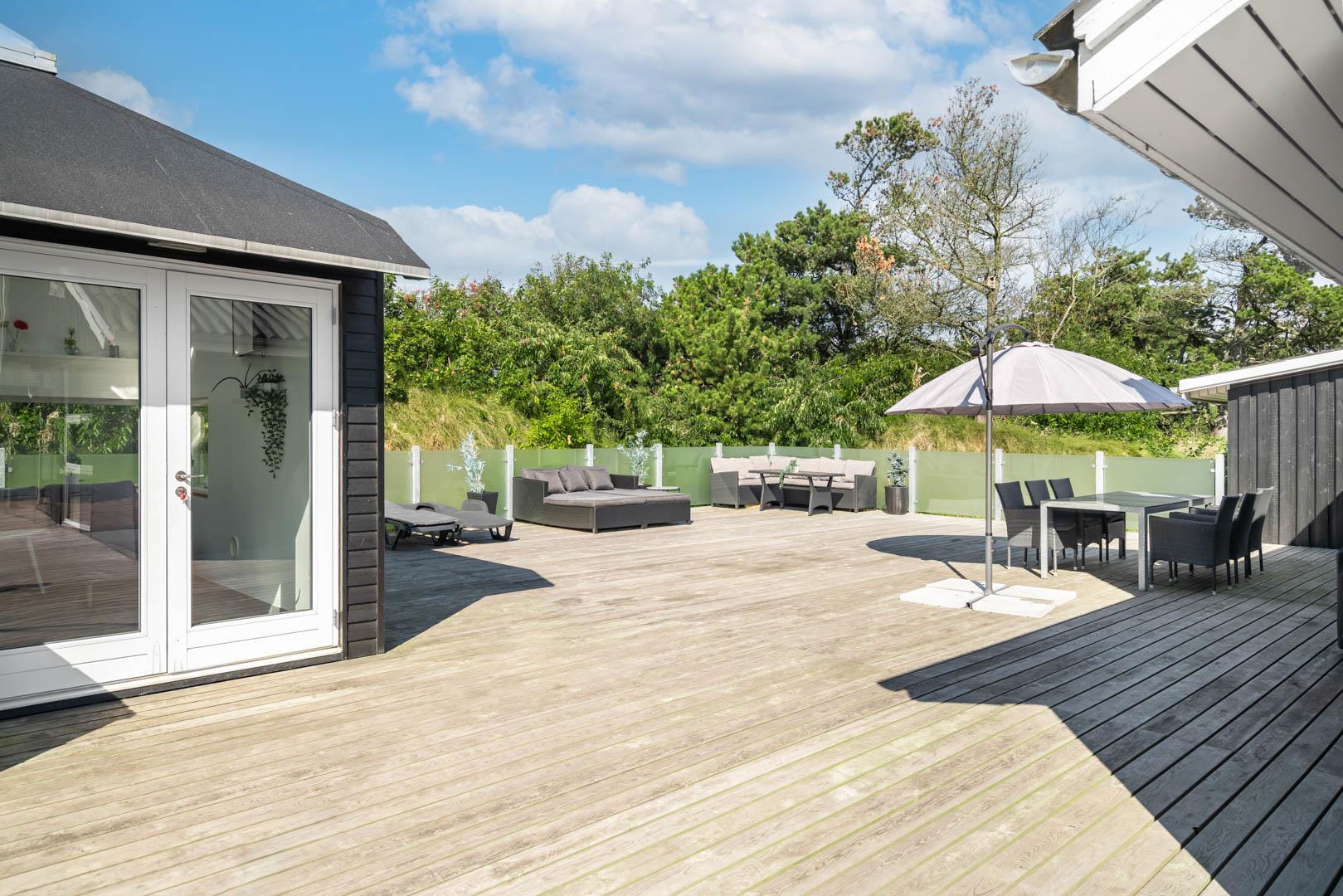 Huset er omkranset af pragtfuld, stor og helt aflukket træterrasse, her kan børnene hygge sig isandkassen.