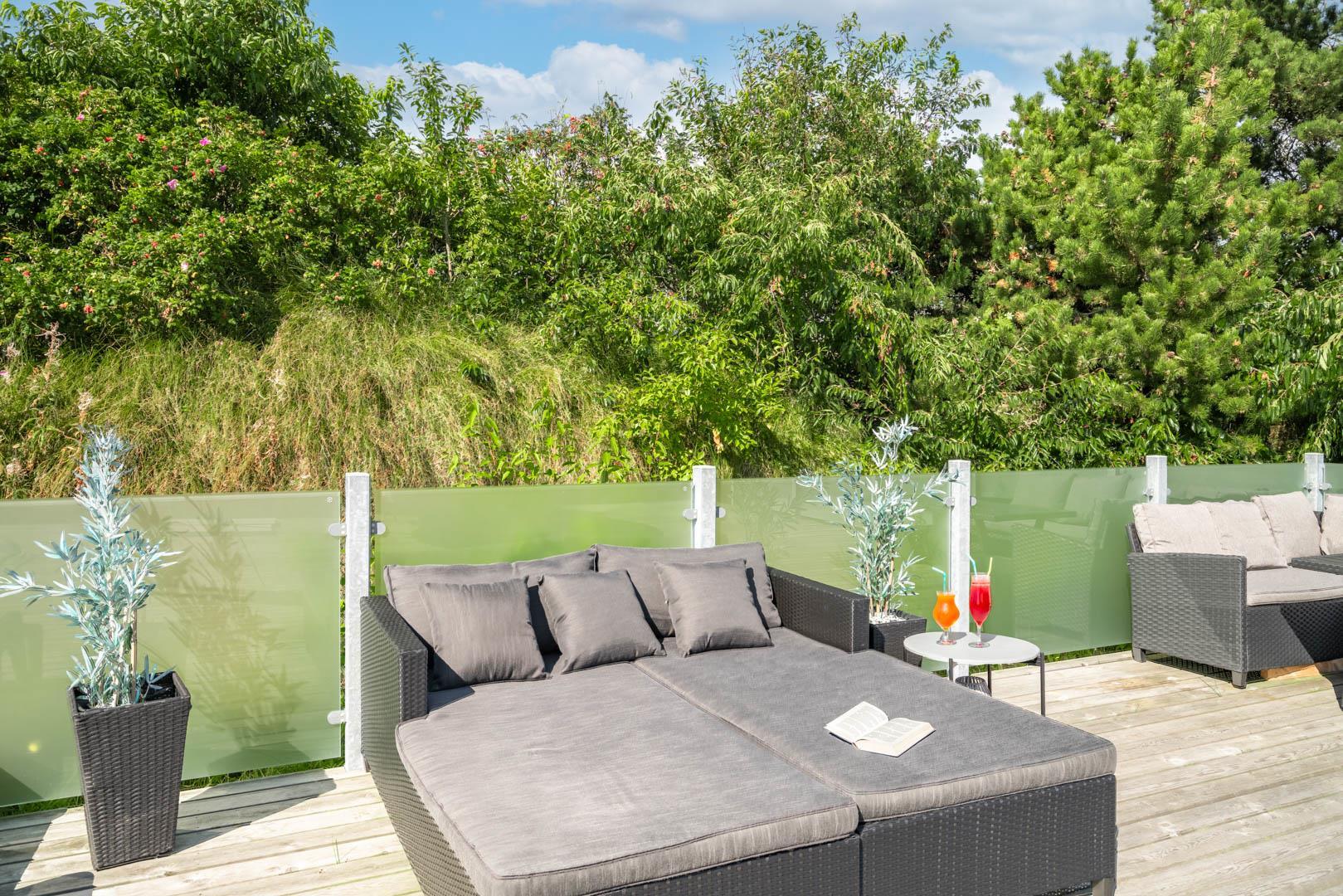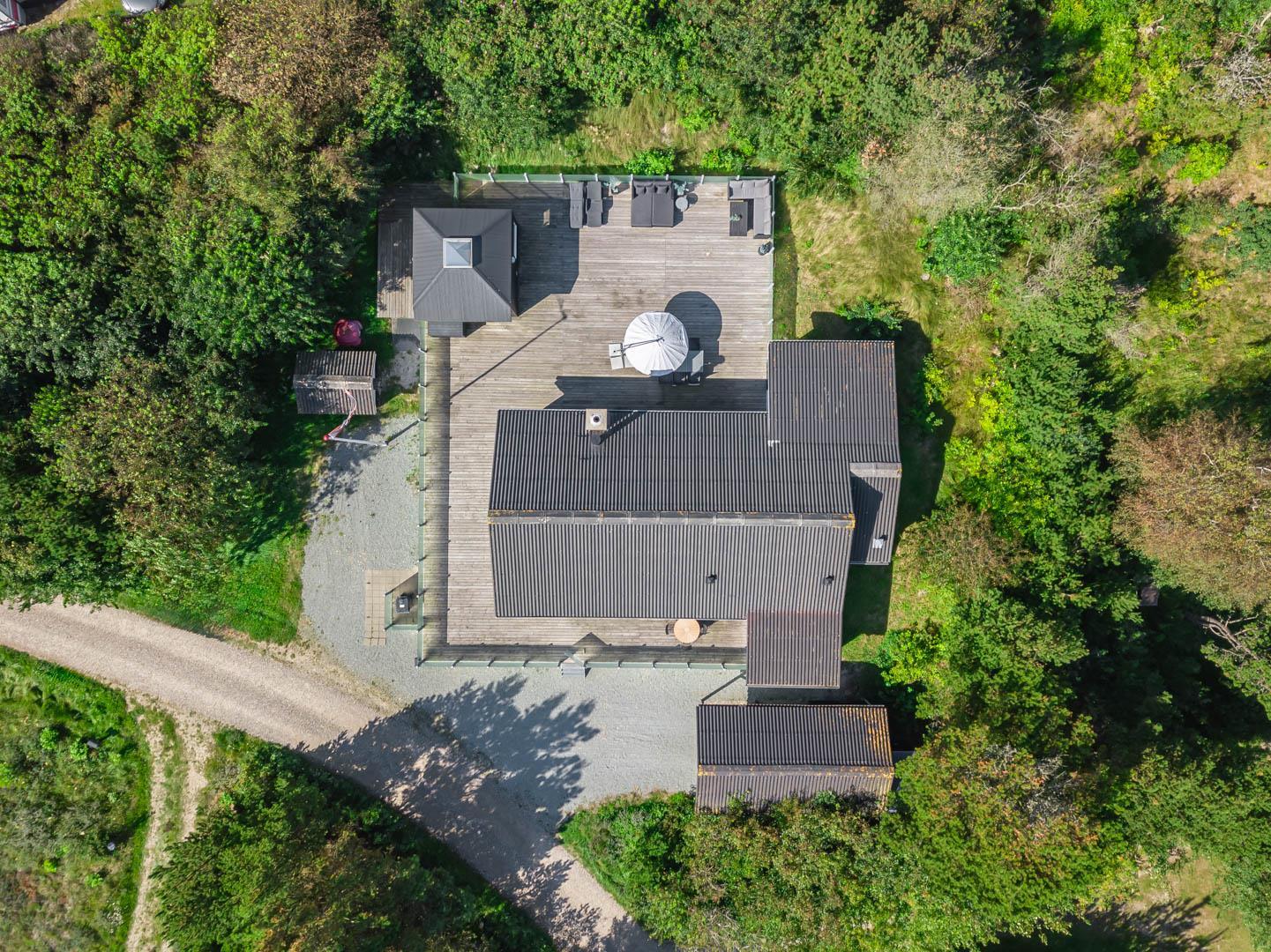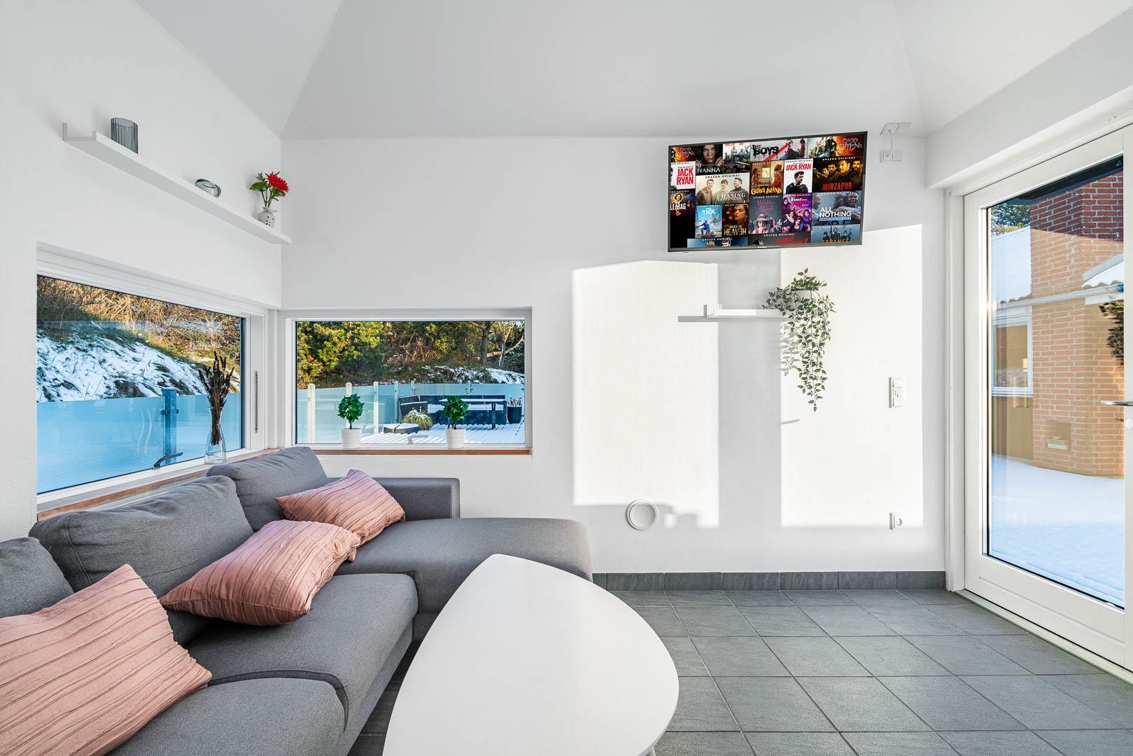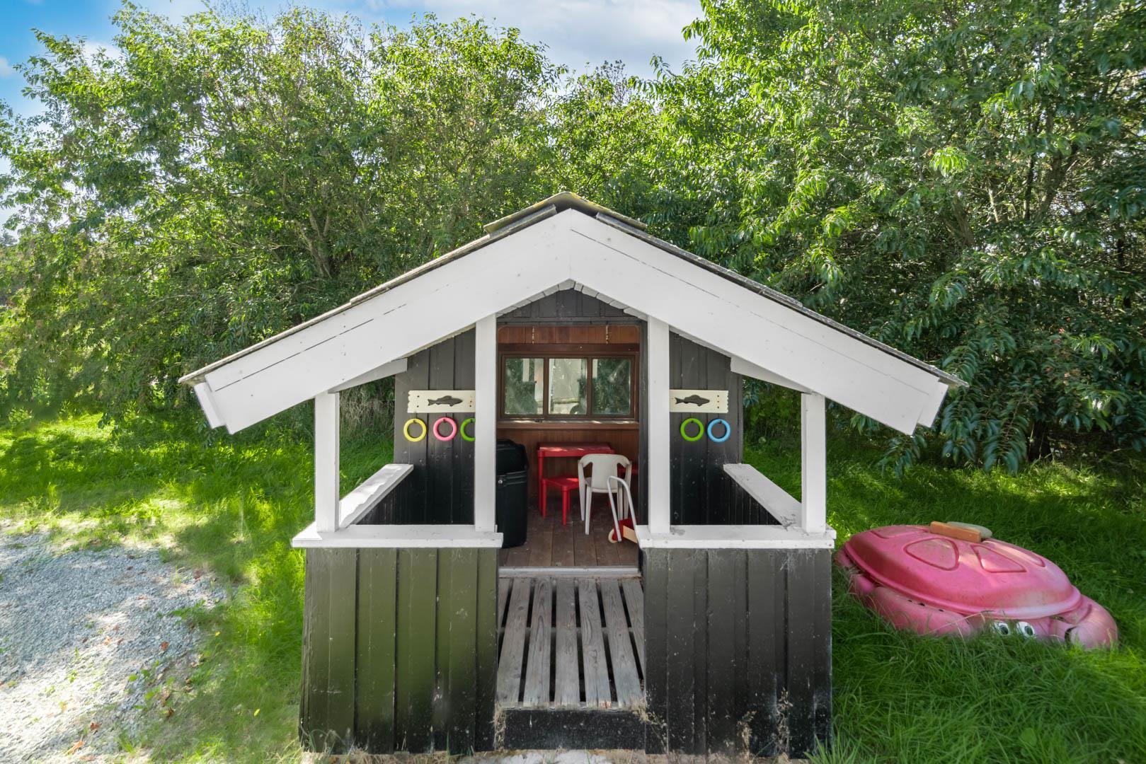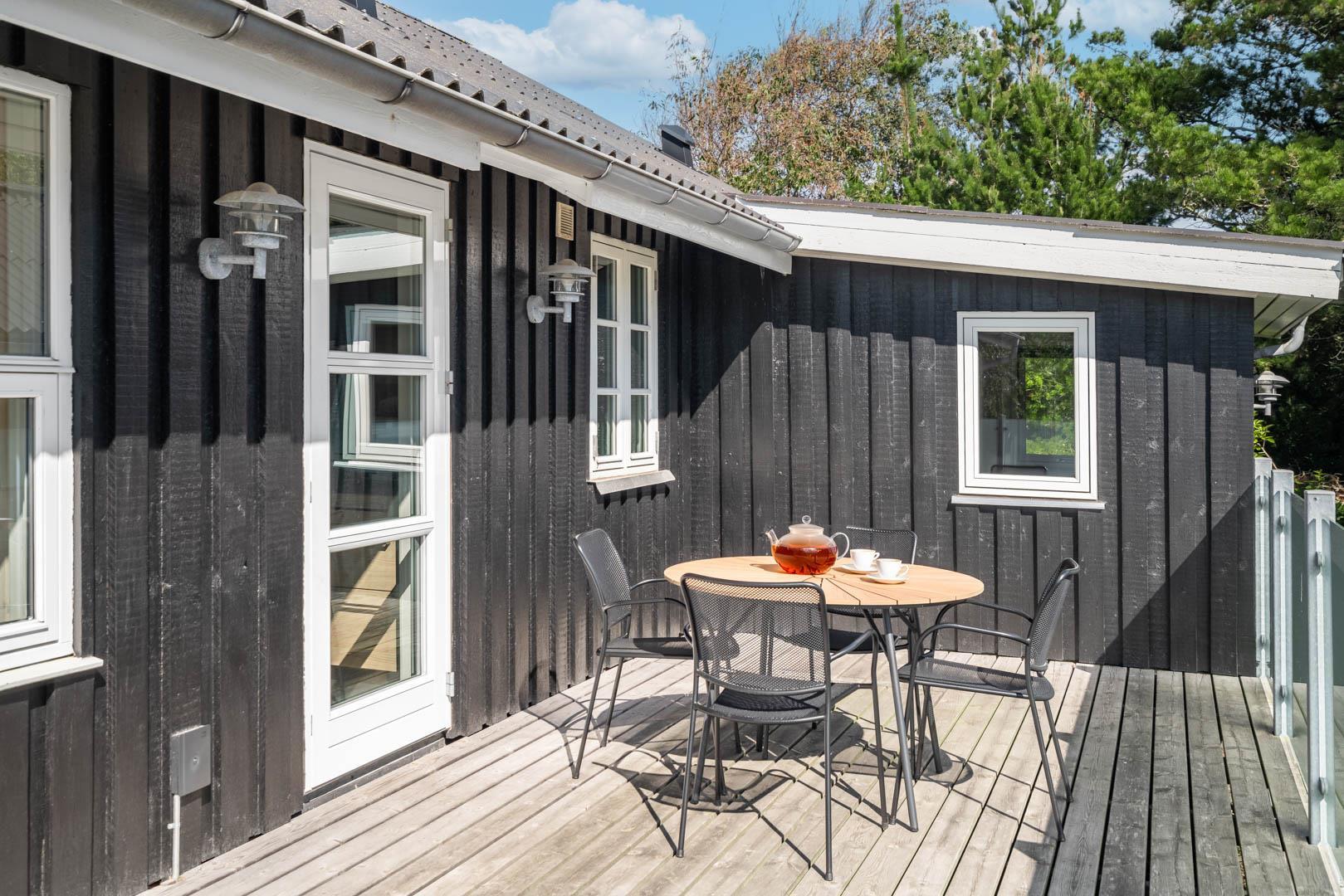 Huset er omkranset af pragtfuld, stor og helt aflukket træterrasse, her kan børnene hygge sig isandkassen.